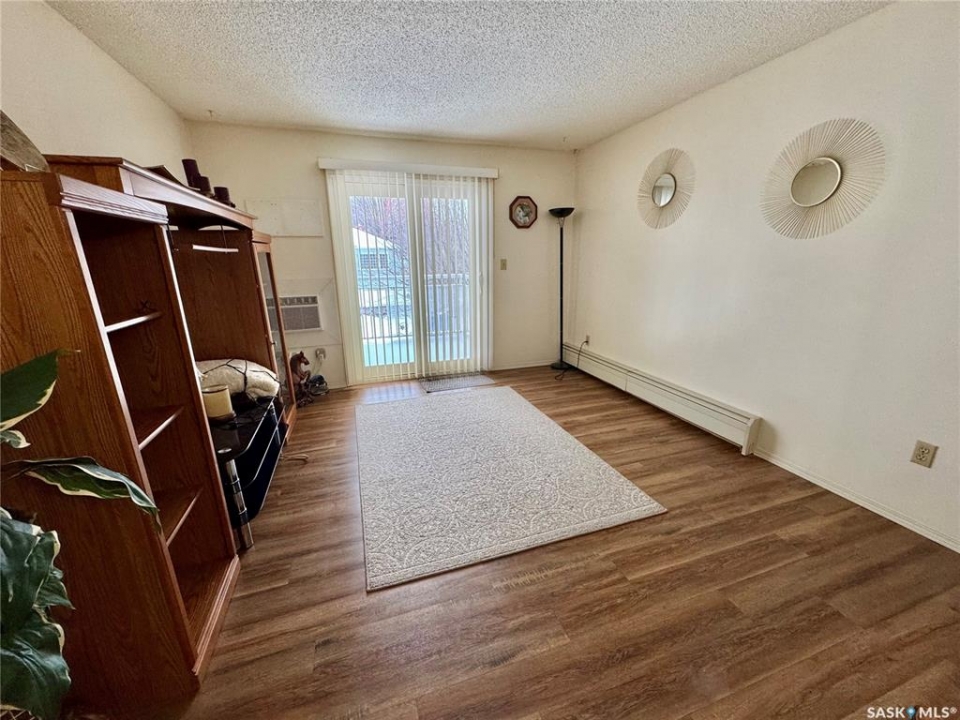 Very affordable condo with underground parking and elevator! Available for immediate possession, this 2 bedroom 1 bathroom unit provides a South facing balcony, in-unit laundry, wall mount A/C, upgraded flooring and upgraded countertops. Extra heated storage in parkade and building is wheelchair accessible.