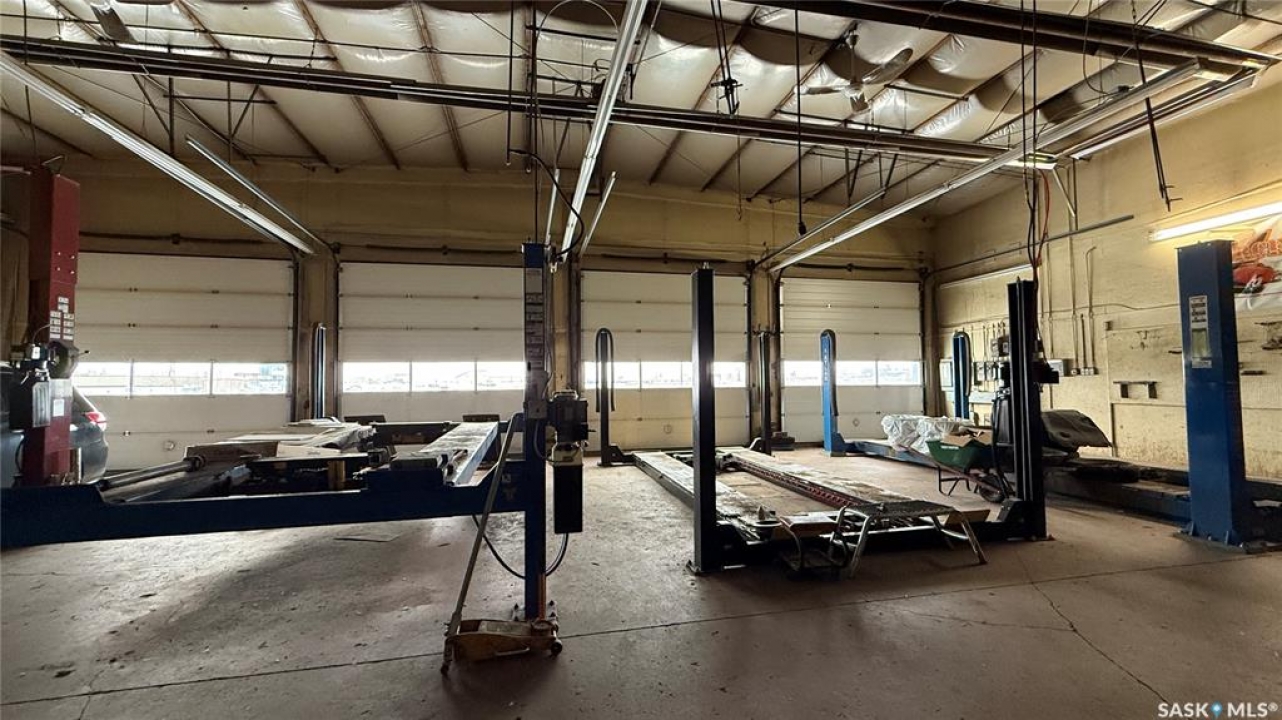 Excellent Investment Opportunity! Offering 4,716 aq. ft. of versatile commercial space. This property includes a store front and mezzanine area and a 5-bay shop. The shop is outfitted with 5 overhead doors and an array of hoists (2x14,000 lb, 2x12,000 lb, 1x10,000 lb), making it ideal for automotive or industrial use. Additional features include a security system and a storefront/office area with washroom.