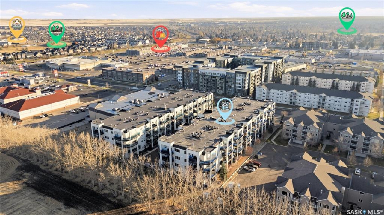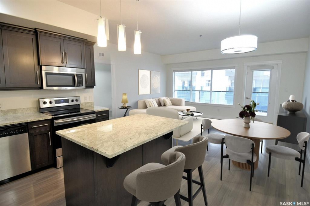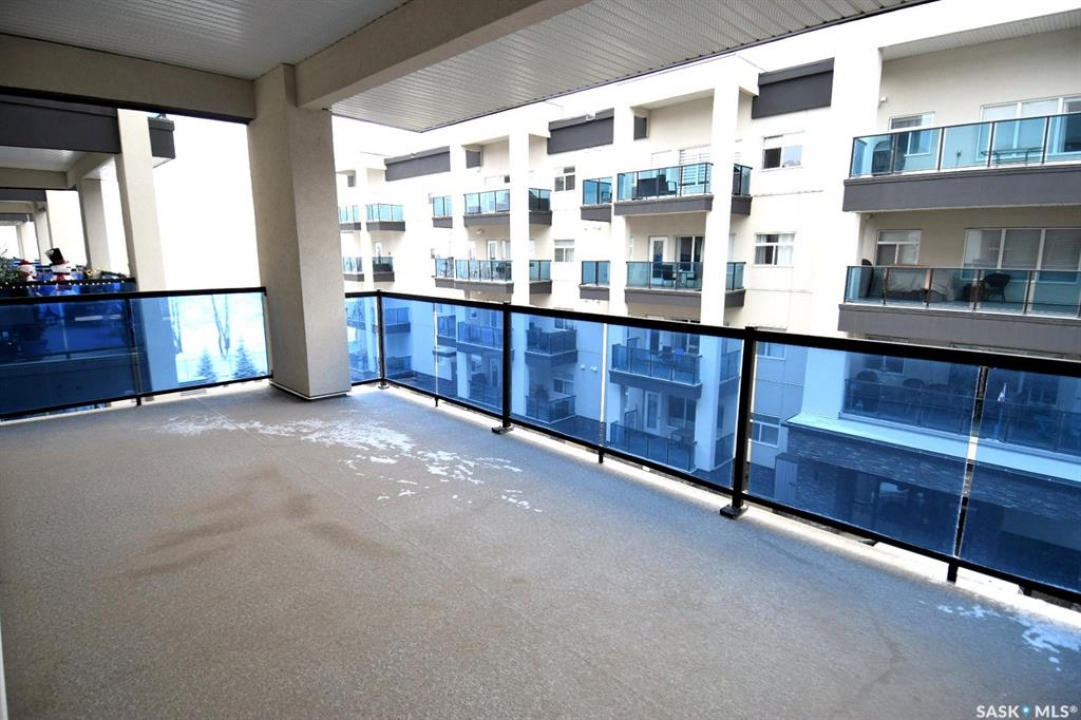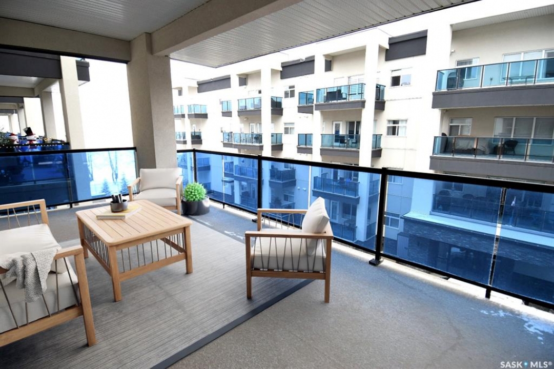 Welcome to sophisticated, hassle-free living in one of Saskatoon's most desirable locations. This super-clean third-floor suite offers an unparalleled combination of space, style, and essential convenience in the highly coveted University Heights area. Here you can embrace true walkability; leave the car behind as groceries, restaurants, coffee shops, banks, medical, library, & transit are all just a short stroll away. Experience urban convenience without sacrificing comfort. Step inside this elegant suite where soaring 9-foot ceilings & windows immediately create a bright, spacious atmosphere. The thoughtful, open-concept design allows the kitchen, dining, & living areas to flow seamlessly together, all enhanced by fresh, designer paint. The kitchen features a full suite of modern S/S appliances, a functional island with breakfast bar, & beautiful modern light-colored granite countertops here & in both baths. Easy to clean luxury is further provided by gleaming laminate floors through the main area. The spacious primary suite easily accommodates large furniture & boasts 3 closets leading to a private 3-piece ensuite, complete with 5ft walk-in shower & glass doors. A full main bath with a deep bathtub, services the 2nd bedroom & guests. One of the most impressive features is the expansive outdoor space: a French patio door opens to a private covered terrace; a truly massive 200 sq ft space ready to be furnished & enjoyed. This impressive building is designed for year-round comfort and convenience, featuring an exclusive, private heated parking stall to keep your vehicle safe & warm. Owners appreciate the dedicated car wash bay. Wash your car then let it dry in your heated parking spot. Aqua Terra includes a well-equipped exercise room, workshop, a community meeting space, private storage, & ample visitor and street parking. Combining premium features, amenities, & genuine value, this executive condo truly checks every box for comfort, convenience, and lifestyle.