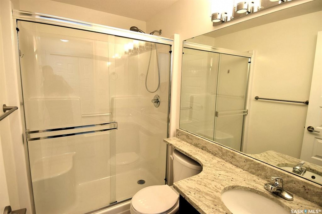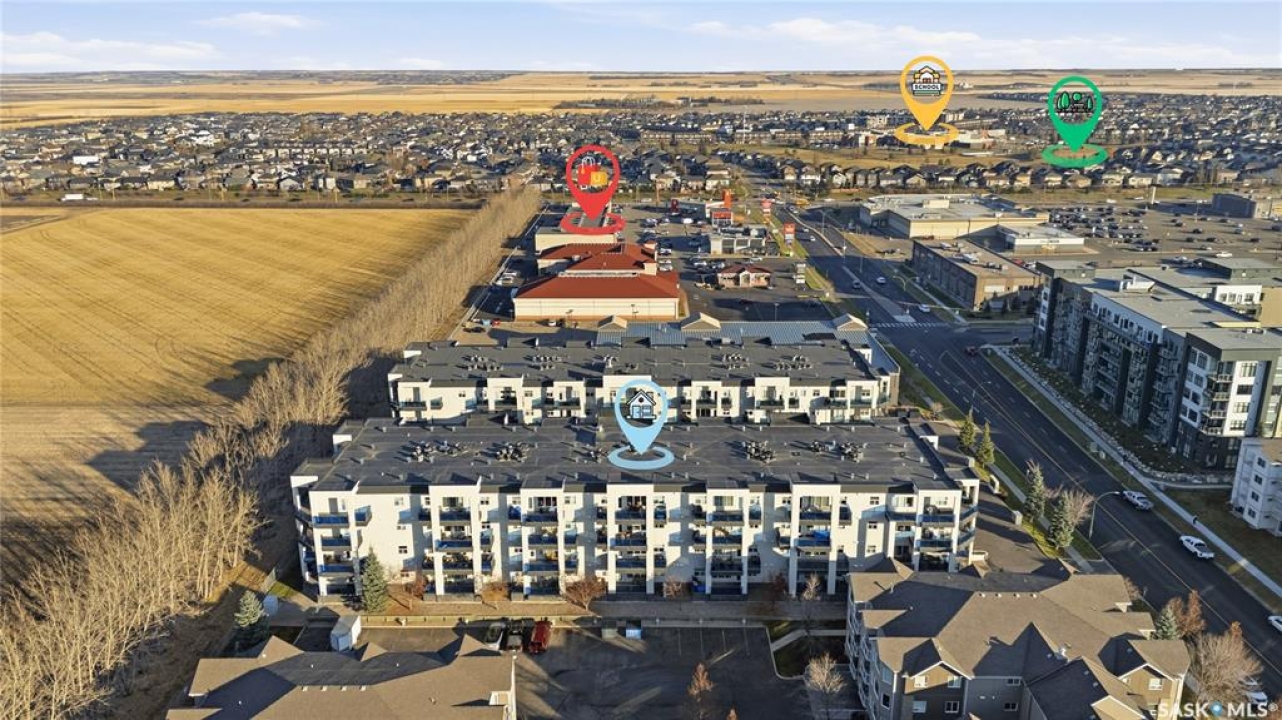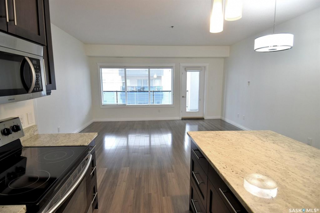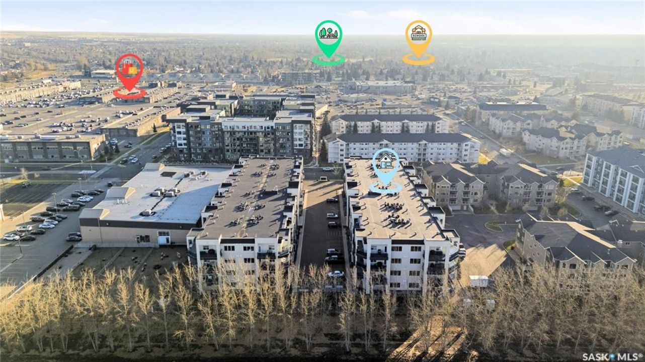Welcome to sophisticated, hassle-free living in one of Saskatoon's most desirable locations. This super-clean third-floor suite offers an unparalleled combination of space, style, and essential convenience in the highly coveted University Heights area. Here you can embrace true walkability; leave the car behind as groceries, restaurants, coffee shops, banks, medical, library, & transit are all just a short stroll away. Experience urban convenience without sacrificing comfort. Step inside this elegant suite where soaring 9-foot ceilings & windows immediately create a bright, spacious atmosphere. The thoughtful, open-concept design allows the kitchen, dining, & living areas to flow seamlessly together, all enhanced by fresh, designer paint. The kitchen features a full suite of modern S/S appliances, a functional island with breakfast bar, & beautiful modern light-colored granite countertops here & in both baths. Easy to clean luxury is further provided by gleaming laminate floors through the main area. The spacious primary suite easily accommodates large furniture & boasts 3 closets leading to a private 3-piece ensuite, complete with 5ft walk-in shower & glass doors. A full main bath with a deep bathtub, services the 2nd bedroom & guests. One of the most impressive features is the expansive outdoor space: a French patio door opens to a private covered terrace; a truly massive 200 sq ft space ready to be furnished & enjoyed. This impressive building is designed for year-round comfort and convenience, featuring an exclusive, private heated parking stall to keep your vehicle safe & warm. Owners appreciate the dedicated car wash bay. Wash your car then let it dry in your heated parking spot. Aqua Terra includes a well-equipped exercise room, workshop, a community meeting space, private storage, & ample visitor and street parking. Combining premium features, amenities, & genuine value, this executive condo truly checks every box for comfort, convenience, and lifestyle.