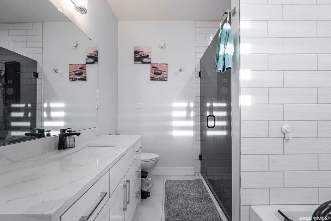 A must see! This custom-built bi-level in Rosewood, offers a legal two-bedroom basement suite and a thoughtfully designed layout throughout. The main floor features grand 10-foot ceilings and tile flooring, creating a bright and upscale feel. The spacious living room is accompanied by a sleek electric fireplace, while the dining area leads to a huge covered deck finished with artificial turf, perfect for outdoor enjoyment. The gorgeous kitchen showcases cabinetry that extends to the ceiling and is tucked away from the front entry thanks to a highly desirable L-shaped layout. Two generous bedrooms, main floor laundry, and a 3-piece bathroom with a large walk-in shower complete the main level. Upstairs, the private primary retreat offers large windows, a walk-in closet, and a luxurious 4-piece ensuite featuring a stand-alone jet tub, walk-in shower and heated floors. The lower level includes a cozy family room that could be used as another bedroom/family room or office, a closet and an additional 4-piece bathroom. There is convenient access to the heated oversized double garage. The legal basement suite has a separate entrance and includes a full kitchen, living room and dining room, two bedrooms, and a 4-piece bathroom—an excellent mortgage helper or investment opportunity. 2 furnaces, air condition and window coverings are all part of this exceptional home. Outside, enjoy a fully fenced and landscaped yard. Ideally located in Rosewood, just minutes from schools, parks, and all amenities. This home offers luxury, functionality, and income potential in one exceptional package.