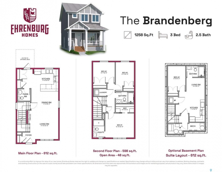 Welcome to "The Brandenberg" your future home—an impressive 1,258 sq ft single family home built by Ehrenburg Homes, located in the heart of Regina's hottest neighborhood, Eastbrook! Step inside and be wowed by the bright, open-concept main floor that was made for modern living. The spacious living room flows effortlessly into a dream kitchen featuring tons of counter space and cabinetry—perfect for whipping up your favorite meals or hosting friends for dinner. The dining area adjoins the kitchen, making it the go-to spot for everything from family dinners to weekend brunches. Plus, there's a stylish 2-piece bath for added convenience. Upstairs, you'll find three generously sized bedrooms and two full bathrooms—ideal for families, roommates, or anyone who loves extra space. The primary suite is your private retreat, complete with a sleek 3-piece ensuite and walk in closet, plenty of room to unwind. The additional bedrooms are perfect for kids, guests, or that home office you've been dreaming of. Need more space? Double detached garage for additional storage, the basement is wide open and ready for your vision—think home gym, rec room, or extra bedroom! Located in a vibrant, family-friendly community surrounded by parks, paths, schools, and local amenities, this is your chance to own a brand-new home in one of Regina's most exciting developments. Don't wait—Eastbrook is calling! (PST/GST are included within purchase price). Note: Interior photos are from a previous build. Same model but some colours may vary. Underground sprinklers in front ONLY.