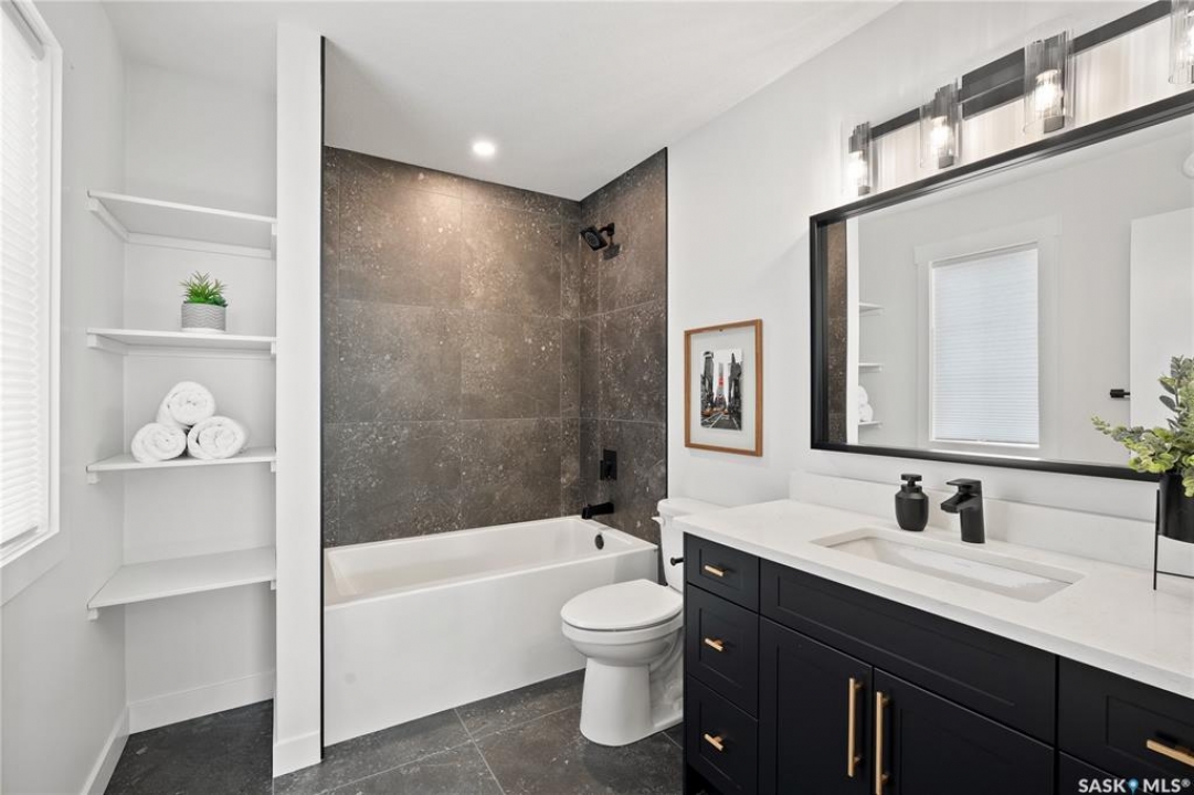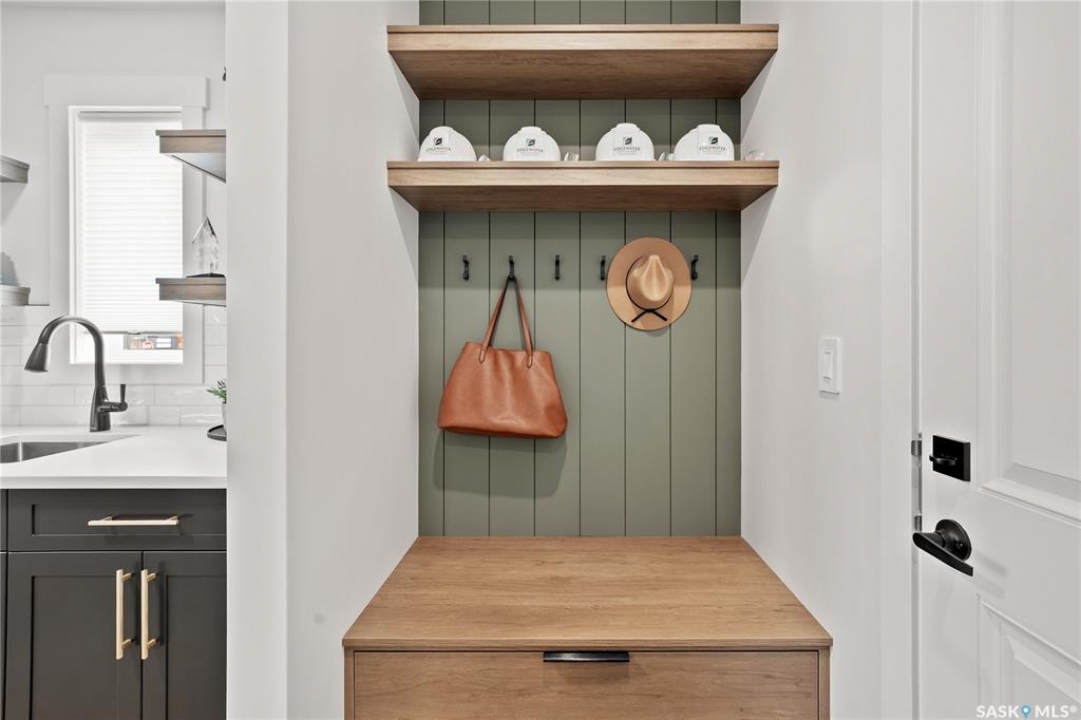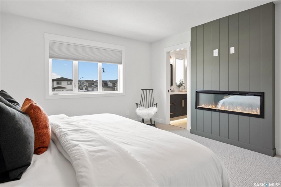 "The Queens", a 2088 square foot home, Entering the home from the oversized fully insulated garage, you step into the mudroom which is conveniently attached to the walk through pantry with lower cabinets and separate sink. The kitchen features an oversize island with eating ledge, gorgeous backsplash and gleaming quartz countertops. The great room features large windows, and oversize patio doors for an abundance of light. The fireplace is a stunning focal point in the room. The addition of the office/flex area adjacent to the front entrance is a perfect work from home space. Upstairs, the primary bedroom is spacious. The ensuite has an 8' vanity with double sinks with a generous amount of drawers for storage, a 5' custom tiled shower and stand alone tub, and a private water closet. From there, you enter directly into the walk through closet with lots of double rods and shelving for your wardrobe. Exiting the closet, you pass directly into the laundry room equipped with lower cabinets and quartz countertop and sink for easy laundry tasks. 2 additional bedrooms, a 4 piece bath and a central bonus/flex area finish this floor. All Pictures may not be exact representations of the home, to be used for reference purposes only. Errors and omissions excluded. Prices, plans, specifications subject to change without notice. All Edgewater homes are covered under the Saskatchewan New Home Warranty program. PST & GST included with rebate to builder