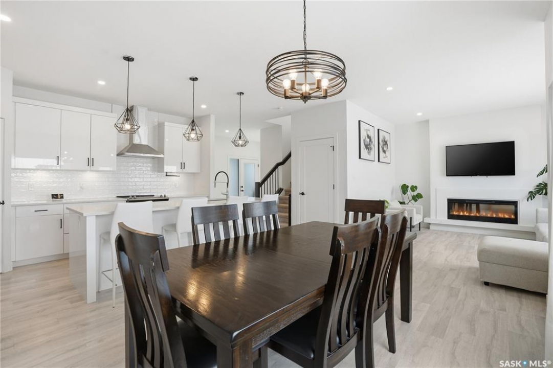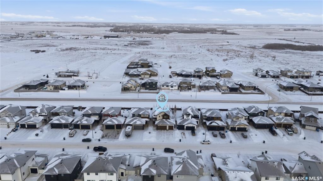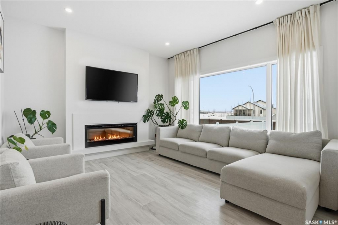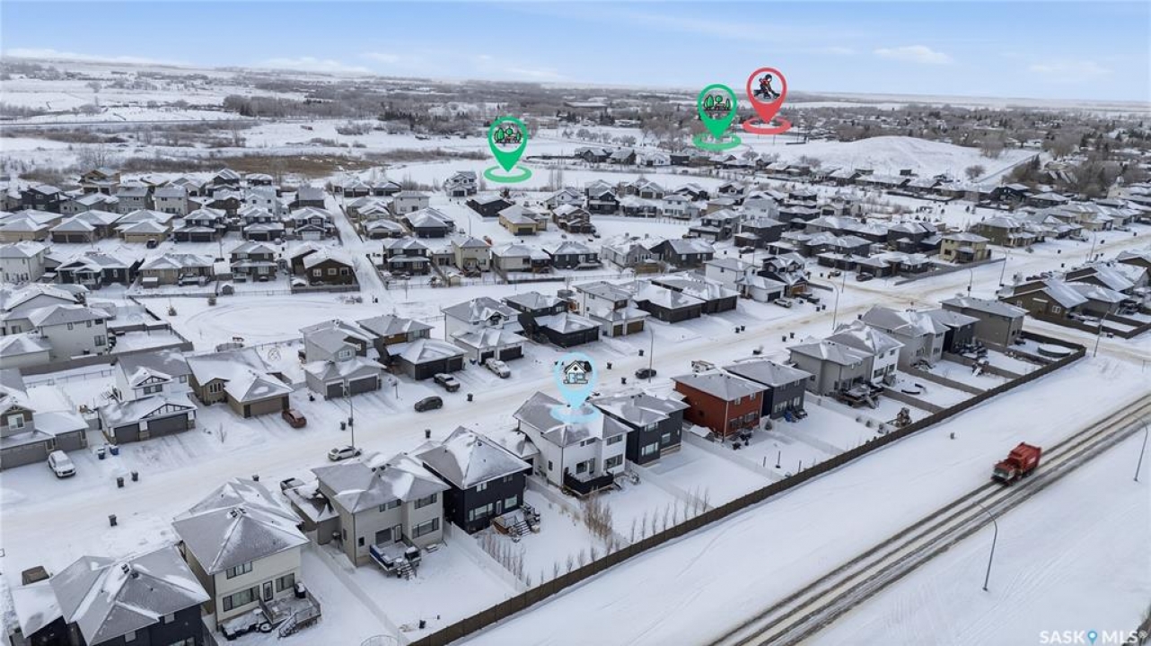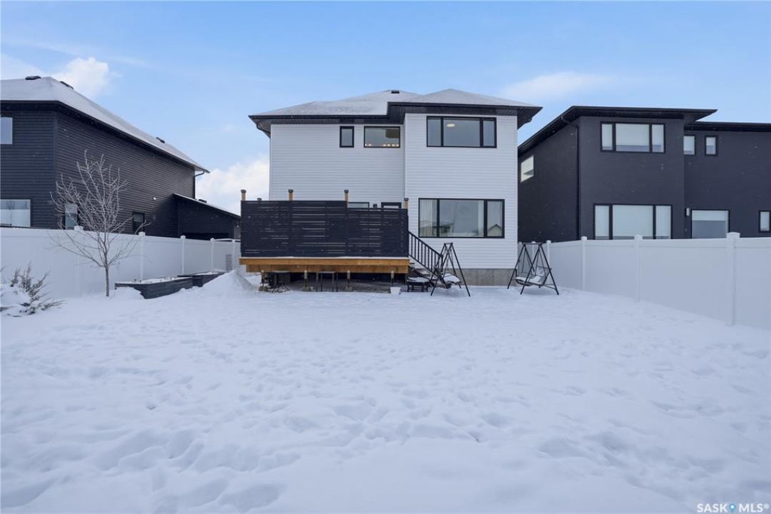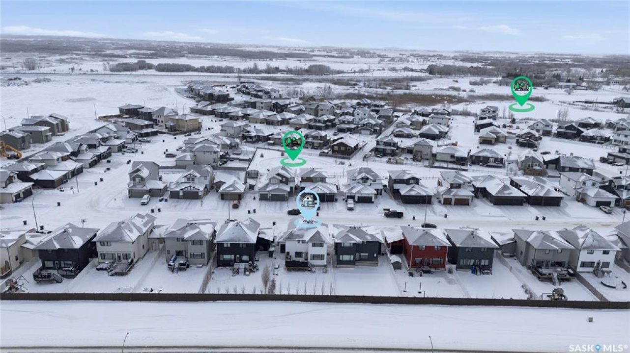 Feeling the pull to escape the city—without giving up convenience? Welcome to Pilot Butte, just under a 10-minute drive from Regina, where you'll enjoy lower property taxes, a relaxed pace of life, and a true sense of community. This thoughtfully designed two-storey home is ideal for a growing family, offering generous space for both everyday living and life's extras. The main floor features 9-foot ceilings and crisp, modern finishes throughout. The kitchen shines with glossy white soft-close cabinetry, quartz countertops, and a stylish tile backsplash. A large island invites gathering—whether it's after-school snacks or weekend cookie baking. The dining area sits just off the kitchen with easy access to the rear deck, while the living room is warmed by a sleek electric fireplace. A convenient two-piece powder room completes this level. Upstairs, you'll find three bedrooms and two full bathrooms. The primary suite is a relaxing retreat with a five-piece ensuite and walk-in closet. A bonus room separates the second and third bedrooms and is perfectly suited for movie nights, a games room, or a play space. Laundry is also conveniently located on this floor. The basement is open for future development, with roughed-in plumbing for a bathroom and two large windows ready to bring in natural light. The triple attached garage is a standout feature, complete with a floor drain and an overhead door providing direct access to the backyard. Outside, the fully fenced and landscaped yard includes irrigation and a deck with privacy screens—perfect for peaceful summer grilling. Located close to parks, walking paths, and ATV trails, this home offers an active, family-friendly lifestyle. A perfect blend of comfort, space, and small-town charm—just minutes from the city.