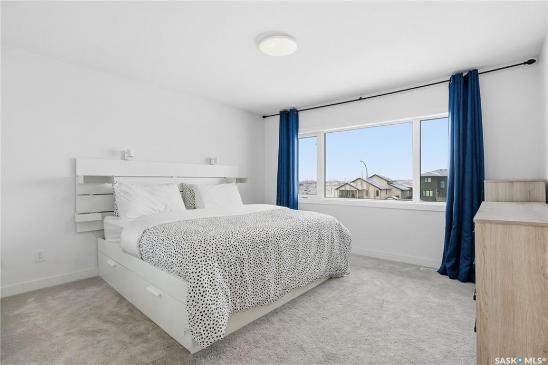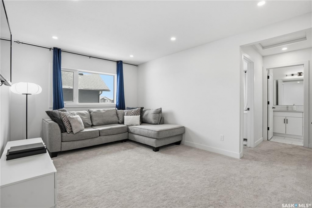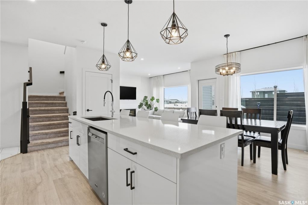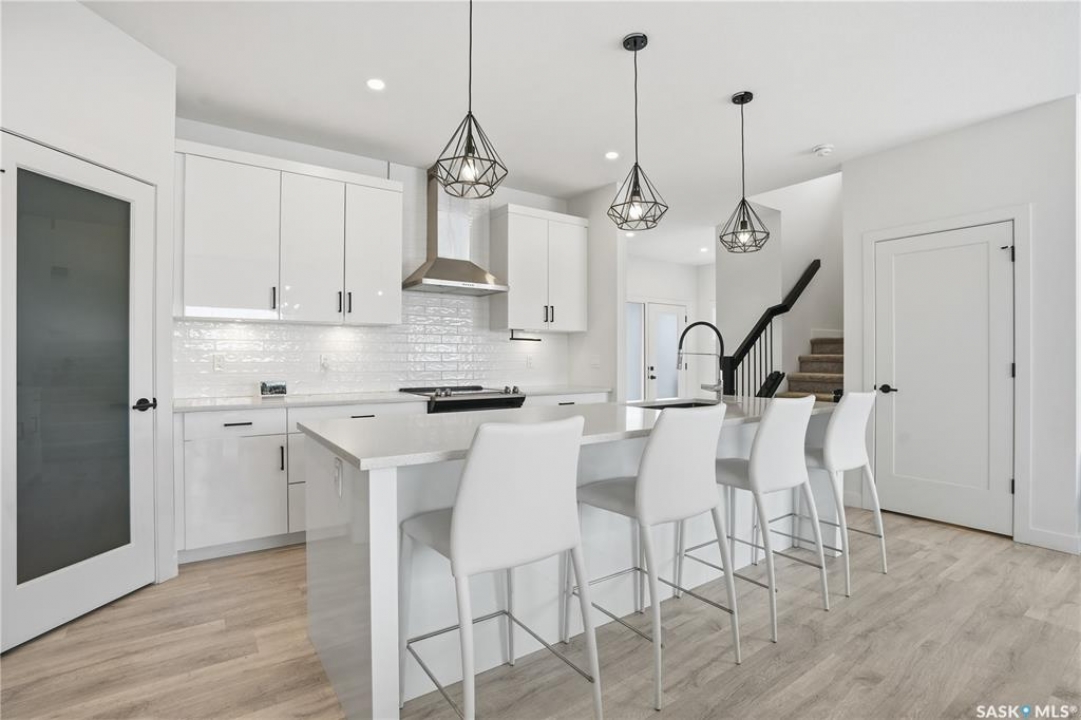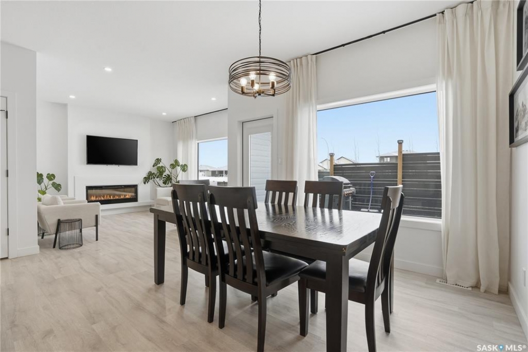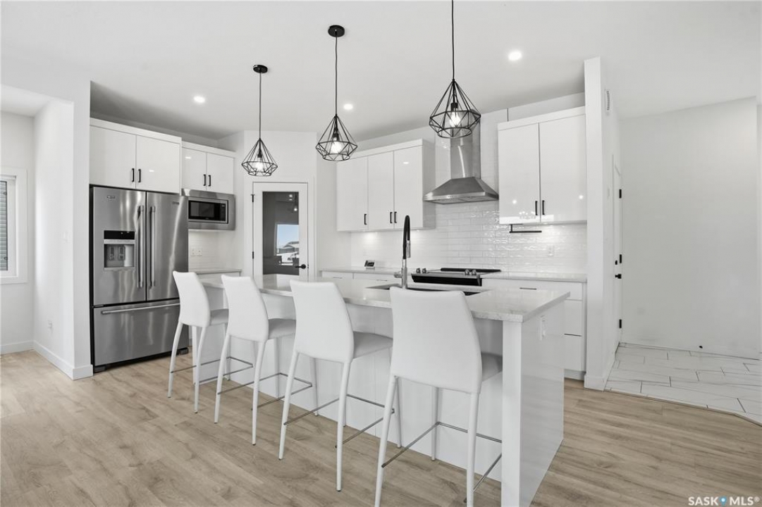 Feeling the pull to escape the city—without giving up convenience? Welcome to Pilot Butte, just under a 10-minute drive from Regina, where you'll enjoy lower property taxes, a relaxed pace of life, and a true sense of community. This thoughtfully designed two-storey home is ideal for a growing family, offering generous space for both everyday living and life's extras. The main floor features 9-foot ceilings and crisp, modern finishes throughout. The kitchen shines with glossy white soft-close cabinetry, quartz countertops, and a stylish tile backsplash. A large island invites gathering—whether it's after-school snacks or weekend cookie baking. The dining area sits just off the kitchen with easy access to the rear deck, while the living room is warmed by a sleek electric fireplace. A convenient two-piece powder room completes this level. Upstairs, you'll find three bedrooms and two full bathrooms. The primary suite is a relaxing retreat with a five-piece ensuite and walk-in closet. A bonus room separates the second and third bedrooms and is perfectly suited for movie nights, a games room, or a play space. Laundry is also conveniently located on this floor. The basement is open for future development, with roughed-in plumbing for a bathroom and two large windows ready to bring in natural light. The triple attached garage is a standout feature, complete with a floor drain and an overhead door providing direct access to the backyard. Outside, the fully fenced and landscaped yard includes irrigation and a deck with privacy screens—perfect for peaceful summer grilling. Located close to parks, walking paths, and ATV trails, this home offers an active, family-friendly lifestyle. A perfect blend of comfort, space, and small-town charm—just minutes from the city.