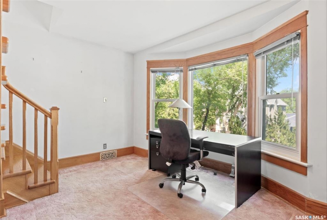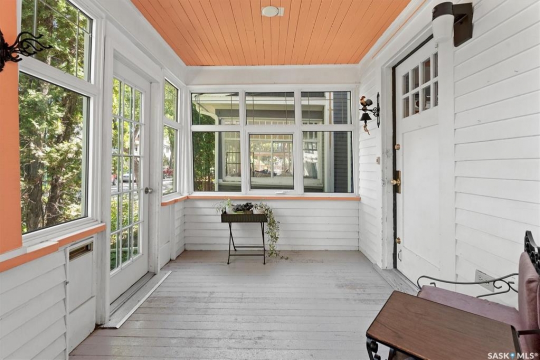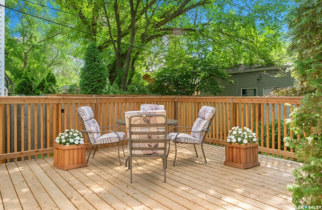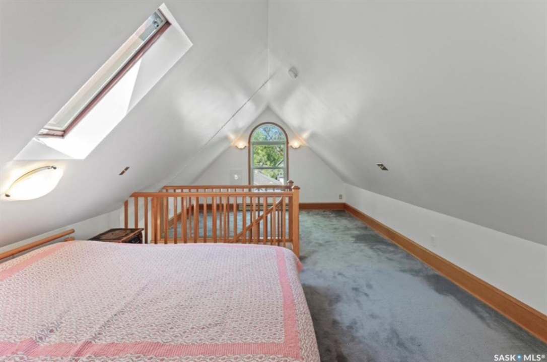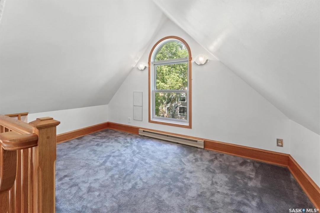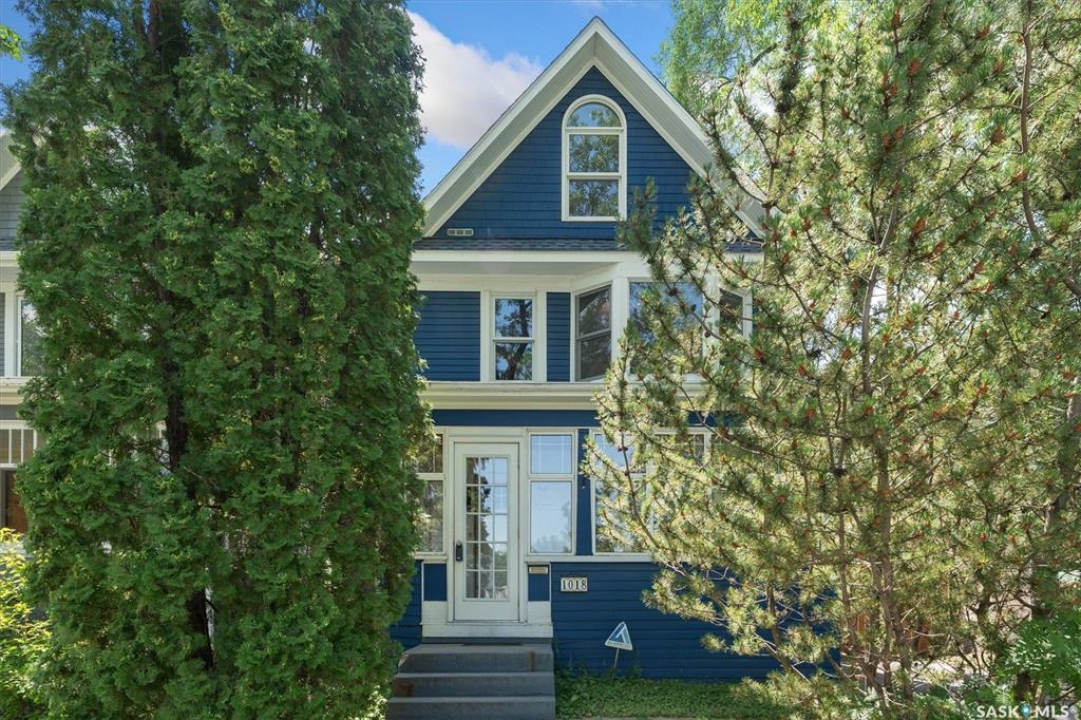 1018 Aird Street – 1912 Character Three-Story in a Storybook Setting! A character located in one of Saskatoon's coveted and walkable neighborhoods. Offering 1,850 sq ft over 3 levels, 4 bedrooms, 3 full baths, a large 37' lot, and a newer tandem detached garage. A picture-perfect front porch leads into a main floor rich in original details: hardwoods, French glass doors, woodwork, two elegant bay windows and a large dining room with a built-in glass china cabinet, plus an office / music room with an original cast fireplace. Main floor also features an oak kitchen, a full 3-piece bath, and a renovated rear porch/mudroom connecting to the backyard. Outdoor living is a highlight: unusually large, fully enclosed fenced yard (bigger than typical for the area), ideal for pets, kids, and leisure, and a sprawling double-tiered deck is perfectly suited for sunny entertaining. The front driveway adds rare, convenient parking to this property. The second level of this home offers three generously sized bedrooms, and a full bath with claw foot tub, with bay window views and a large private treetop balcony off one of the bedrooms! The entire third floor is a master retreat with a sitting area, large bedroom area, and a four-piece ensuite (shower door adjustment required). The basement is undeveloped. Notable updates include: windows, furnace, hot water heater, shingles, plumbing, asbestos removal, newer fencing, updated rear porch, piles under the front porch, shingles, and siding/shingles on the drywalled and insulated garage. This is a special home for people who love character, community, and an inner city neighbourhood - offering the historic charm you dream of, with practical upgrades.