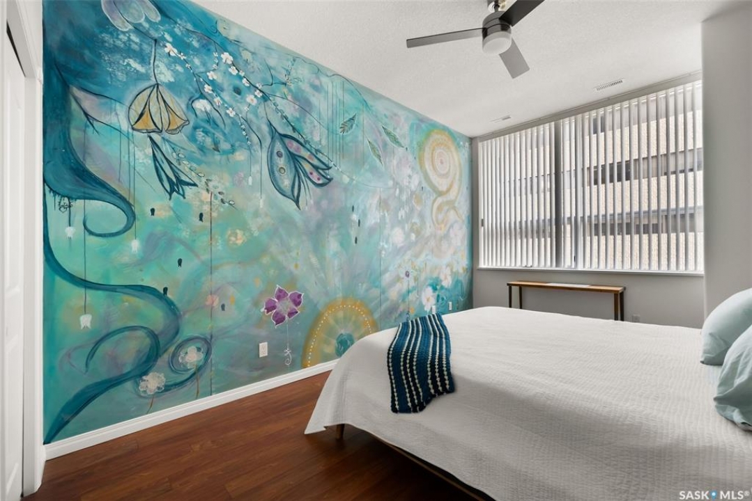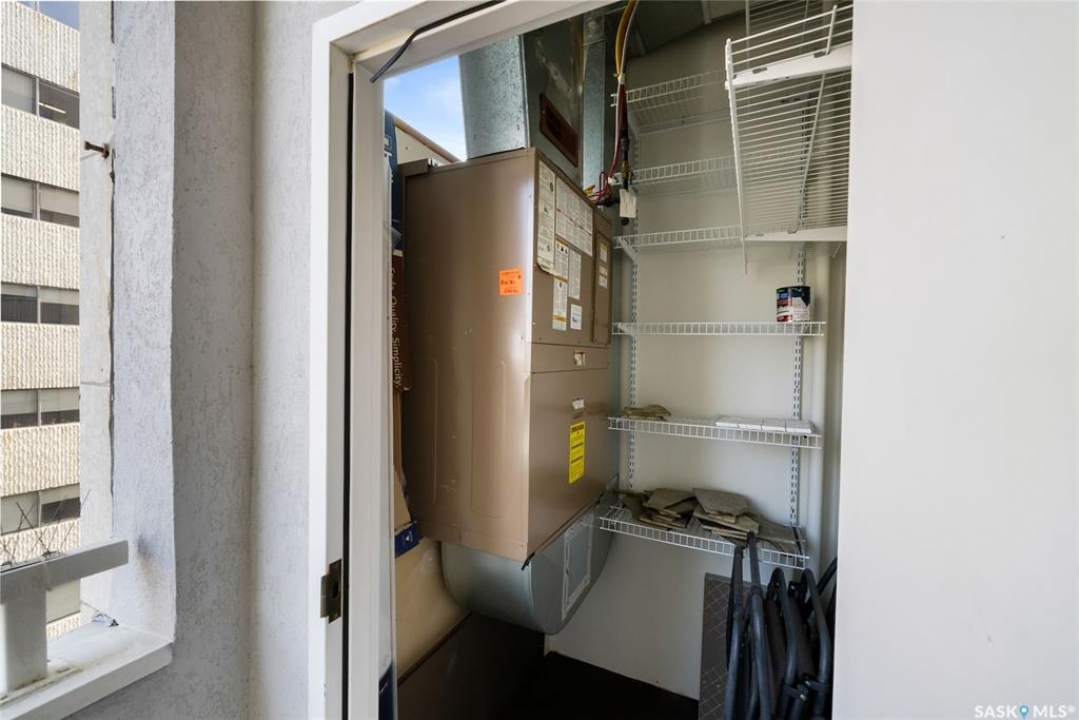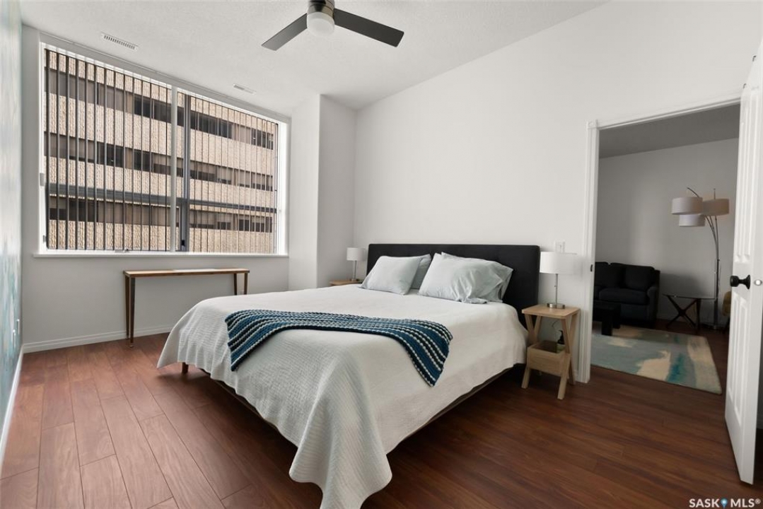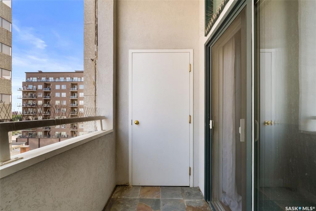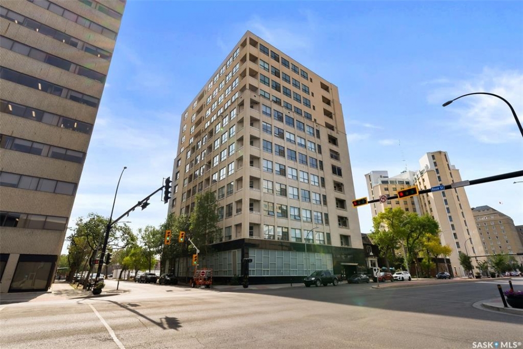 Welcome to the 7th floor of Victoria Place; where refined luxury meets the convenience of downtown Regina. This impeccably designed residence offers the ultimate urban lifestyle, just steps from some of the city's finest dining, shopping, and entertainment options. From the moment you enter, you'll be captivated by the high-end finishes and thoughtfully curated details throughout. Soaring 10-foot ceilings and a fresh, modern palette set the tone, complemented by elegant tile and laminate flooring that seamlessly unify the space. The show stopping kitchen, featuring quartz countertops, full-height custom cabinetry, integrated appliances, under cabinet lighting and a distinctive raw-edge sink combines form and function with striking visual appeal. The spacious open-concept living and dining area is bathed in natural light from the east-facing balcony doors, creating a warm and inviting ambiance. Step outside to enjoy your private balcony, the perfect spot for a morning espresso or an evening escape. Retreat to the beautifully appointed bedroom, featuring an artistic accent wall that adds personality and charm to the serene space. The den provides office space, or whatever your needs require, for flexible versatility. The stylish 4-piece bathroom offers bright, modern tiling and ample storage, while in-suite laundry and a private balcony storage room enhance daily convenience. Constructed with solid concrete, the building ensures exceptional soundproofing and long-lasting quality; providing peace, privacy, and a true sense of sanctuary in the heart of the city. Don't miss this rare opportunity to own a piece of luxury in one of Regina's most iconic downtown addresses. Urban sophistication awaits.
