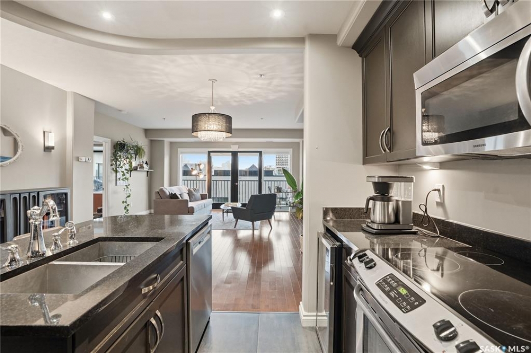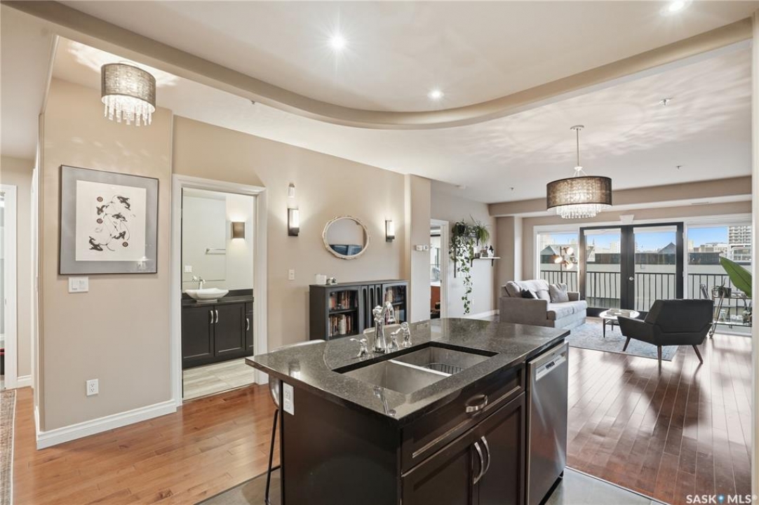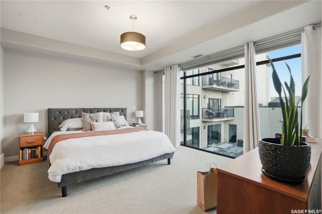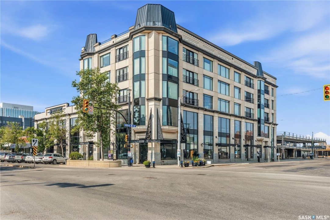 Enjoy luxury living in one of Saskatoon's most prestigious and icon developments; The Residences at the King George. Experience city living at its finest in this 1216 sq ft., 2 bedroom, 2 bathroom condo. The spacious open concept floor plan features executive level finishes designed for both elegant entertaining and everyday comfort. The fully equipped kitchen comes with stainless steel appliances, granite countertops and ample cabinetry throughout. Garden doors off the living room lead to a balcony to enjoy the downtown surroundings. The primary bedroom includes a walk-in closet and a 3-piece ensuite. The spacious second bedroom overlooks the terrace below and would also make for a great home office. Floor to ceiling windows flood the unit with natural light and offer beautiful cityscape views, both day and night. A rooftop patio is available for the residence; complete with a built in BBQ and outdoor kitchen. This unit also features 2 heated underground tandem parking spots, heated storage and a secured entry system. This exceptional home offers the perfect blend of modern urban living and historic charm and is an ideal opportunity to own a piece of Saskatoon history in the heart of the city.
