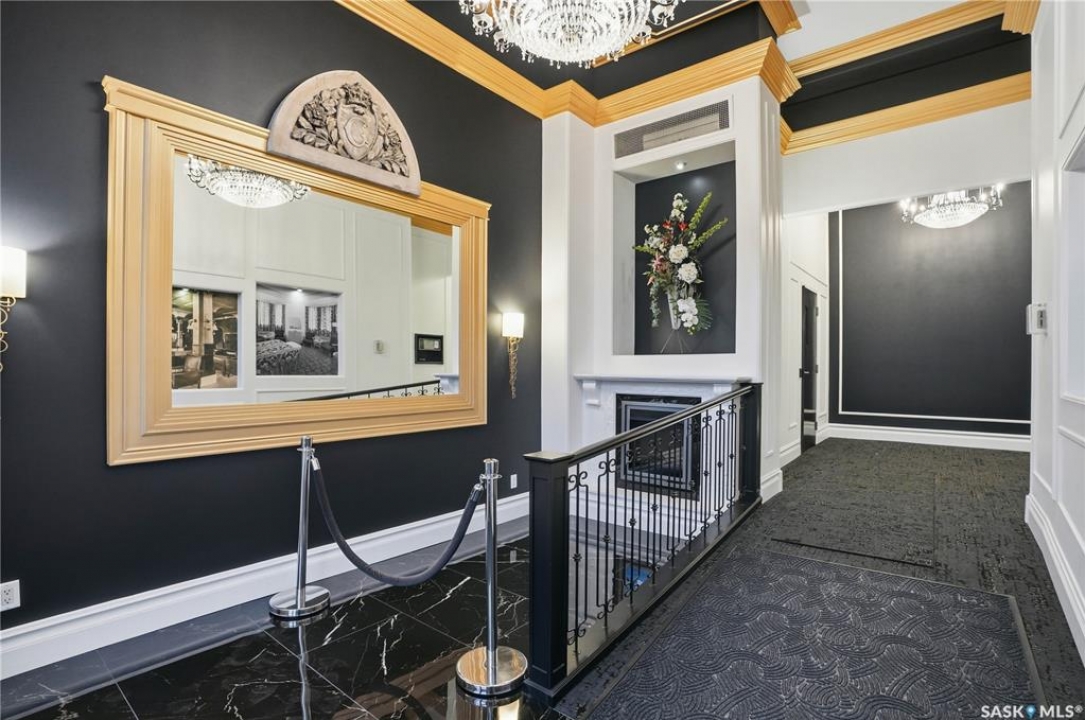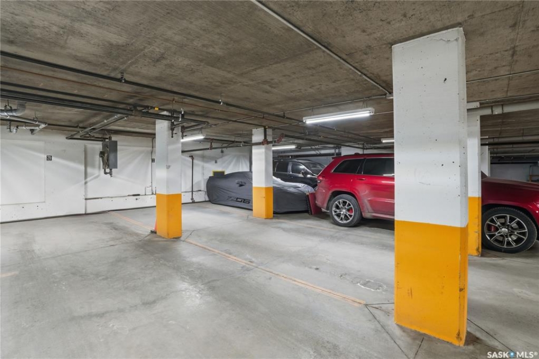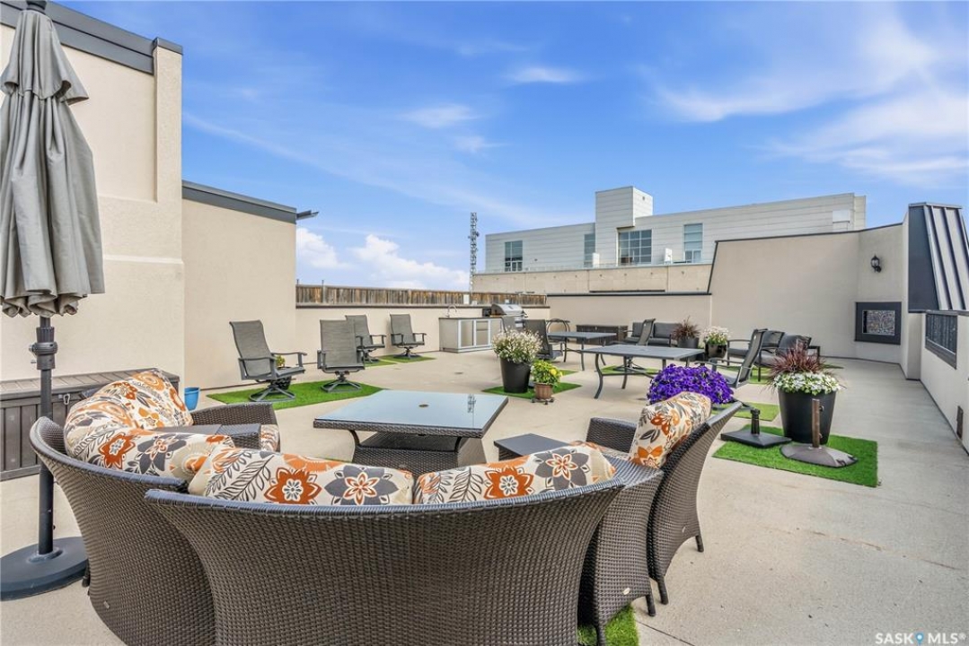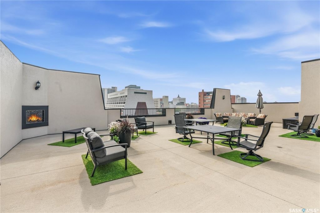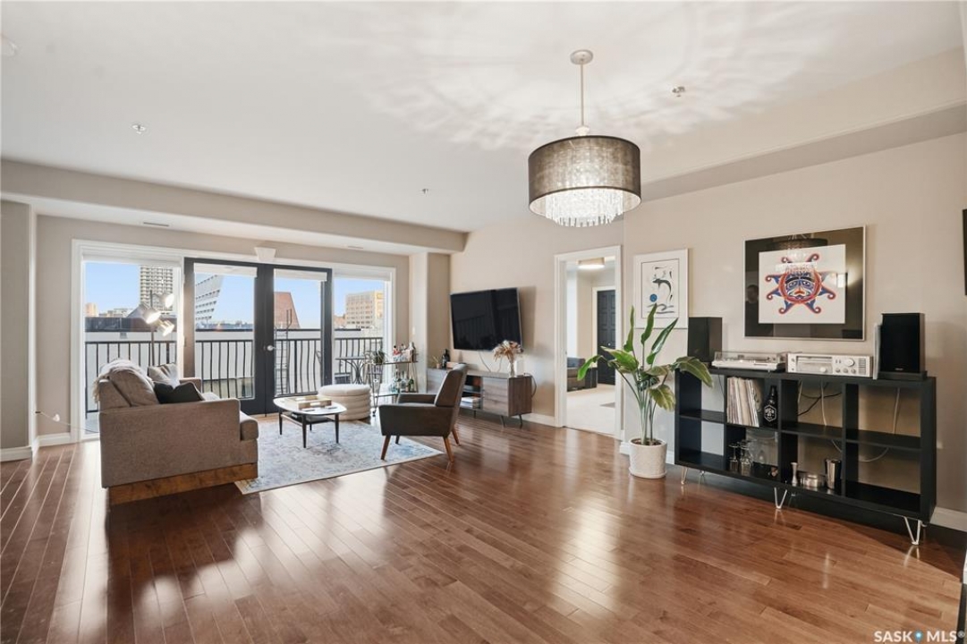 Enjoy luxury living in one of Saskatoon's most prestigious and icon developments; The Residences at the King George. Experience city living at its finest in this 1216 sq ft., 2 bedroom, 2 bathroom condo. The spacious open concept floor plan features executive level finishes designed for both elegant entertaining and everyday comfort. The fully equipped kitchen comes with stainless steel appliances, granite countertops and ample cabinetry throughout. Garden doors off the living room lead to a balcony to enjoy the downtown surroundings. The primary bedroom includes a walk-in closet and a 3-piece ensuite. The spacious second bedroom overlooks the terrace below and would also make for a great home office. Floor to ceiling windows flood the unit with natural light and offer beautiful cityscape views, both day and night. A rooftop patio is available for the residence; complete with a built in BBQ and outdoor kitchen. This unit also features 2 heated underground tandem parking spots, heated storage and a secured entry system. This exceptional home offers the perfect blend of modern urban living and historic charm and is an ideal opportunity to own a piece of Saskatoon history in the heart of the city.