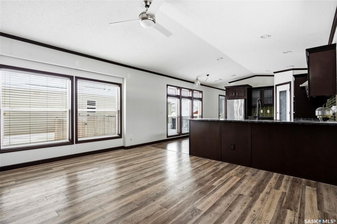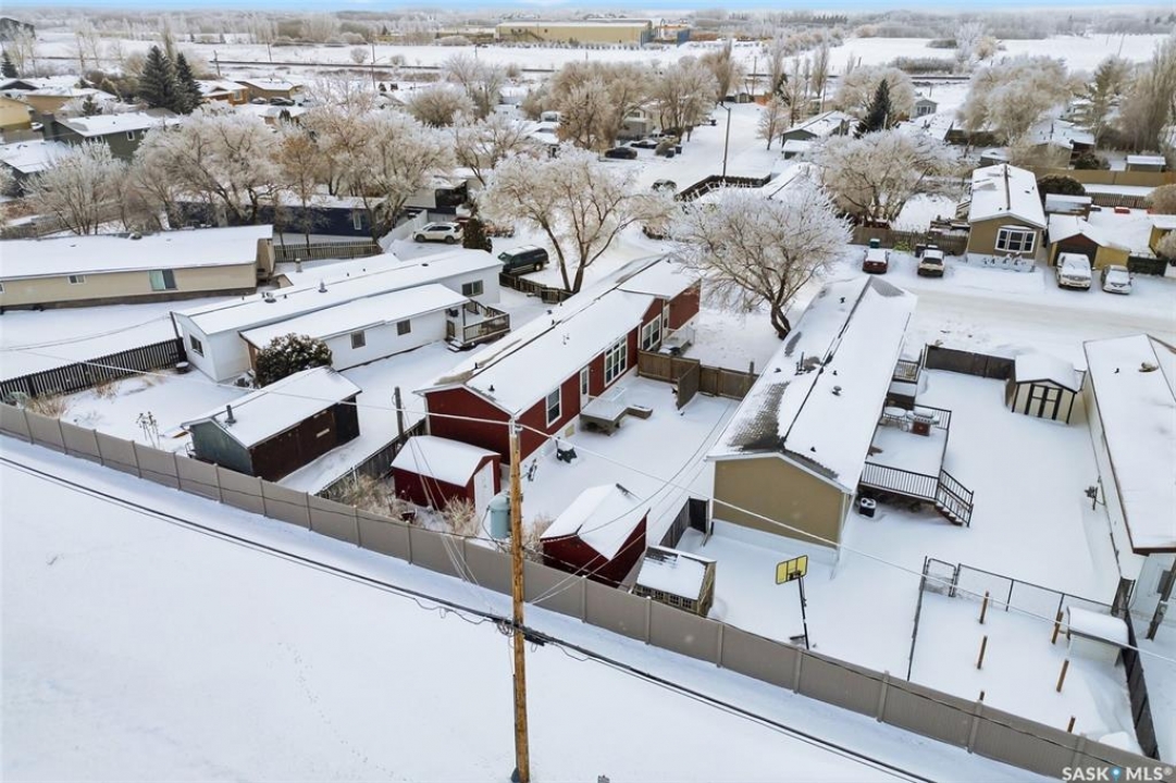 Welcome to Walters Court Mobile Home Park in Pilot Butte! Enjoy the convenience of quick access to Regina while living in a friendly community. This well-maintained 1,190 sq ft home offers excellent value with a functional 3-bedroom, 2-bathroom floor plan and vaulted ceilings that enhance the sense of space. The kitchen is thoughtfully designed with granite countertops, upgraded cabinetry, a corner pantry, and a full appliance package. The electrical panel was updated in 2023, providing added peace of mind. Outside, the fully fenced yard is perfect for relaxing or entertaining, featuring a large deck, two storage sheds, raised garden beds, and parking for up to three vehicles. Inclusions: central air conditioning, alarm system, fridge, stove, built-in oven, dishwasher, washer, and dryer. The current lot pad fee is $675/month and includes taxes, water, sewer, recycling, garbage pickup, and snow removal.