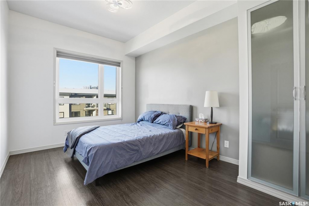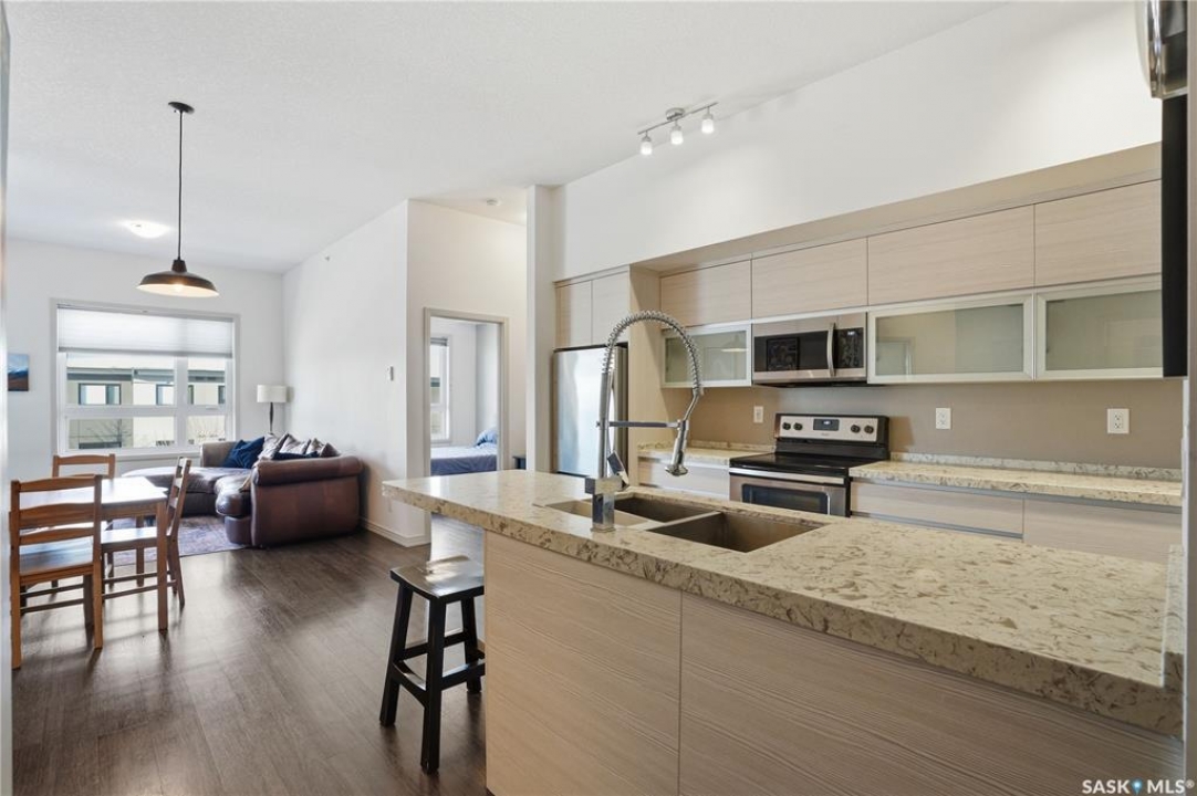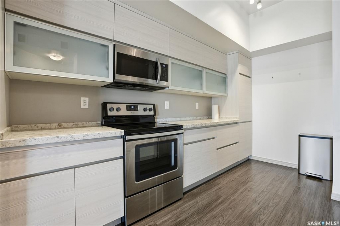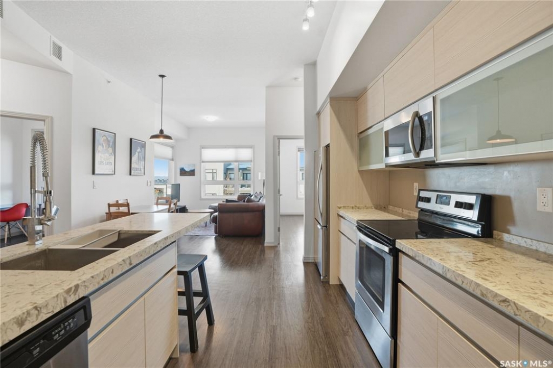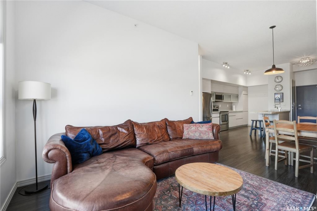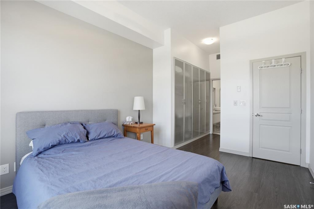 Spectacular top-floor condo in Sequoia Square! This impressive 2-bedroom, 2-bathroom residence features 10-foot ceilings and oversized windows that flood the space with natural light. The open-concept floor plan is beautifully finished and includes in-floor heating throughout for year-round comfort. The kitchen is designed to impress with quartz countertops, soft-close cabinetry, stainless steel appliances, and seamless flow into the dining and living areas. The primary bedroom is a true retreat, offering large windows, a sophisticated dressing/closet area, and a modern en-suite with double sinks, heated tile flooring, and a walk-in shower. A second bedroom, four-piece bathroom, and convenient laundry/storage room complete the interior. Additional highlights include a spacious balcony, central air conditioning, one underground parking stall with storage cage, and one electrified surface parking stall. Both parking spots are close to doors and elevator. The building offers a welcoming main lobby and recreational rooms on each floor. Ideally located with easy access to the University of Saskatchewan and surrounding amenities.