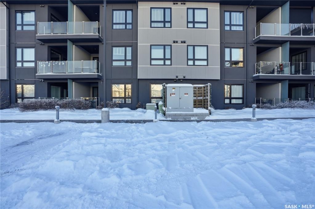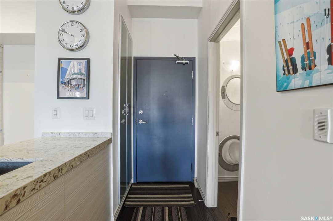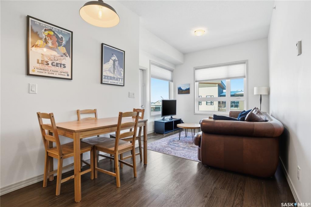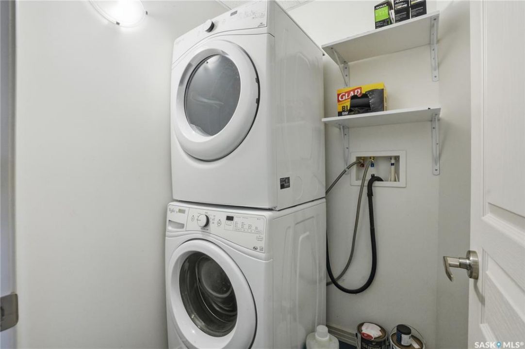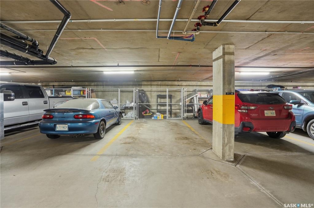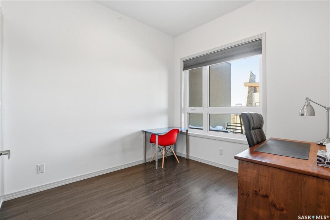 Spectacular top-floor condo in Sequoia Square! This impressive 2-bedroom, 2-bathroom residence features 10-foot ceilings and oversized windows that flood the space with natural light. The open-concept floor plan is beautifully finished and includes in-floor heating throughout for year-round comfort. The kitchen is designed to impress with quartz countertops, soft-close cabinetry, stainless steel appliances, and seamless flow into the dining and living areas. The primary bedroom is a true retreat, offering large windows, a sophisticated dressing/closet area, and a modern en-suite with double sinks, heated tile flooring, and a walk-in shower. A second bedroom, four-piece bathroom, and convenient laundry/storage room complete the interior. Additional highlights include a spacious balcony, central air conditioning, one underground parking stall with storage cage, and one electrified surface parking stall. Both parking spots are close to doors and elevator. The building offers a welcoming main lobby and recreational rooms on each floor. Ideally located with easy access to the University of Saskatchewan and surrounding amenities.