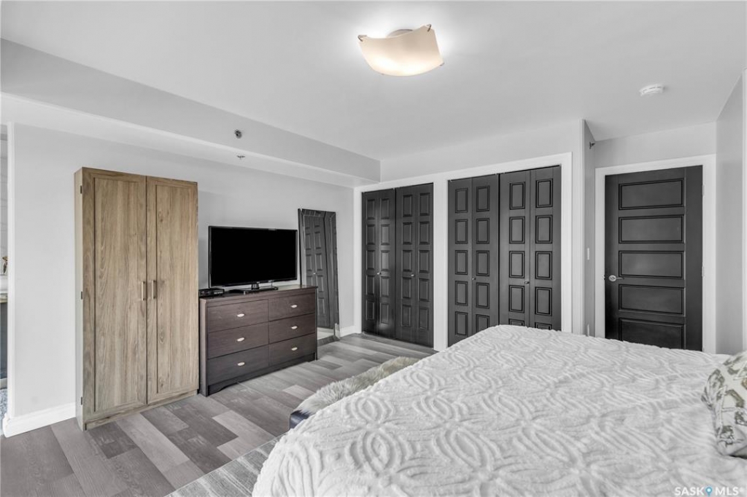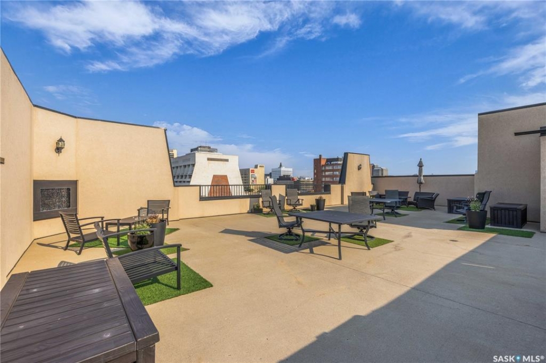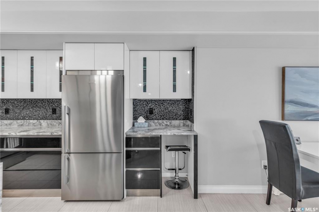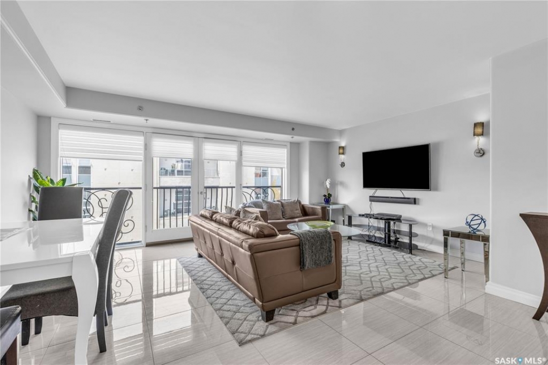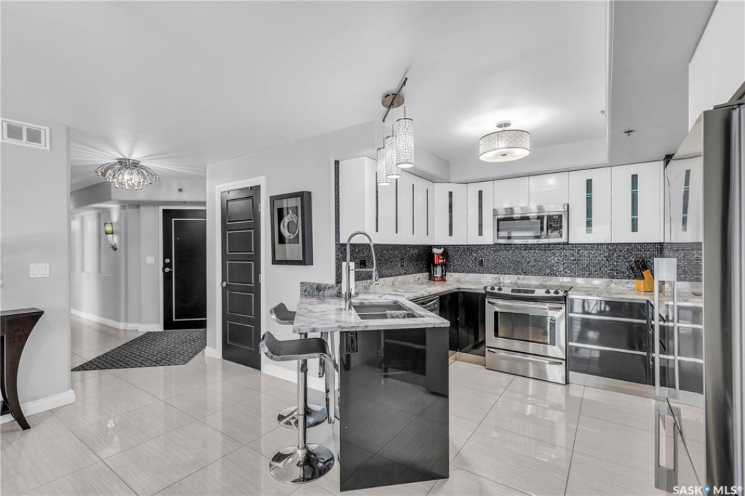 Fully-furnished top-floor executive suite with 2 bedrooms, 2 bathrooms and 2 Underground Parking Stalls! Historic elegance meets modern luxury at the Residences at King George. This iconic landmark is close to shops, dining and just a few blocks from the scenic riverfront. Luxurious limestone tile flows throughout, and floor to ceiling windows provide tons of natural light. The kitchen features sleek granite countertops and high-gloss white cabinetry with glass shelving and built-in accent lighting. A full stainless steel appliance package adds to the kitchen's functionality and style. Two sizeable bedrooms provide plenty of room for rest and relaxation, with ample closet space. The primary bedroom includes a private ensuite bathroom, ensuring a touch of luxury and privacy. The second bedroom is equally spacious, with easy access to the main bathroom, making it perfect for guests or a home office. Enjoy the convenience of in-suite laundry, and two secure underground parking spaces, providing peace of mind and protection for your vehicle year-round. For those who love to entertain or simply relax outdoors, you'll have access to a stunning rooftop deck. Complete with fully equipped outdoor kitchen, this expansive space is perfect for hosting friends or unwinding while taking in panoramic views of Saskatoon. Don't miss this chance to experience the best of historic charm and contemporary luxury at the Residences at King George.