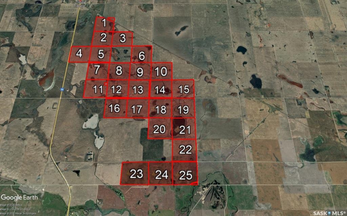 This is a rare opportunity to acquire a premier large-scale grain operation in the heart of southern Saskatchewan. Situated just one and a half miles south of Tribune, this remarkable property includes 25 quarter sections of highly productive farmland, all in a continuous block — a configuration that is exceptionally hard to find in today's market. The total land base encompasses 3,956.56 acres, and 3,462 cultivated acres from the Sama records. The layout of the farm allows for efficient, uninterrupted farming practices with minimal wasted space, thanks to its large, corner-to-corner fields and excellent access throughout the entire property. The property comes with two bin yards that include 21 grain bins. The bins include a mix of flat-bottom and hopper styles, providing flexibility for storing grain, seed, or fertilizer. This farm is strategically located just 40 miles west of Estevan and 30 miles south of Weyburn, placing it within easy reach of major service centers, grain terminals, and the U.S. border — making logistics and cross-border trade efficient and accessible. The land is currently leased for the 2026 crop season to a strong local operator and is available for the 2027 season. With a total assessed value of $6,182,800 and an exceptionally rare block of 25 quarter sections, this property stands out as a top-tier investment opportunity in Saskatchewan's farmland market. Whether you are expanding an existing operation or investing in one of the province's most valuable assets — quality farmland — this is a package that delivers scale, quality, and long-term potential. Contact S/A agent for additional information.