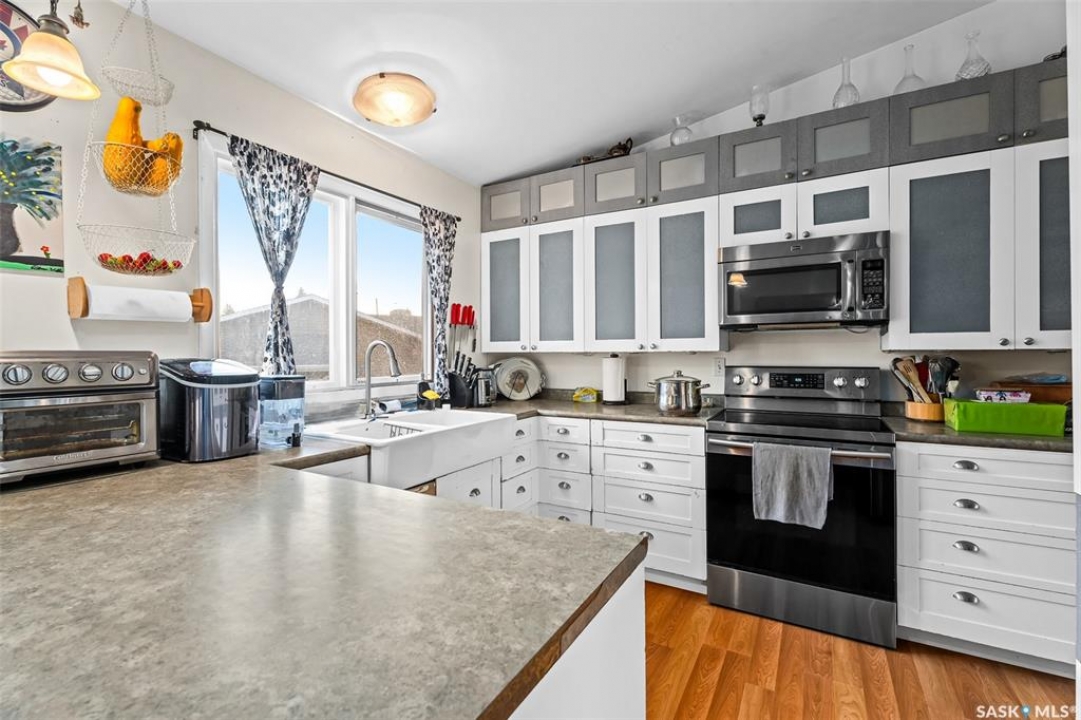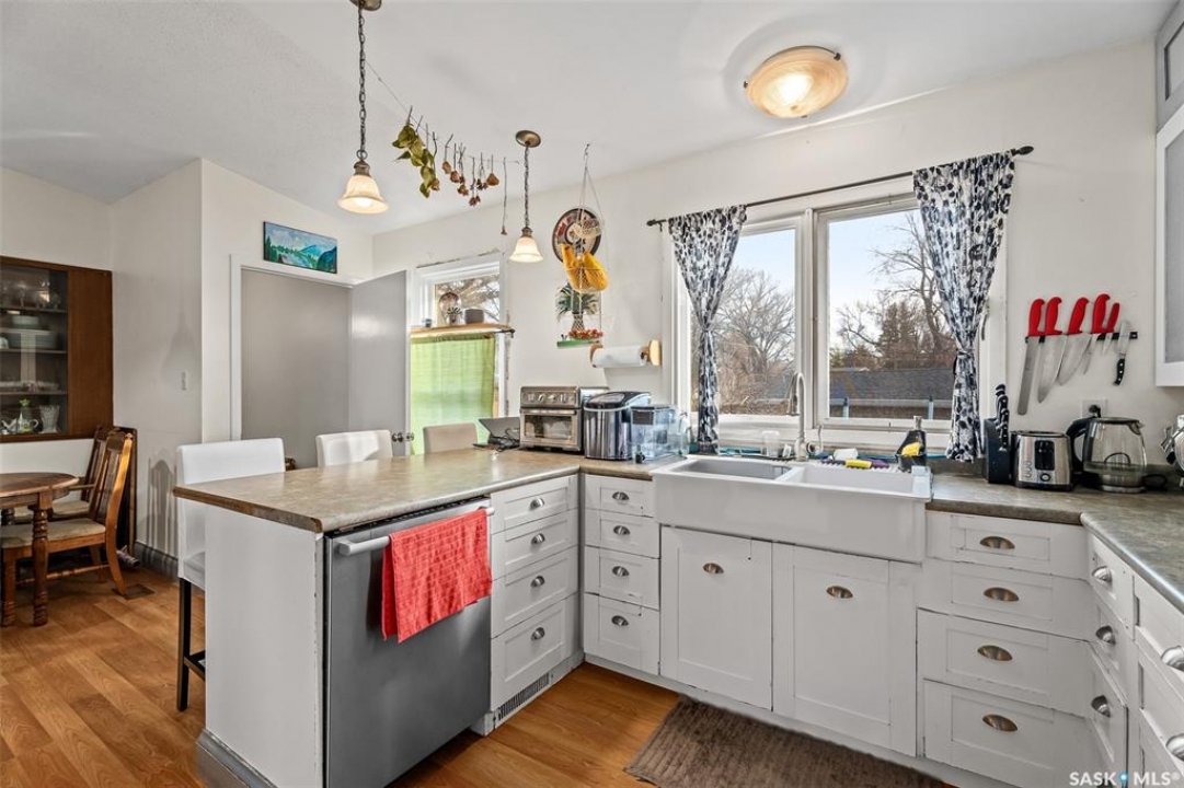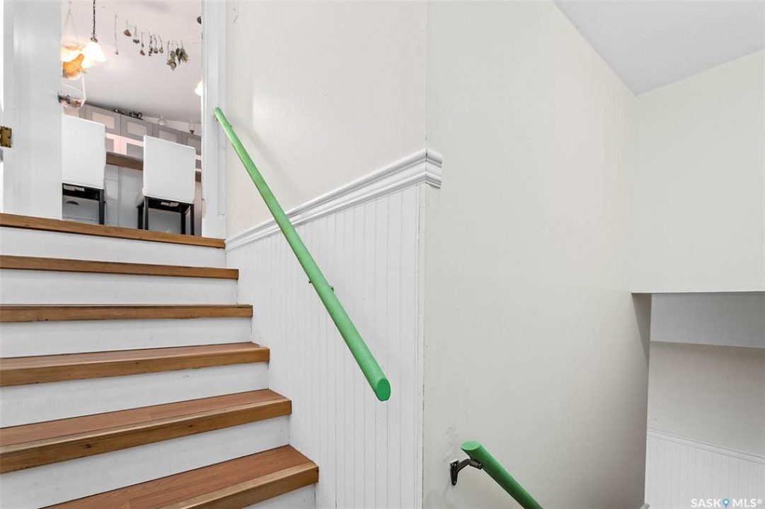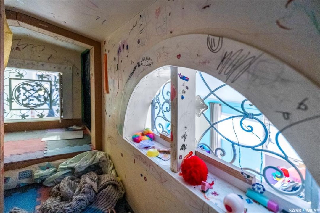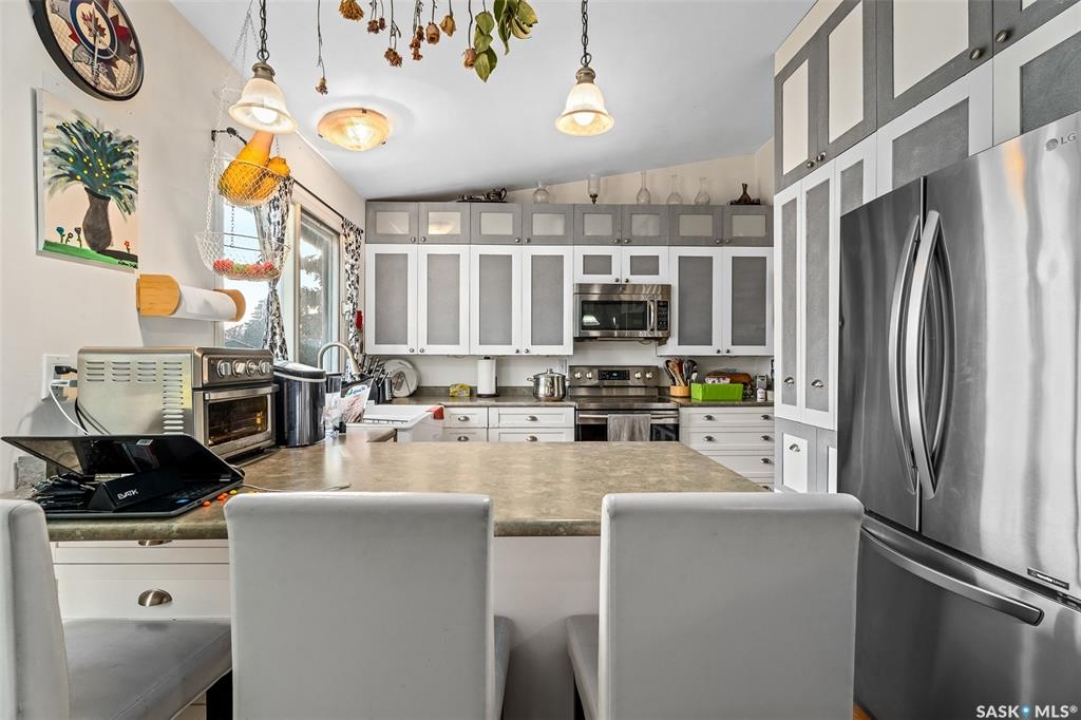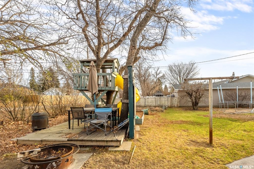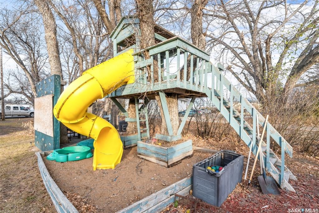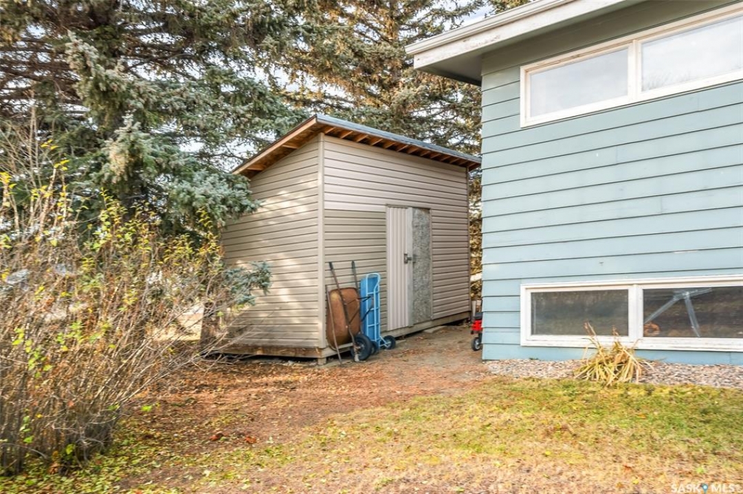 Are you looking for a large family home in the bustling town of Caronport? This large bi-level checks so many boxes boasting 4 beds / 2 baths and over 1,400 sq.ft of living space. Coming up to the home you will notice the mature yard providing lots of shade. Heading inside you are greeted by your first of 2 staircases in the home - this one showcases tall windows giving lots of natural light. The large living area will impress with the vaulted ceilings throughout the main floor - a unique feature compared to most of these houses. There is a dining room with a built in china cabinet off the living space. This U-shaped kitchen features an eat-up breakfast bar, custom toe kick drawers, large farmhouse sink and a stainless steel appliance package. Down the hall we find 2 large bedrooms - one with double closets and the other with a very cool kids playhouse in the attic. Heading down the back set of stairs we find access to a large workshop area that the buyers could convert back to a garage if they wanted. Downstairs we find a huge primary suite complete with dual sliding pocket doors, a massive walk-in closet with a sitting room space, primary bedroom and an ensuite. You will also find another large bedroom, a family room and a laundry/utility room in the basement. Outside you will love the massive corner lot - well treed, large shed, play structure and a garden area. So much space for future plans. Located just 15 minutes from Moose Jaw - Caronport has a K-12 school, gas station, post office and a coffee shop! Reach out today to book a showing! * Some photos have been virtually staged/edited.