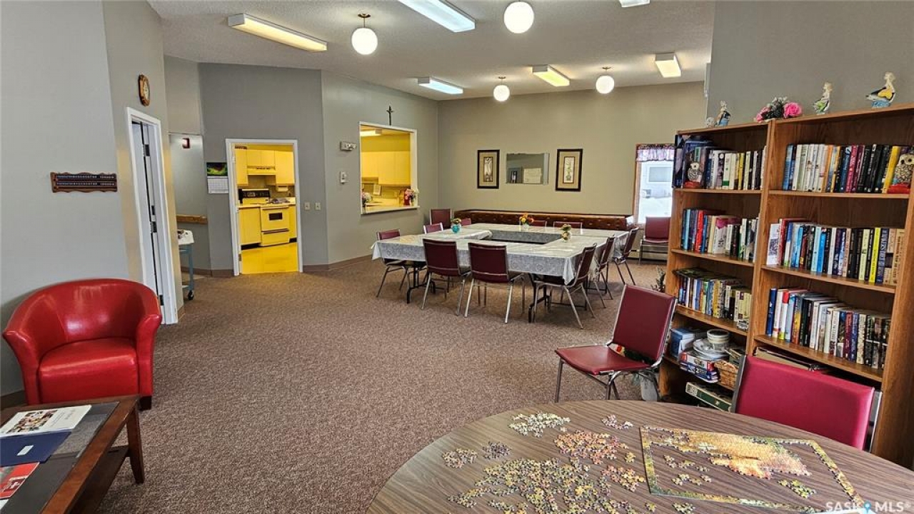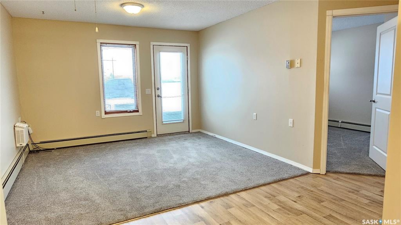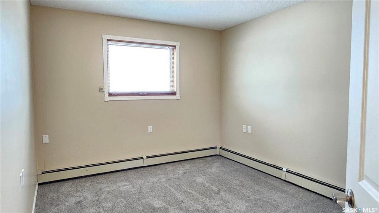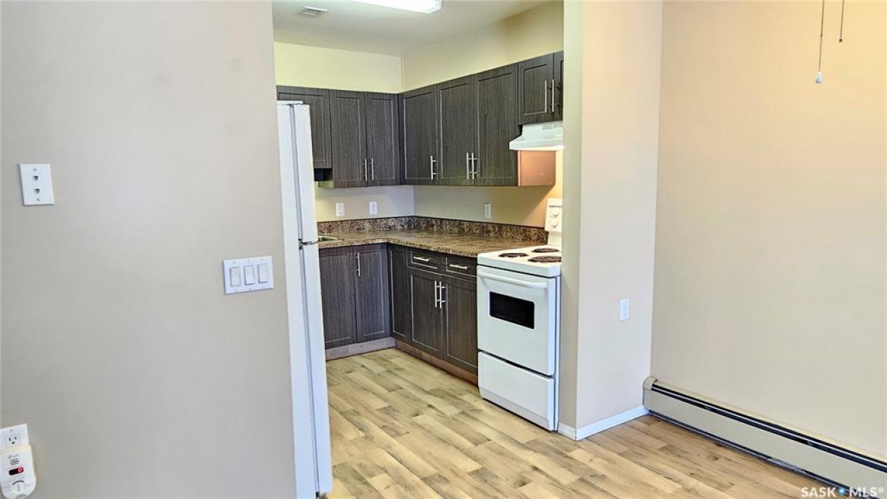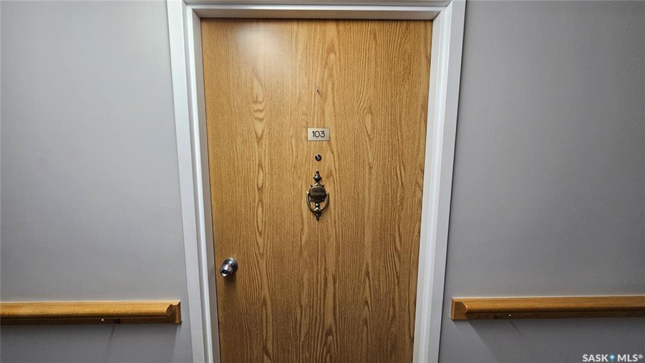 #103 Kinsmen Court, Humboldt. Affordable 55+ condo offering 595 sq. ft. of comfortable, low-maintenance living. This east-facing 1-bedroom, 1-bath unit overlooks the courtyard and is in great condition with new carpet and an updated kitchen. Functional layout includes a 4-piece bathroom and a convenient in-suite storage room. The building is wheelchair accessible and features two amenities rooms, complimentary shared laundry, and one electrified parking stall. Vacant and ready for quick possession. Ideal for downsizers or anyone seeking quiet, affordable living in a well-managed building.