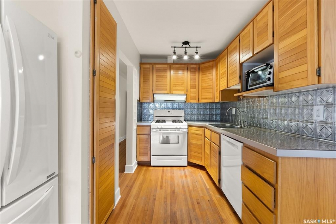 Welcome to this charming bungalow located in the prestigious Lakeview neighbourhood! This spacious home is brimming with potential and has seen a number of value-added upgrades over the years. From the moment you arrive, you'll notice the well-manicured landscaping and the inviting south-facing front veranda, perfect for enjoying your morning coffee. Step inside and you're greeted by a large mudroom before entering the main living area. The living room features large front windows that flood the space with natural light and showcase the original hardwood floors, preserving the warm character of the home. The living and dining areas flow together seamlessly, offering an ideal setup for family dinners or entertaining friends. The galley-style kitchen blends charm and function with its classic wood cabinetry, unique backsplash and patio doors leading to a 3-season sunroom. There's also room in the kitchen for extra storage or a casual dinette. The spacious primary bedroom features a lovely walkthrough closet leading to a fully renovated 4-piece bathroom complete with tiled flooring, updated fixtures, new tub and a stylish tile surround. Completing the main floor is a second spacious bedroom. Downstairs, the basement offers a blank canvas ready for your vision. Major groundwork has already been done in this regard: The sewer line was replaced from the stack to the front of the house (2019), re-lined from the house to the city (2018) and half the basement floor was dug out and re-poured. The entire exterior of the foundation was dug down and had a water-proof membrane applied along with an additional sump pump installed by RSR construction. In 2021, the exterior basement walls were framed and insulated. An added bonus is the attached two-car garage with lane access and extra parking in the back. Whether you're looking to move right in or take it to the next level, this Lakeview bungalow is full of value and potential! Ask your agent for the complete list of upgrades!