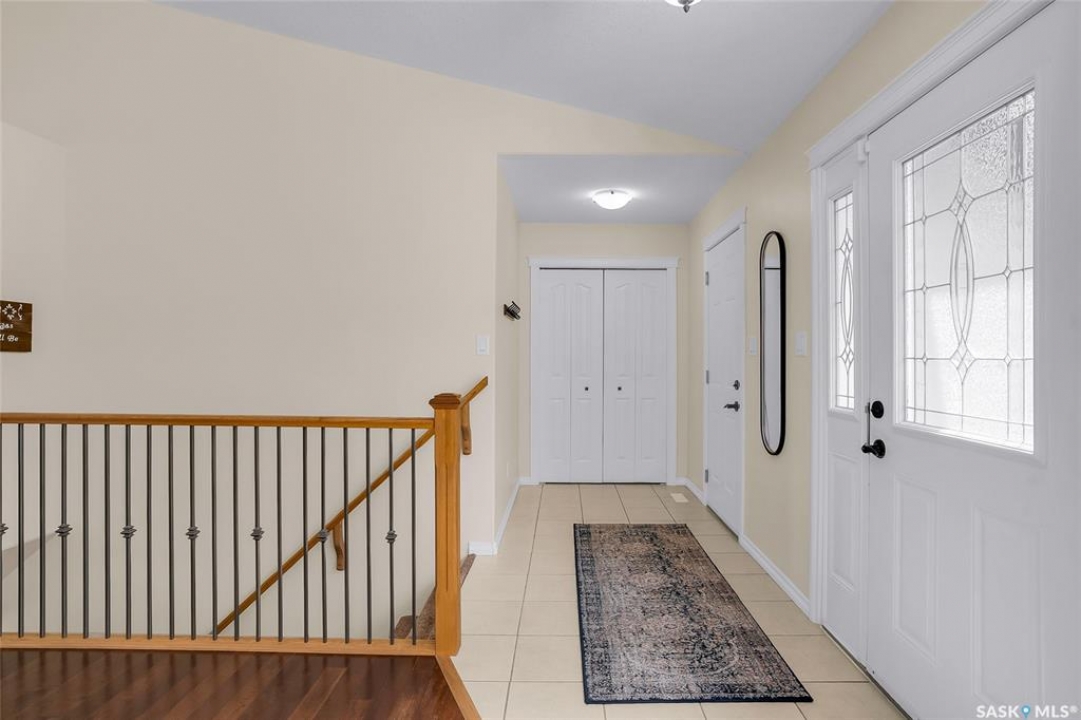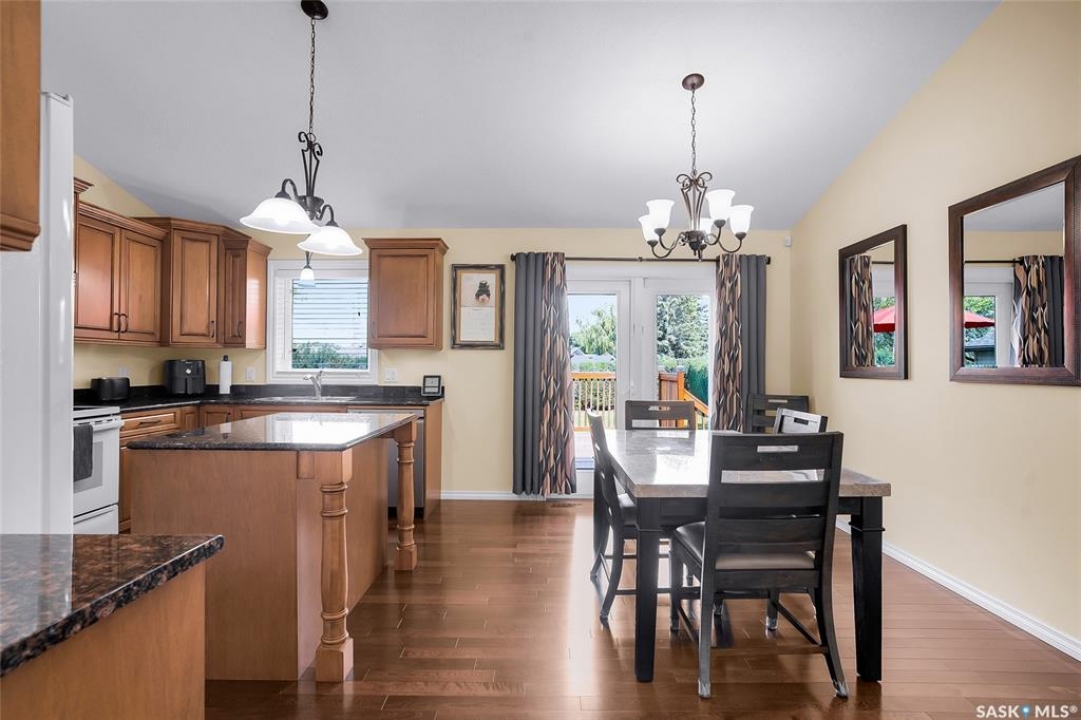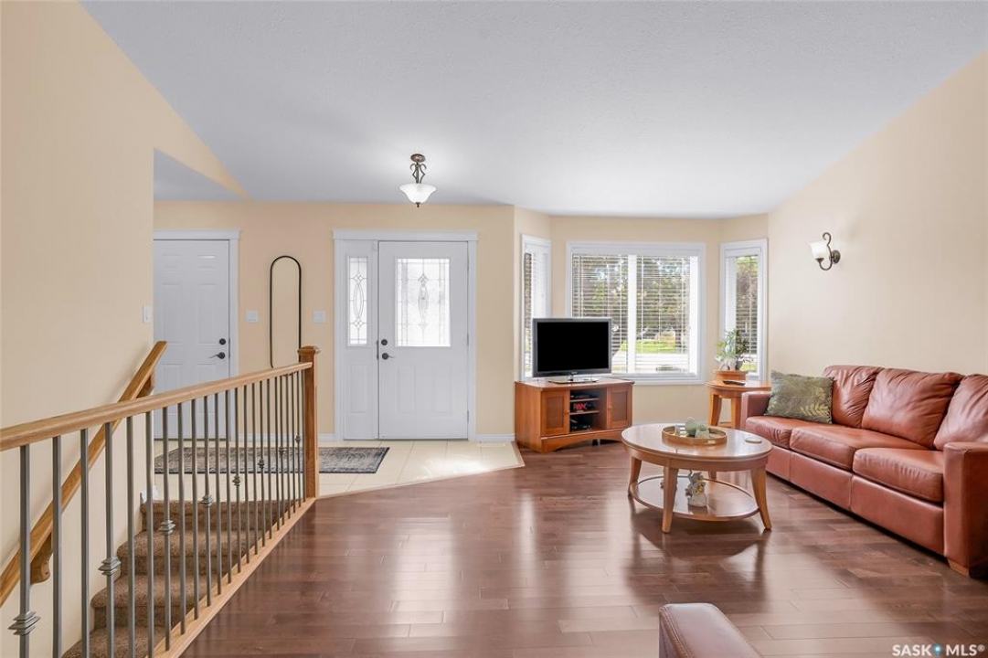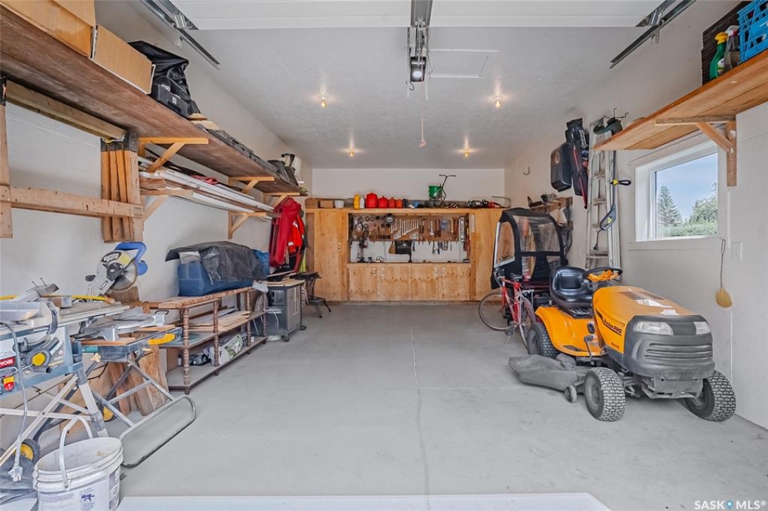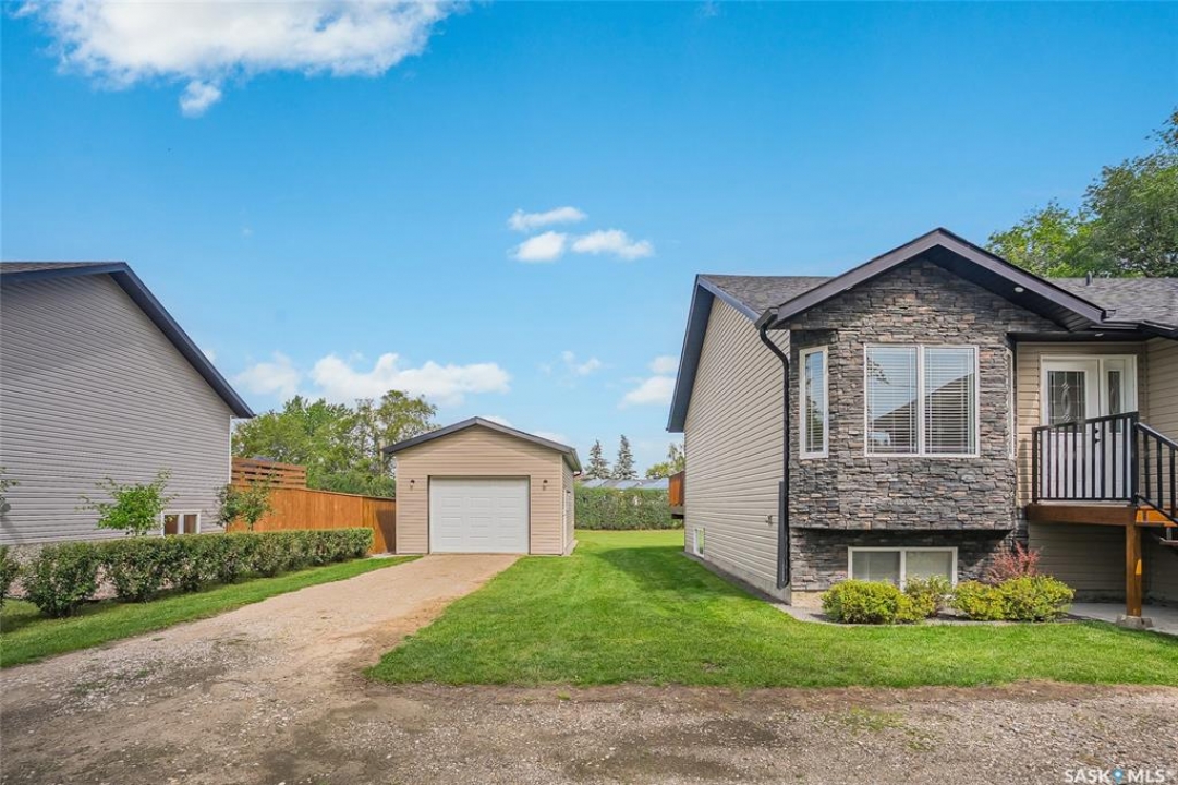 Stunning Executive Home Just 30 Minutes to Saskatoon! Discover luxury living in this absolutely gorgeous home where quality and craftsmanship are evident from the moment you arrive. Nestled on an oversized, fully landscaped 81.5 x 200-foot lot offering exceptional privacy, this property is a beauty. Step inside to vaulted ceilings and an open floor plan that seamlessly blends elegant living with everyday comfort. Beautiful hardwood floors flow throughout, while the kitchen showcases granite countertops and rich maple cabinetry. The thoughtfully designed layout includes three spacious bedrooms, with the primary suite featuring a 4-piece ensuite and generous walk-in closet. The open-concept basement expands your living space dramatically, boasting impressive 9-foot ceilings making you feel like you are not in a basement! Here you will find a games room, family room with electric fireplace, an oversized bedroom, large storage room, 3-piece bathroom, and laundry room with additional storage solutions. Entertain in style on the oversized deck, perfect for gatherings and quiet relaxation. Vehicle and storage enthusiasts will appreciate the exceptional 24x24/26-foot attached garage with 10-foot ceilings and 8-foot doors, PLUS a fully insulated 16x30-foot detached garage. New shingles 2025. Conveniently located near the school, park, and post office, this home offers the perfect blend of peaceful country living with easy access to urban amenities. This is more than a house, it's a lifestyle.