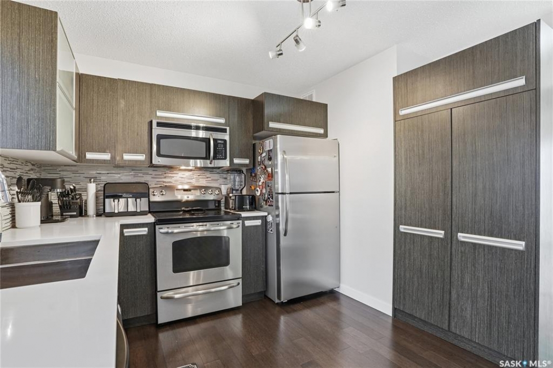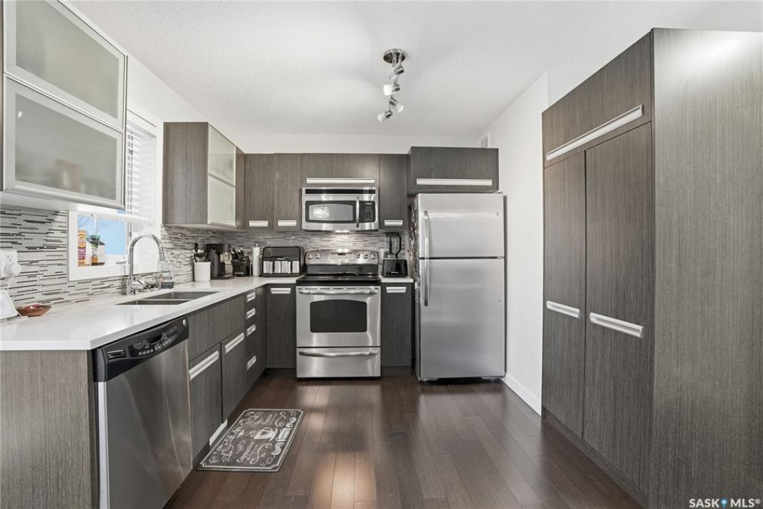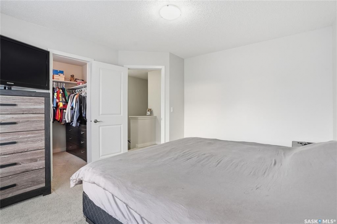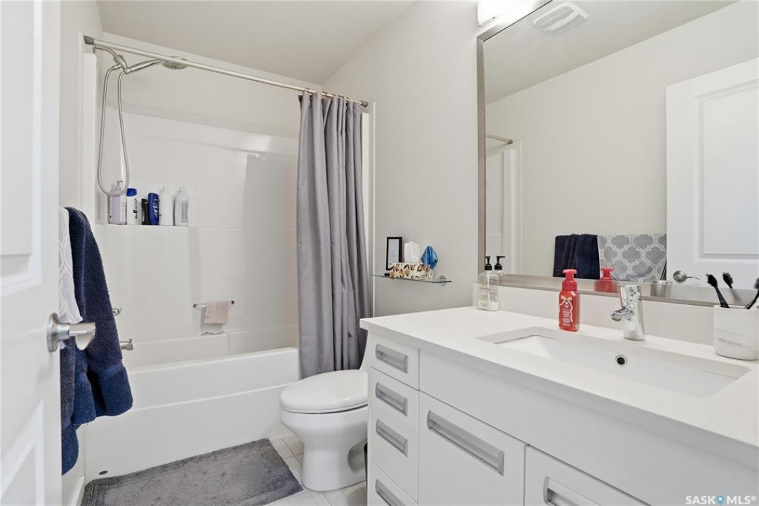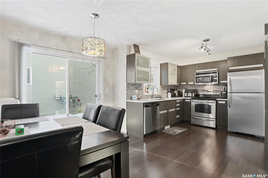 Bright, spacious, and ideally located, this middle-unit Sandpointe townhome in Stonebridge offers a perfect blend of style, comfort, and convenience. Enjoy an abundance of natural light, a functional layout, and a prime setting in one of Saskatoon's most desirable neighbourhoods. The home is ideally situated close to two elementary schools, parks & walking paths, grocery stores, restaurants, and other everyday amenities. The main floor features an open design ideal for both daily living and entertaining. A spacious living room, enhanced by the bay window, creates a warm and inviting atmosphere. The dining area flows seamlessly into the fully-equipped kitchen, complete with modern appliances, a stylish tile backsplash, and ample cabinetry. Stepping outside, you will find the outdoor patio, perfect for morning coffee, barbecuing with friends, or simply enjoying the fresh air. A convenient 2-piece bathroom completes the main level. Upstairs, you'll find three spacious bedrooms, including a primary suite with walk-in closet. A well-finished 4-piece bathroom serves the second level with both style and functionality. The fully finished basement provides valuable additional living space, featuring a large family room ideal for movie nights, a play area, or a home gym, along with a generous storage area to keep everything organized. Laundry facilities are also located on this level for added convenience. Additional highlights include central air conditioning, two parking stalls, off-street guest parking, and additional street parking directly in front of the unit available for guests and visiting family. Your furry friends are welcome here, as the pet policy has no weight limit. This move-in ready home shows beautifully, and has been well maintained. For those seeking a low-maintenance home in a vibrant, family-friendly community with exceptional convenience, this Sandpointe townhome is a must-see!
