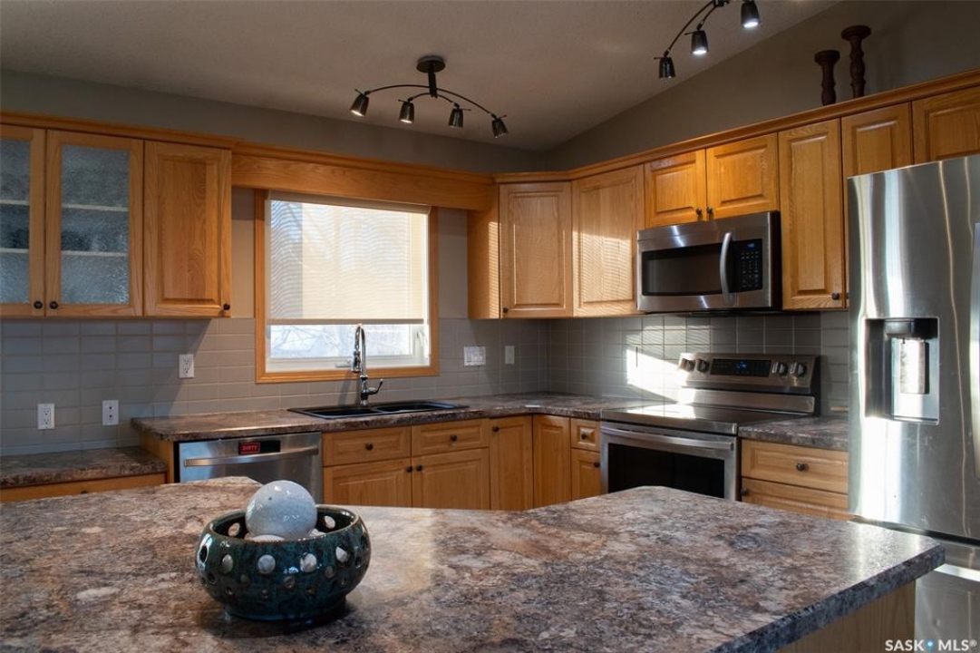Well maintained 6-bedroom Vancouver Split with 2,331 sq. ft. of living space, located in a mature neighbourhood. Spacious main floor features vaulted ceilings, open living and dining area, and a kitchen with island and stainless steel appliances. Garden doors lead to a west-facing deck. Upper level offers three bedrooms, including a primary with walk-in closet and 3-piece ensuite, plus a full main bath. Fully developed walk-out lower level includes in-floor heat, family room with gas fireplace, three bedrooms, a 3-piece bath, and plenty of storage. Heated 24' x 24' attached garage, fenced yard with alley access, 8' x 12' shed, underground sprinklers and school bus pickup nearby.