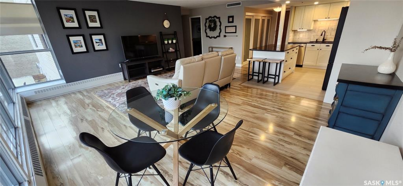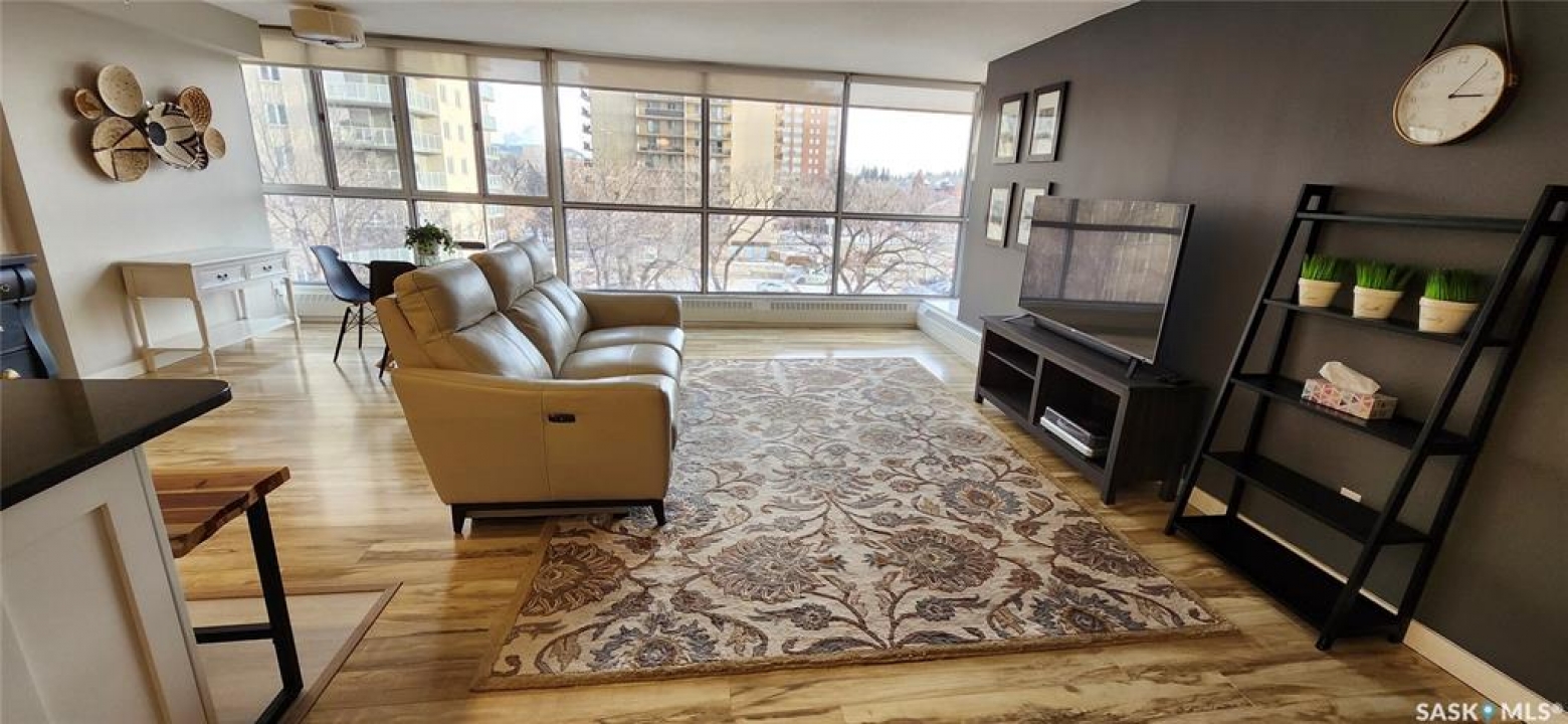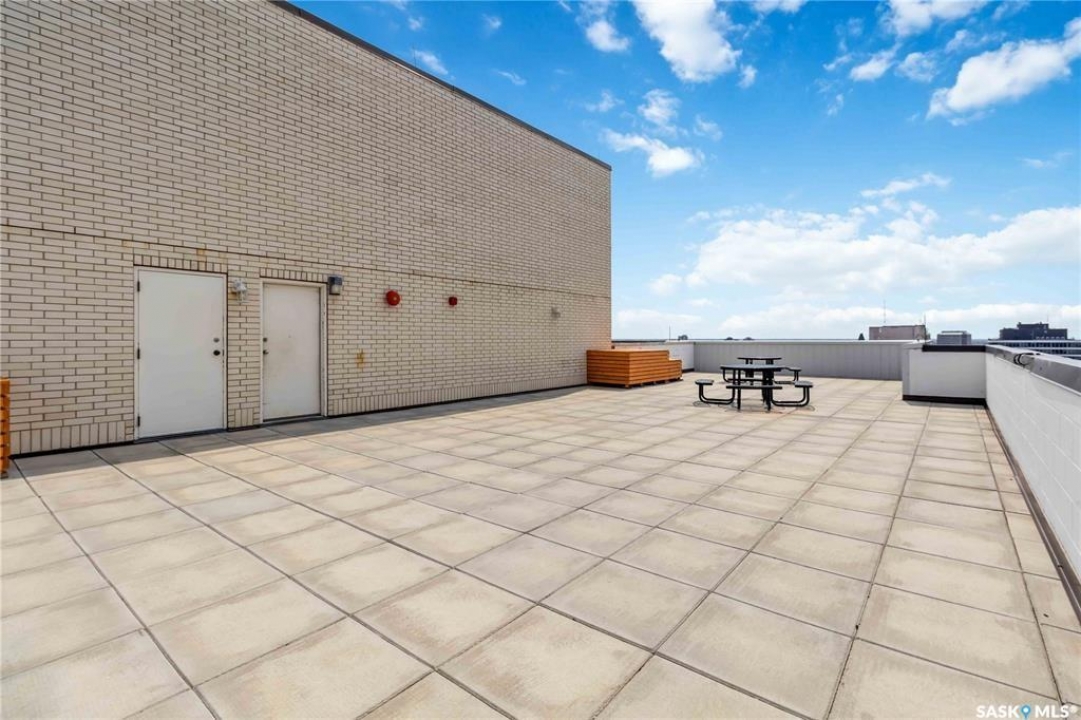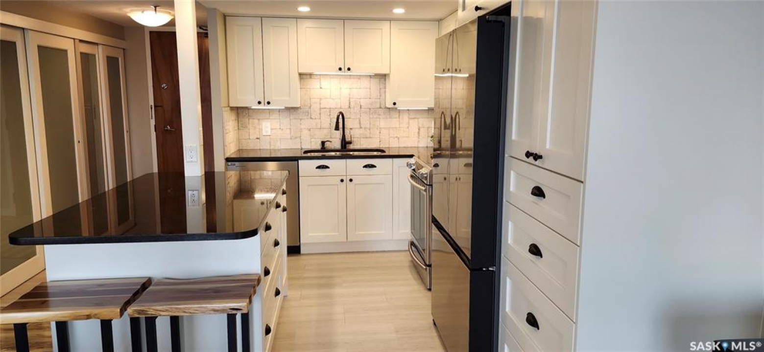 Convenient, luxurious downtown living in The Terrace condo building. Walk to the river, the U of S, & downtown amenities. This immaculate 2 bedroom / 2 bath 1076 sq ft condo is light and bright with a wall of floor to ceiling east facing windows. The new kitchen is sure to impress with quality white cabinetry, granite countertops, undermount double sinks, stainless steel appliances, updated lighting, and a huge island for food prep or entertaining. Attention paid throughout with customized closets, pantry, and storage room to maximize storage space. Boiler & forced air heat & central air conditioning keep you comfortable. Indoor heated parking. The Terrace building amenities include a swimming pool, hot tub, sauna, 4th floor community room & outdoor patio/BBQ area, a guest suite + a roof top patio for 22nd floor panoramic views. This unit and building are definitely worth a look!