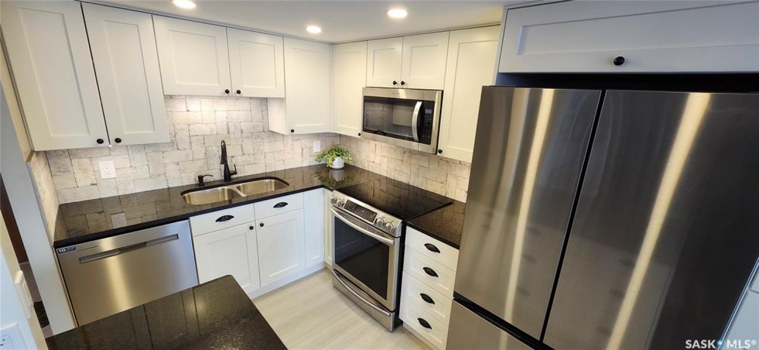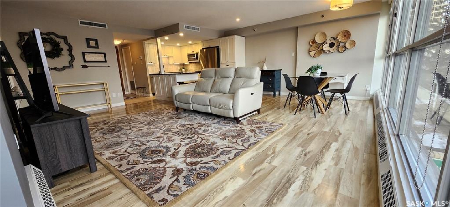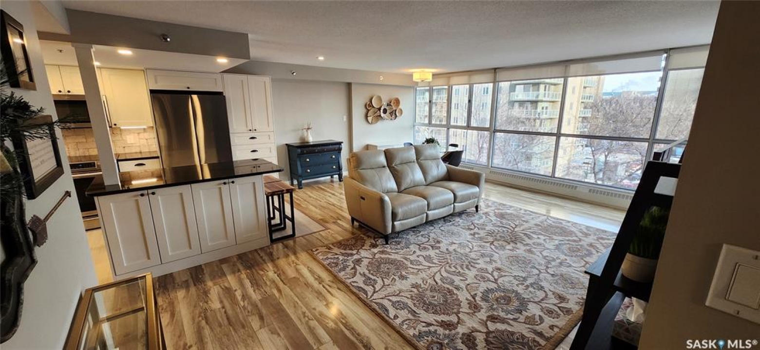 Convenient, luxurious downtown living in The Terrace condo building. Walk to the river, the U of S, & downtown amenities. This immaculate 2 bedroom / 2 bath 1076 sq ft condo is light and bright with a wall of floor to ceiling east facing windows. The new kitchen is sure to impress with quality white cabinetry, granite countertops, undermount double sinks, stainless steel appliances, updated lighting, and a huge island for food prep or entertaining. Attention paid throughout with customized closets, pantry, and storage room to maximize storage space. Boiler & forced air heat & central air conditioning keep you comfortable. Indoor heated parking. The Terrace building amenities include a swimming pool, hot tub, sauna, 4th floor community room & outdoor patio/BBQ area, a guest suite + a roof top patio for 22nd floor panoramic views. This unit and building are definitely worth a look!