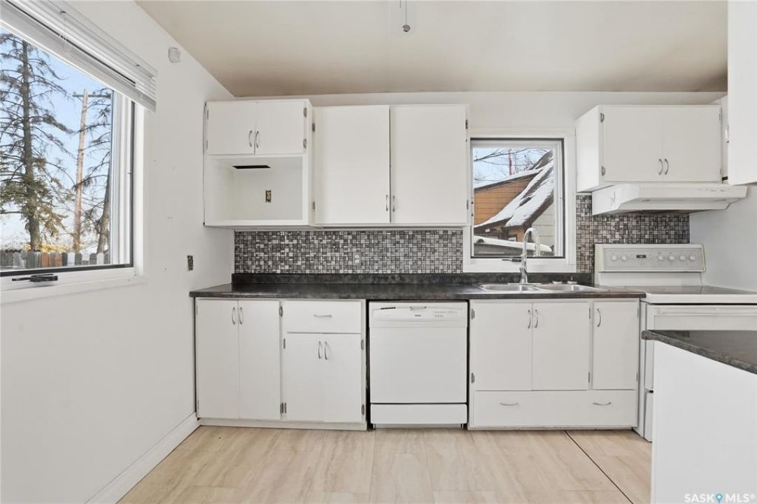 Welcome to 10 Connaught Place, a charming 903 sq ft bungalow tucked onto a quiet crescent in Saskatoon's Kelsey/Woodlawn neighbourhood. Built in 1957, this classic home has been refreshed for comfortable everyday living. Mature trees frame the front yard and the low-maintenance exterior delivers great curb appeal. Step inside to a bright, welcoming main floor with a spacious front living room, updated flooring and a fresh, neutral palette that's easy to personalize. A practical entry includes convenient closet storage to keep things tidy. The layout flows to the dining area and kitchen, where you'll appreciate crisp white cabinetry, a contemporary tile backsplash, generous counterspace and a window that keeps the space sunny while you cook. Down the hall are two comfortable bedrooms and a full bathroom. The fully developed basement adds excellent bonus space with a large family/rec room which can be used as a third bedroom, a second bathroom, dedicated laundry area and plenty of storage—ideal for a home office, gym, play space or movie nights. With an open footprint, you can create separate zones for entertaining, guests and hobbies and still have room to add your own finishing touches. Outside, enjoy a private backyard with space to relax, garden and host friends. A deck area is perfect for summer BBQs, and there's room for a firepit and play space. You'll also appreciate an oversized storage shed, extra parking and alley access. Located close to schools, parks, shopping, transit routes nearby and offering quick access to downtown and commuter routes, this 3 bedroom, 2 bathroom property is a fantastic option for first-time buyers, young families or investors looking for a move-in ready home in an established area. Don't miss it—book your showing today!