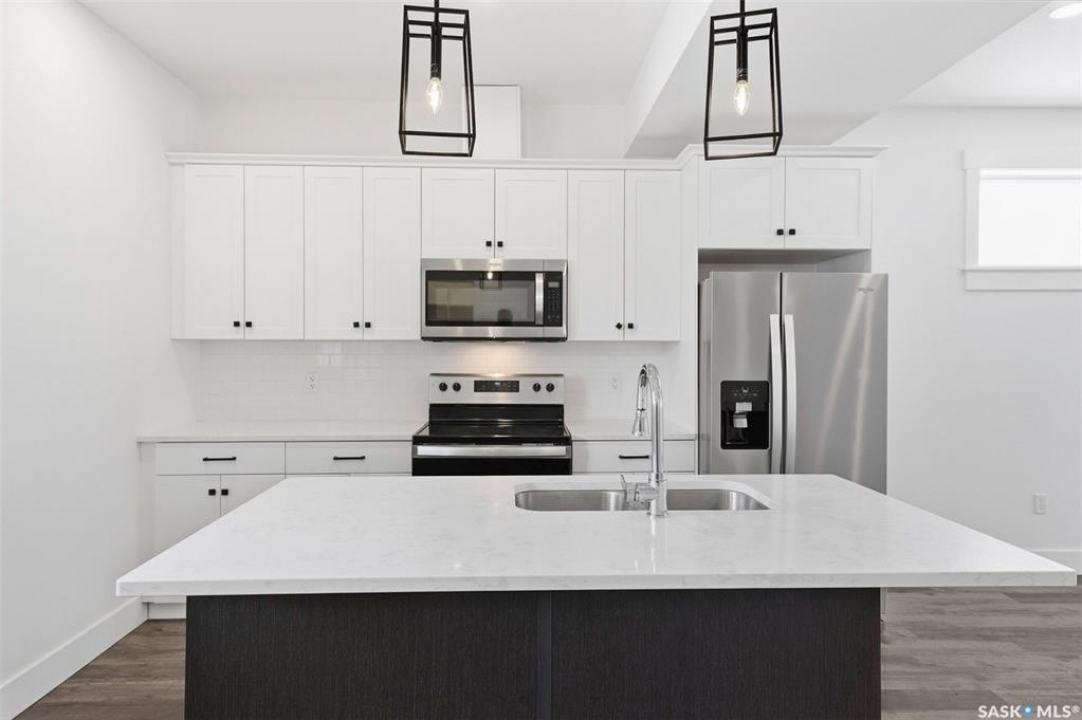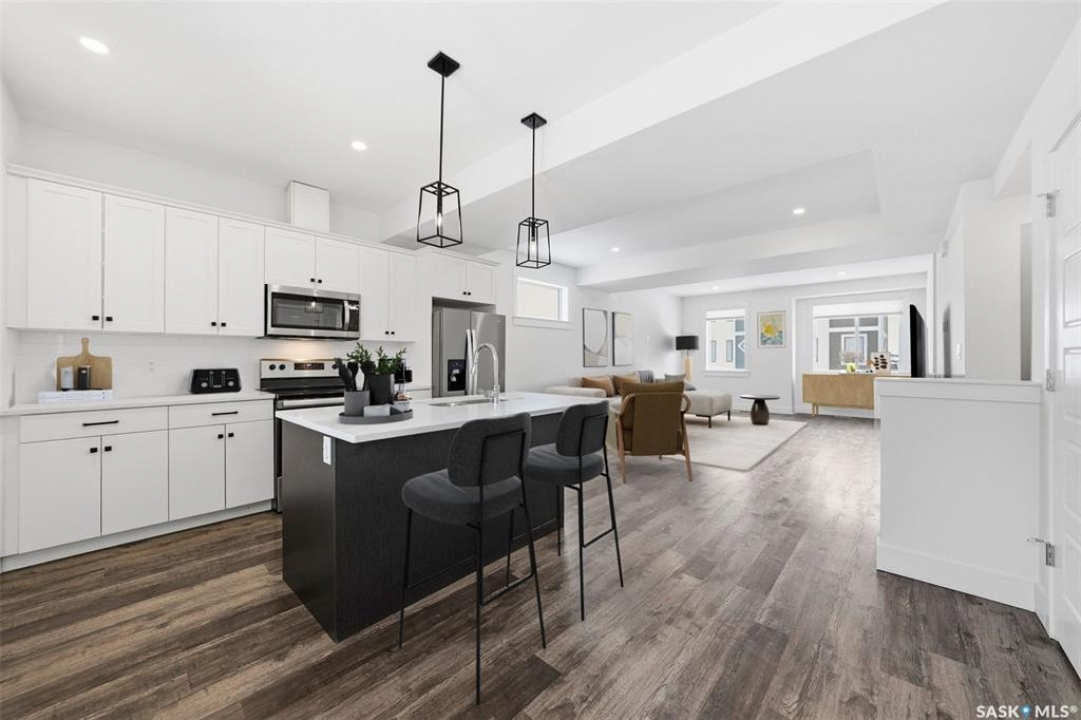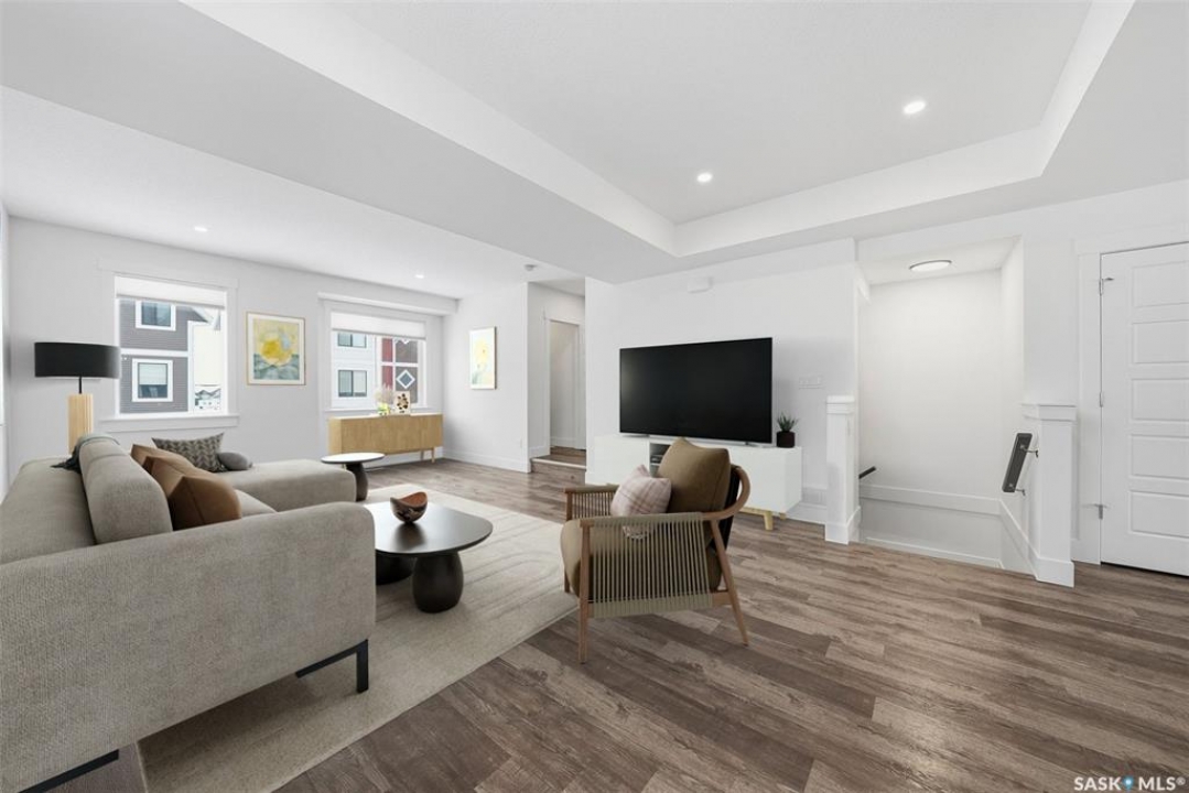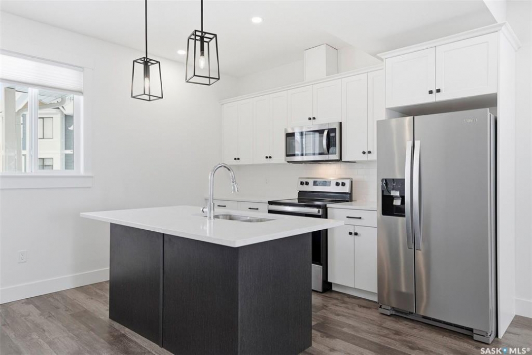 This bright and spacious home features 9-foot ceilings, with the main floor offering an open-concept great room design. The chef-style kitchen includes a walk-in pantry, soft-close cabinetry, quartz countertops, tiled backsplash, and stainless steel appliances. The kitchen flows seamlessly into the inviting living area, creating a perfect space for everyday living and entertaining. A convenient two-piece powder room completes the main level. Upstairs, you'll find three bedrooms and two bathrooms, including a comfortable primary suite with a walk-in closet and relaxing ensuite. Laundry is thoughtfully located on the upper floor for added convenience. The tandem garage provides ample space for parking and storage. Outside, enjoy a fenced backyard with an upper balcony. All appliances are included. Ideally located close to schools, trails, amenities, and the Legends Golf Course, this home offers a perfect blend of comfort, style, and location. This complex is pet friendly and has a fully fenced back yard. Move in ready for your convenience.