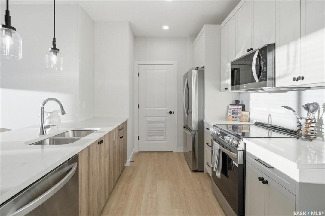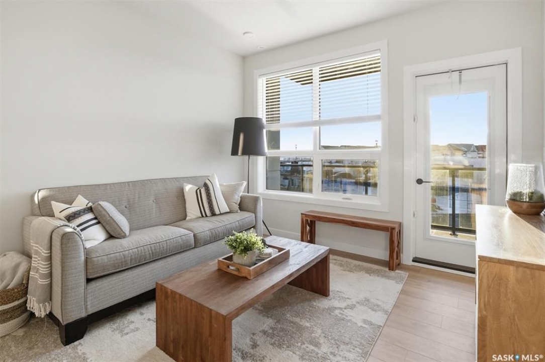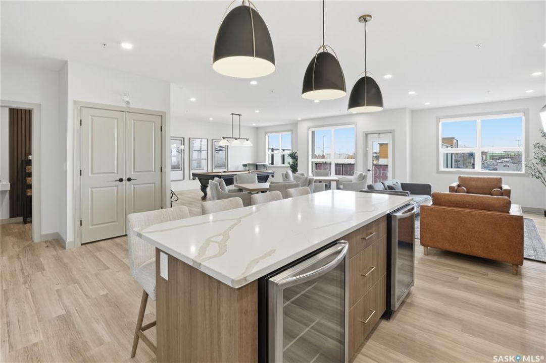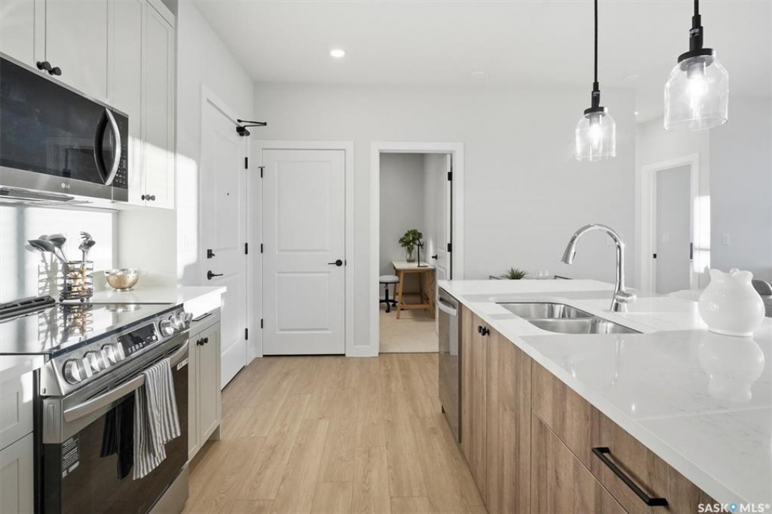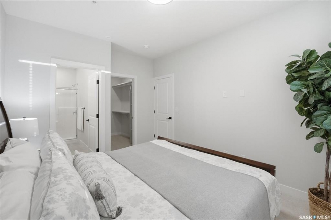 Welcome to ‘RYSE by North Ridge' located in Saskatoon's growing community of Brighton! RYSE is a modernized apartment style condominium complex offering 1 bedroom, 2 bedroom, and 2 bedroom + den options. You will immediately notice the welcoming nature of RYSE the moment you step into the warm and inviting front entrance. Unit 1203 (Skyline layout) is a south east facing 964 sq ft condo with 2 bedrooms, 2 bathrooms, a den, separate laundry room, galley style kitchen, and dining/living areas. The interior features high end designer finishes, fixtures, countertops, and flooring, all with quality built craftsmanship. A private partially covered balcony awaits complete with duradeck, glass railing, natural gas bbq outlet, and electrical outlet. Each condo unit comes with a parking stall located in the heated parkade as well as a convenient storage room. Exterior parking stalls may be available to purchase. Each unit also includes a kitchen and laundry appliance package and air conditioning. RYSE has an amenity room for you to visit and relax featuring a bar area, comfortable seating, pool table, bathroom, and an outdoor patio lounge. GST and PST included in purchase price with any rebates to builder. Sask Home Warranty Premium Coverage Plan. This prime location is within a few minute walk to grocery/shopping/restaurants/bus and several other amenities. Show home hours are Mon thru Thurs 5-8PM and Weekends 12-5PM. Call to view!