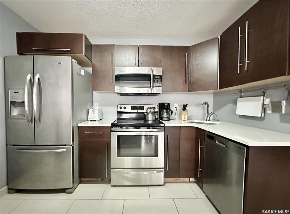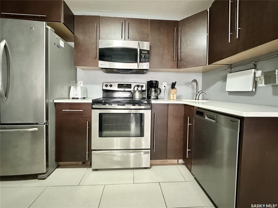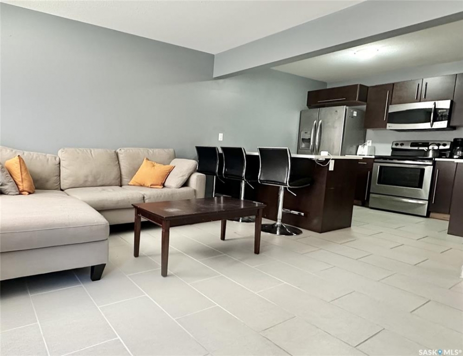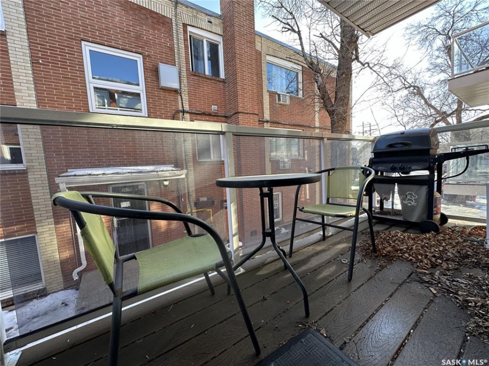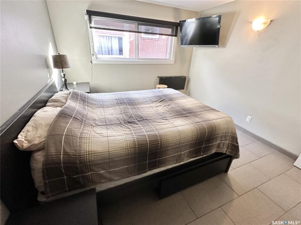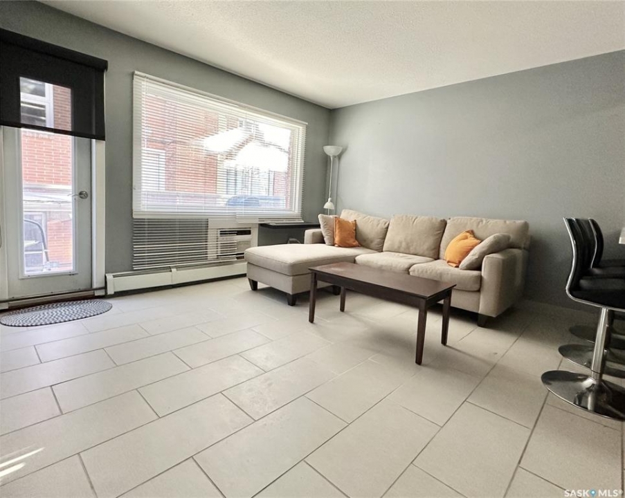Walk to work or easy commute to any corner of Regina. Fabulous downtown condo. Clean quiet building. Located on the middle floor with a balcony and choice of in-suite laundry if desired. Shared laundry in lower level. Open kitchen and living room design. Espresso cabinetry with light stone counters and under-mount stainless steel sink. Stainless steel fridge, stove, built-in dishwasher and microwave hood fan all included. Extra large island has 6 storage drawers and room for stools. Cute balcony off the living room. Good-sized bedroom and full 4-piece bathroom. Bathroom has deep soaker tub, body jets and rain shower head with custom tile surround. In-suite storage unit has laundry hook up for stacking washer and dryer. Washer and dryer not included. Ceramic tile flooring throughout. Location is right for the downtown professional or to expand your revenue portfolio. All furniture and items are optional to stay. Just move in. Parking stall in rear of building.