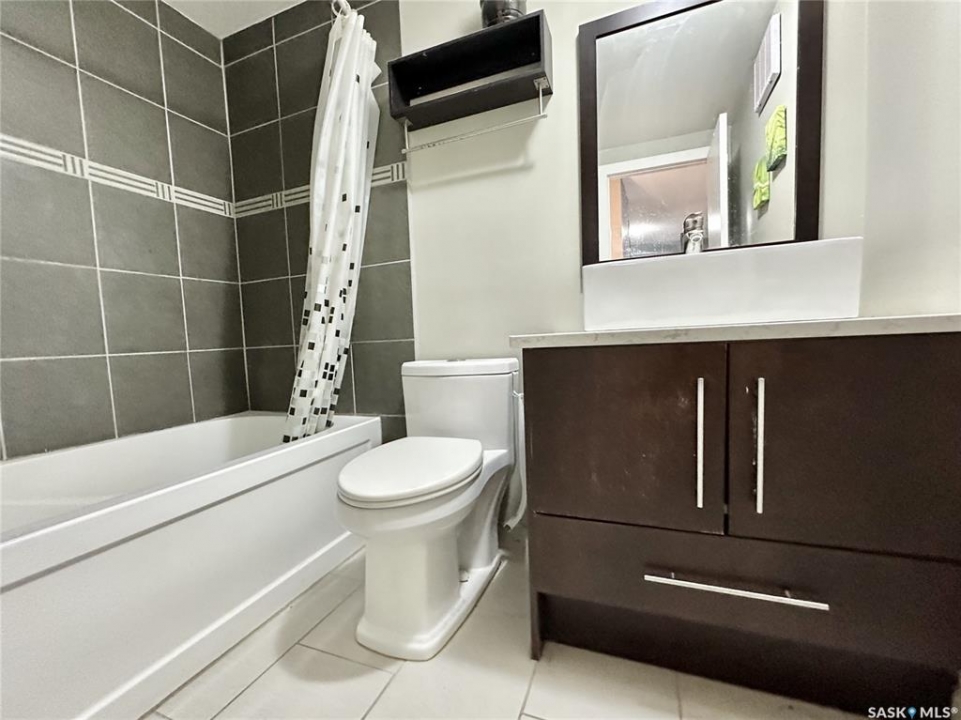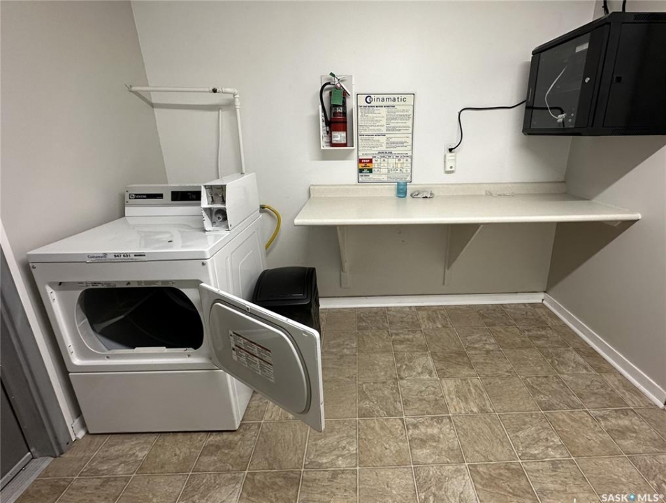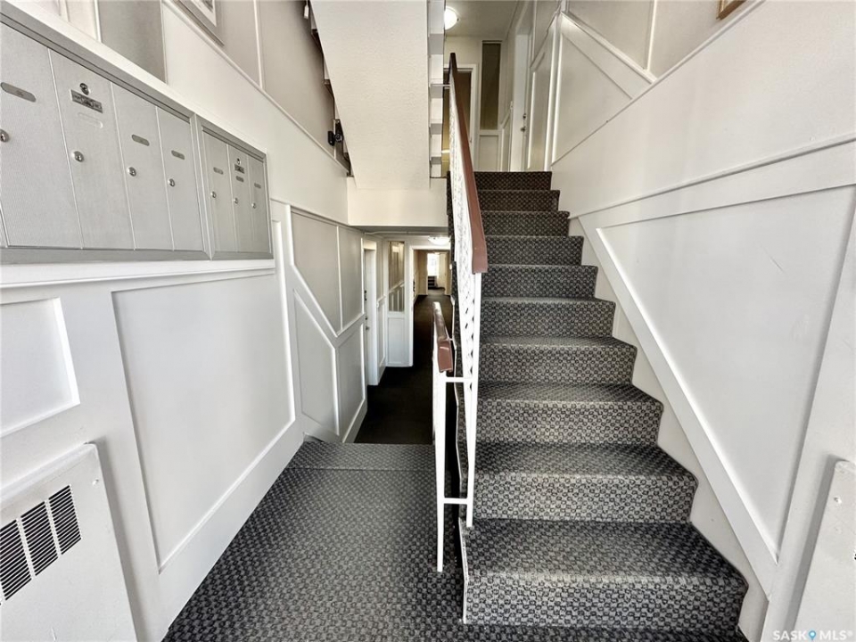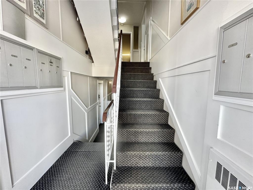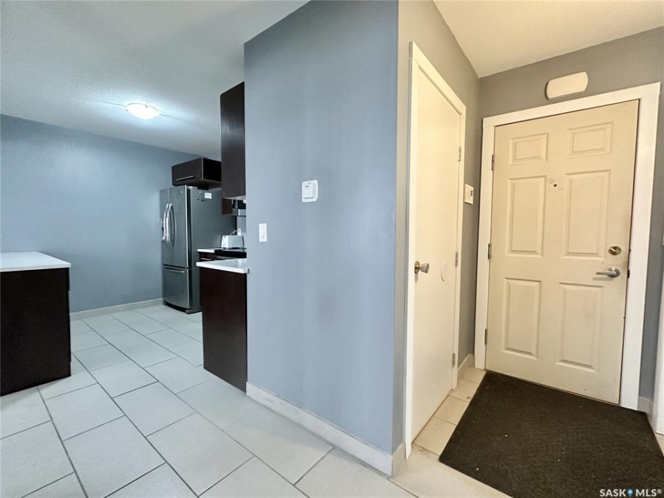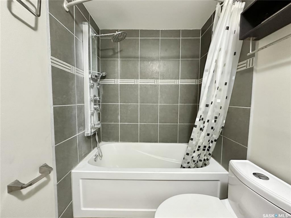 Walk to work or easy commute to any corner of Regina. Fabulous downtown condo. Clean quiet building. Located on the middle floor with a balcony and choice of in-suite laundry if desired. Shared laundry in lower level. Open kitchen and living room design. Espresso cabinetry with light stone counters and under-mount stainless steel sink. Stainless steel fridge, stove, built-in dishwasher and microwave hood fan all included. Extra large island has 6 storage drawers and room for stools. Cute balcony off the living room. Good-sized bedroom and full 4-piece bathroom. Bathroom has deep soaker tub, body jets and rain shower head with custom tile surround. In-suite storage unit has laundry hook up for stacking washer and dryer. Washer and dryer not included. Ceramic tile flooring throughout. Location is right for the downtown professional or to expand your revenue portfolio. All furniture and items are optional to stay. Just move in. Parking stall in rear of building.