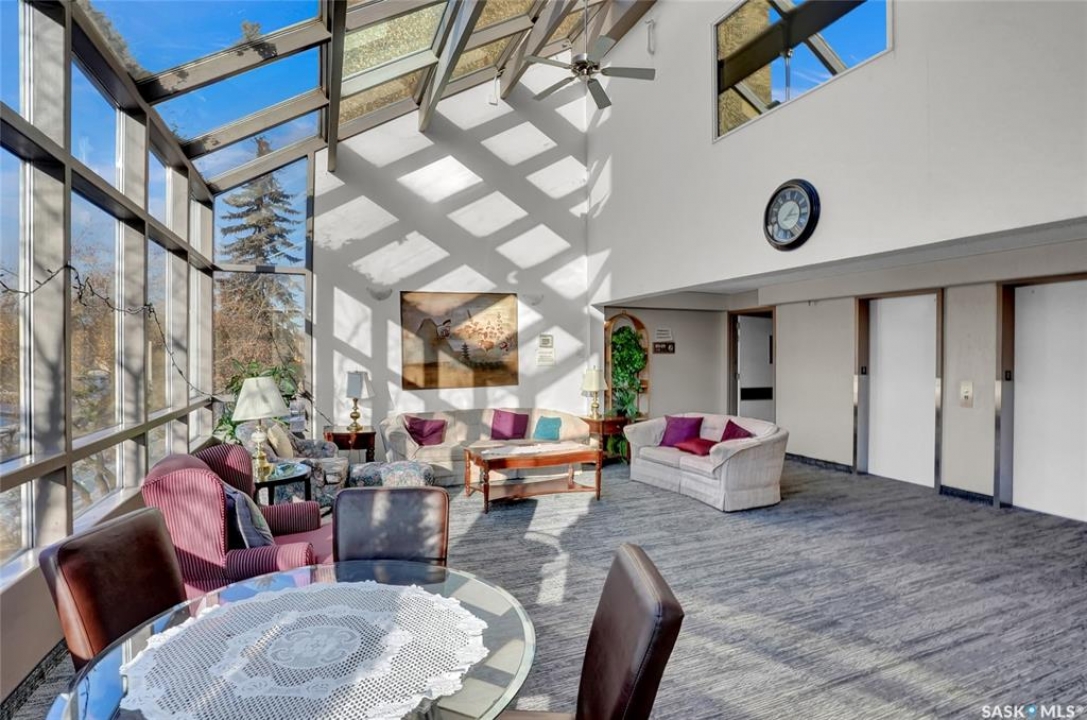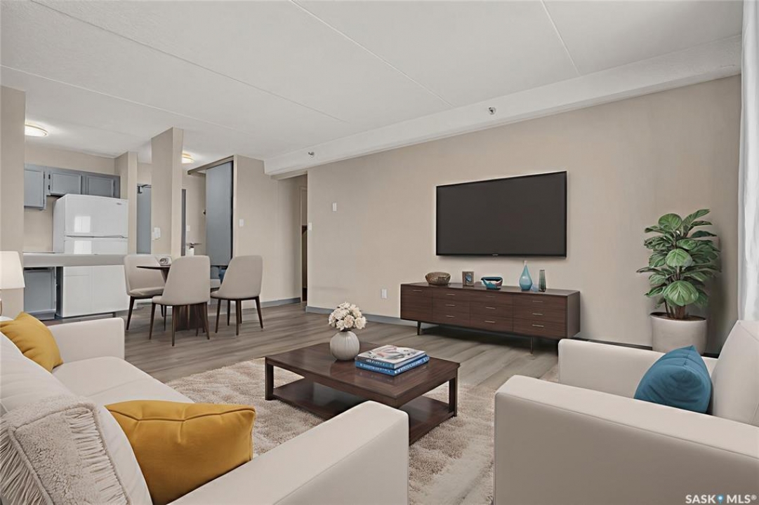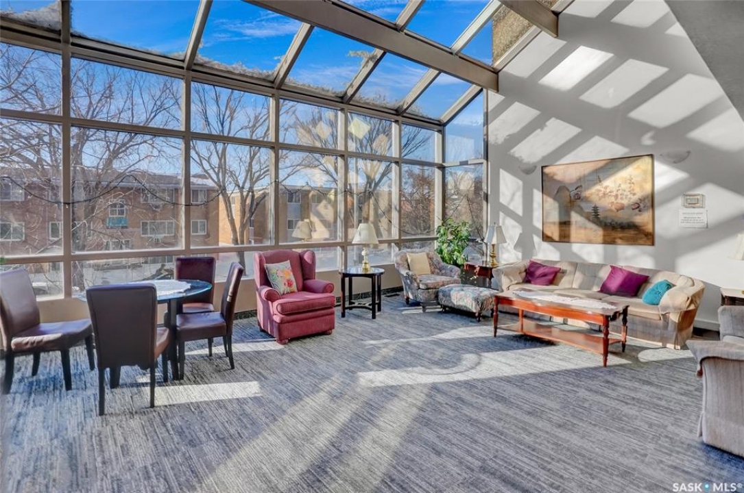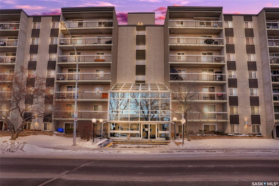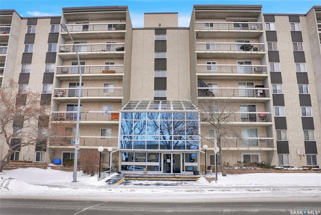 The Atrium Condo Complex, located in a fantastic Southwest area of Regina in Parliament Place is an extremely well-maintained 2 bedroom apartment-style condo that offers both convenience & comfort. Its proximity to shopping, restaurants, & medical clinics makes it an ideal spot for those who enjoy city living. Perfect for 1st time buyers, downsizing & investors. This desirable location & condo complex is constructed from concrete, ensuring security & quietness for all residents. Additionally, it offers various shared spaces such as an amenities room, Atrium lounge on the 2nd floor, an exercise area, visitor parking & common laundry rooms as well is wheelchair accessible w/elevator and underground parking. This unit is situated on the 5th floor and provides great views from its expansive balcony, making it perfect for enjoying summer evenings. Welcome new vinyl floor plank flooring that runs through the unit, creates a seamless connection in the open concept design. The living & formal dining areas enjoy large windows and patio doors to the balcony and are spacious. The dining area opens into the casual dining nook that connects to the galley style kitchen. All appliances are included. The kitchen even has a breakfast bar nook overlooking the living room which adds not only openness but extra workspace. Being one of the larger units in the building, there are 2 bedrooms with the primary bedroom boasting an oversized walk-in closet that offers additional storage space. Completing this unit is a 4pc. bath and a practical storage space which is perfect for pantry items. This condo combines practicality with elegance, making it a desirable choice for anyone looking to enjoy urban living with all the comforts of home in an affordable and prime location. (Some photos for Living, Dining and Bedrooms have been virtually staged to show space and possible furniture arrangements). CLICK ON THE MULTI MEDIA LINK FOR A FULL VISUAL TOUR and call today for a personal tour.