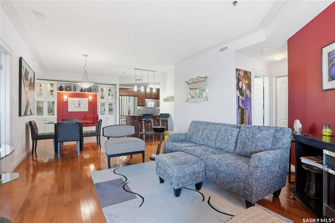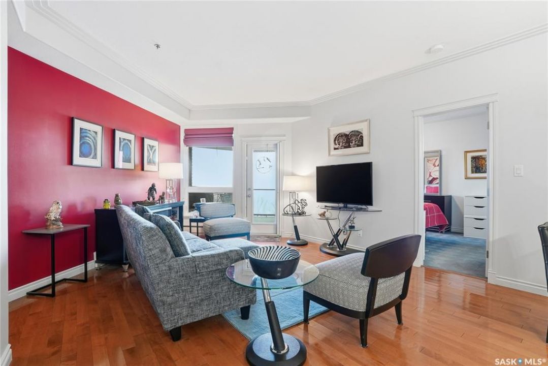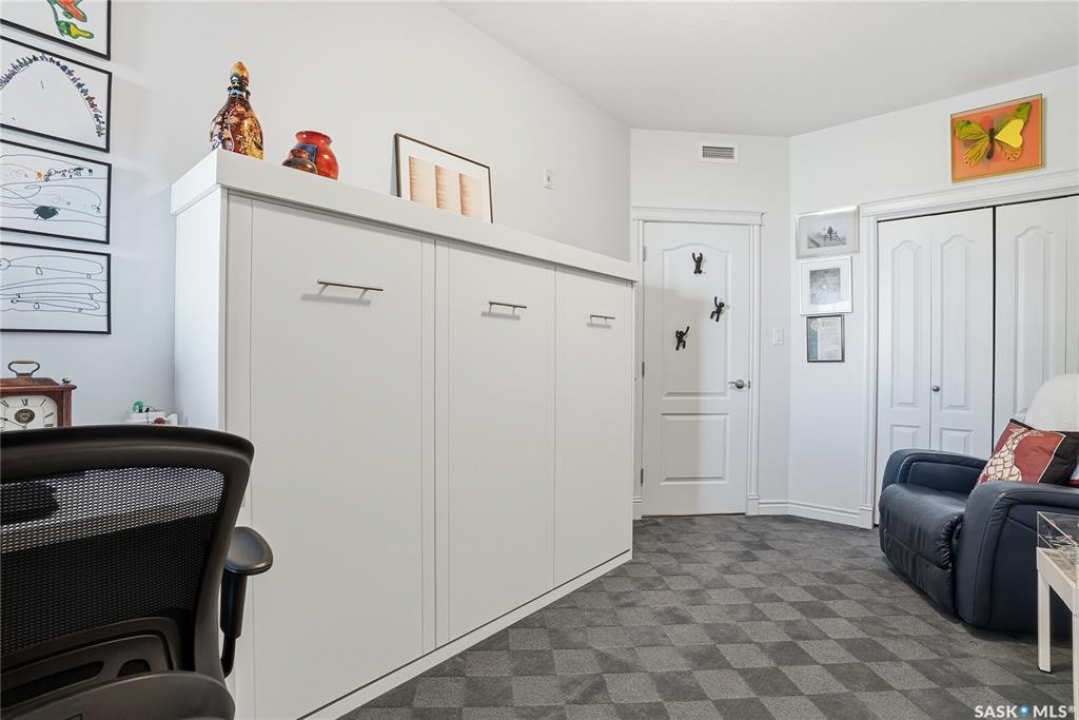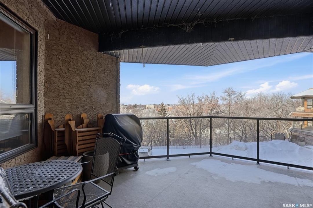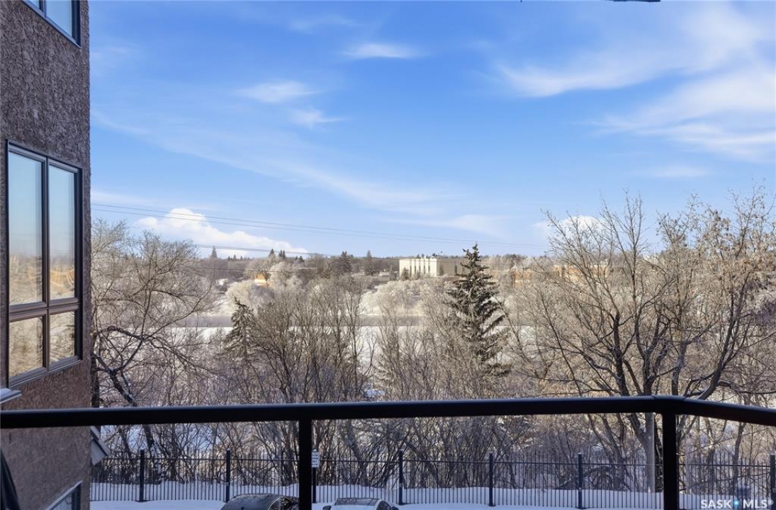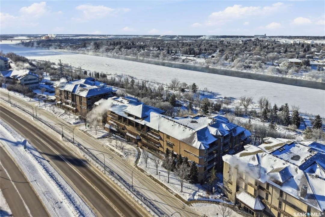 Perched along one of Saskatoon's most prestigious riverfront addresses on Saskatchewan Crescent West, this 1,079 sq ft executive condo offers a refined blend of calm, privacy, and uninterrupted views across the Meewasin Valley and South Saskatchewan River. Lovingly maintained by the original owner and lightly lived in (approximately four months per year), this home presents in mint condition, with timeless finishes that feel both elevated and enduring. Hardwood flooring and cabinetry, classic tile and grout, and custom built-in seating create a living space designed to be enjoyed fully and relaxed. The kitchen features stainless steel appliances and a thoughtful, functional layout with a large eat-up island that blends seamlessly into the open living and dining areas, ideal for quiet mornings or relaxed evenings at home. Two bedrooms and two bathrooms offer flexibility and comfort, including a river-facing primary suite with a walk-in closet and glass-enclosed walk-in shower. The second bedroom includes a beautiful custom Majestic-built Murphy bed and sits adjacent to a full 4-piece bathroom, making it equally suited to hosting guests or working from home. Central air conditioning, central vacuum, a retractable porch screen door, and underground parking add everyday ease, while the quiet, well-managed building offers premium amenities including a guest suite, amenities room, and exercise room. A refined riverfront lifestyle on where walkability, views, and understated luxury come together, this unit is sure to leave you feeling impressed. Located near nature, bus routes, downtown amenities, and the services on 8th St, you will love the accessibility and flexibility this home offers. Call your Realtor for your own exclusive tour now!