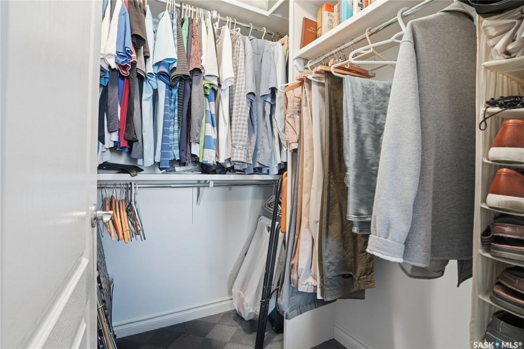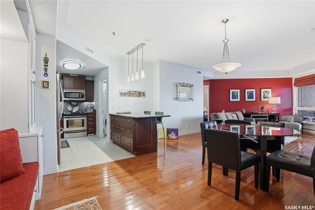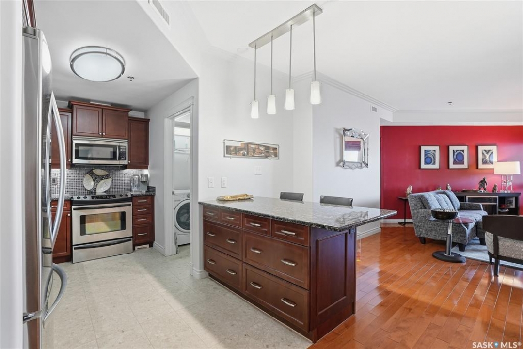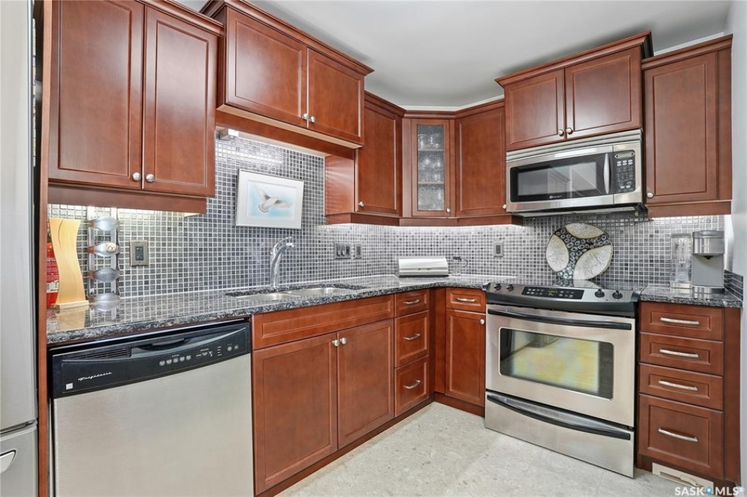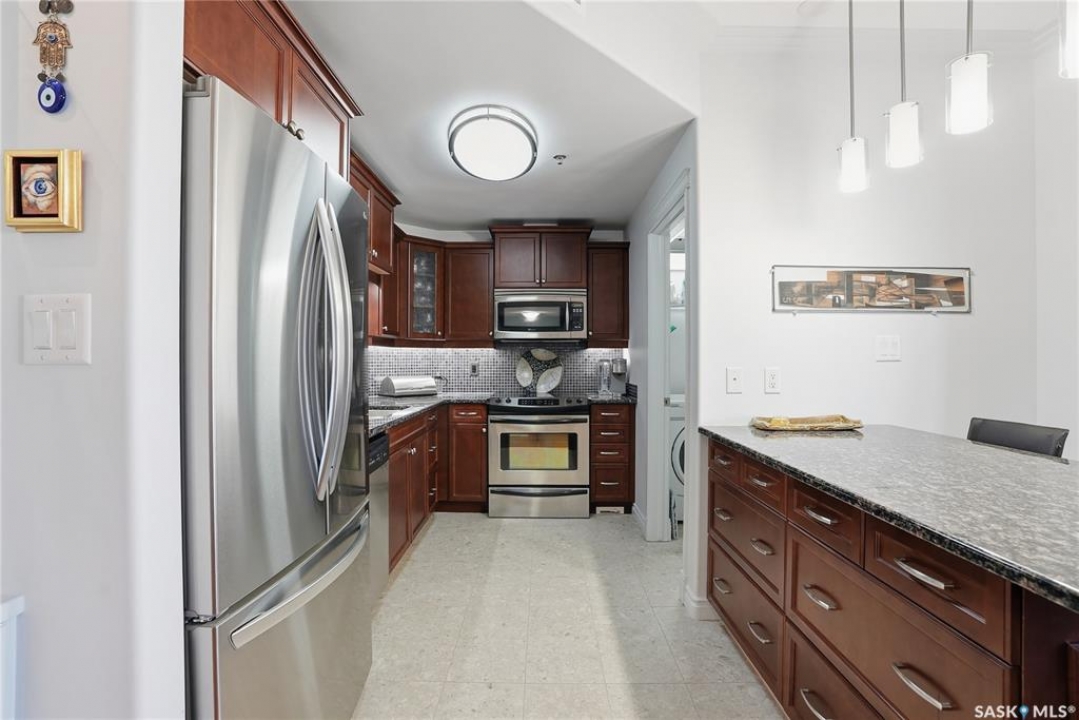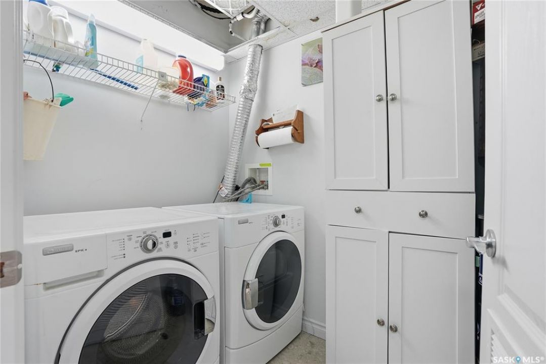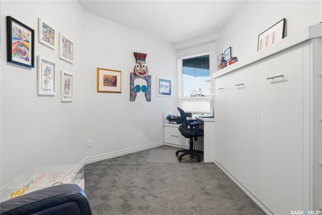 Perched along one of Saskatoon's most prestigious riverfront addresses on Saskatchewan Crescent West, this 1,079 sq ft executive condo offers a refined blend of calm, privacy, and uninterrupted views across the Meewasin Valley and South Saskatchewan River. Lovingly maintained by the original owner and lightly lived in (approximately four months per year), this home presents in mint condition, with timeless finishes that feel both elevated and enduring. Hardwood flooring and cabinetry, classic tile and grout, and custom built-in seating create a living space designed to be enjoyed fully and relaxed. The kitchen features stainless steel appliances and a thoughtful, functional layout with a large eat-up island that blends seamlessly into the open living and dining areas, ideal for quiet mornings or relaxed evenings at home. Two bedrooms and two bathrooms offer flexibility and comfort, including a river-facing primary suite with a walk-in closet and glass-enclosed walk-in shower. The second bedroom includes a beautiful custom Majestic-built Murphy bed and sits adjacent to a full 4-piece bathroom, making it equally suited to hosting guests or working from home. Central air conditioning, central vacuum, a retractable porch screen door, and underground parking add everyday ease, while the quiet, well-managed building offers premium amenities including a guest suite, amenities room, and exercise room. A refined riverfront lifestyle on where walkability, views, and understated luxury come together, this unit is sure to leave you feeling impressed. Located near nature, bus routes, downtown amenities, and the services on 8th St, you will love the accessibility and flexibility this home offers. Call your Realtor for your own exclusive tour now!
