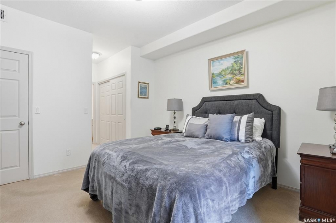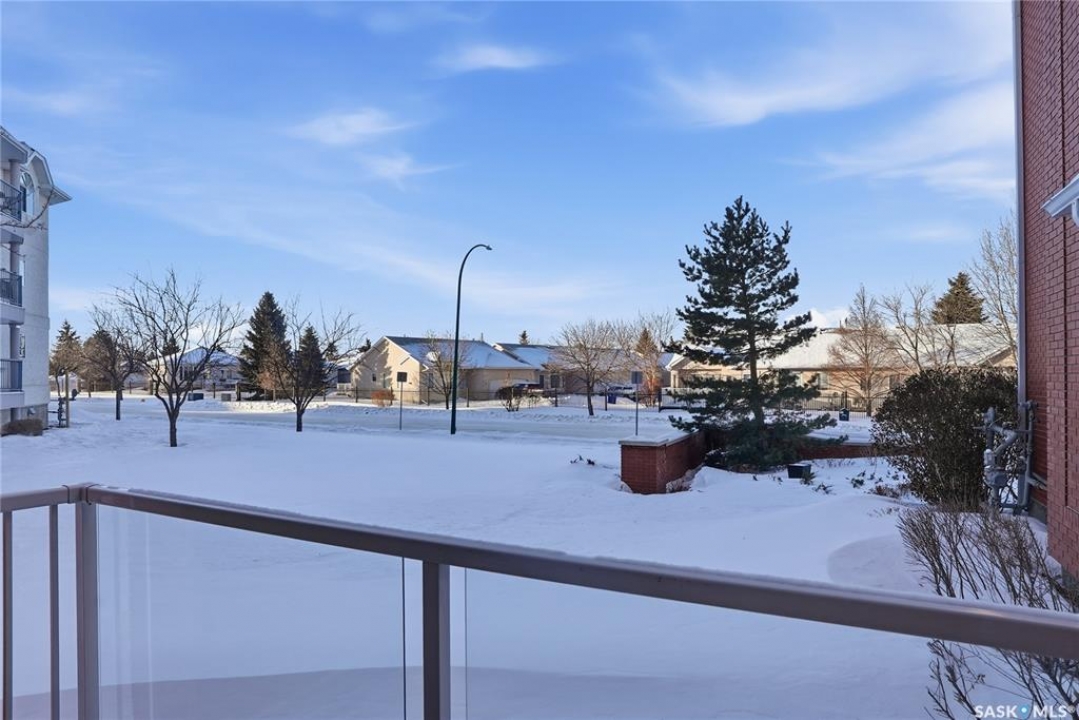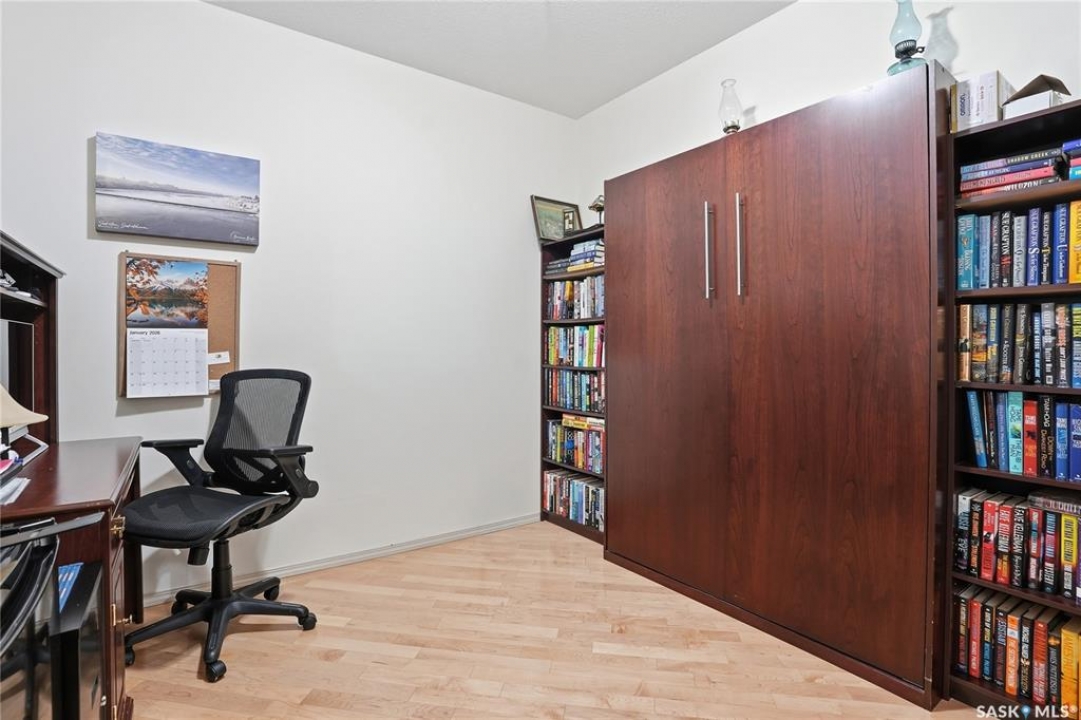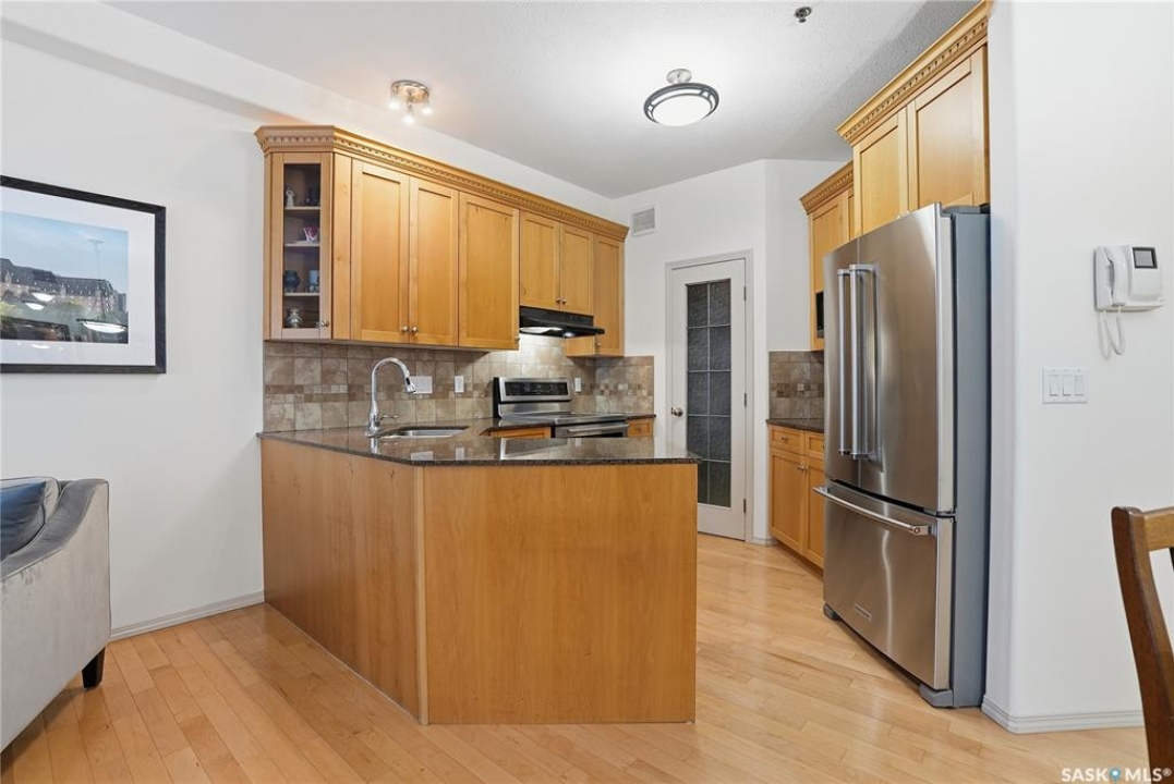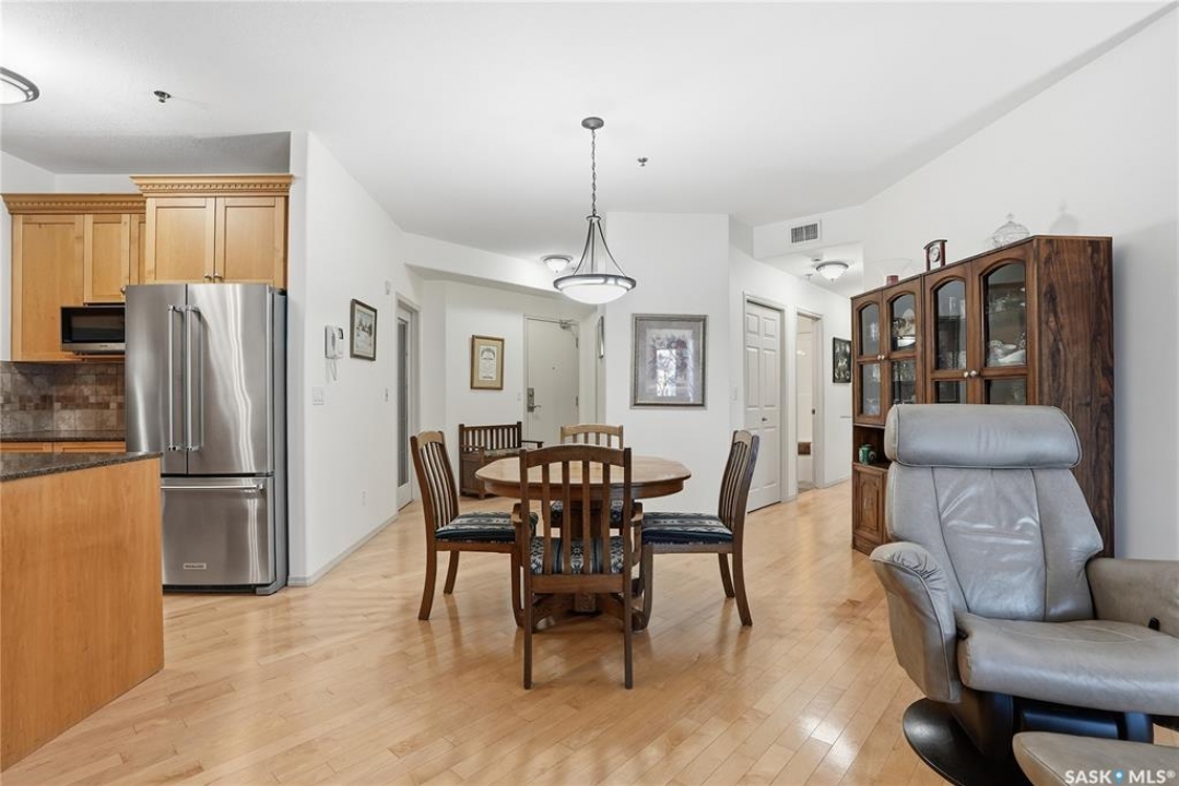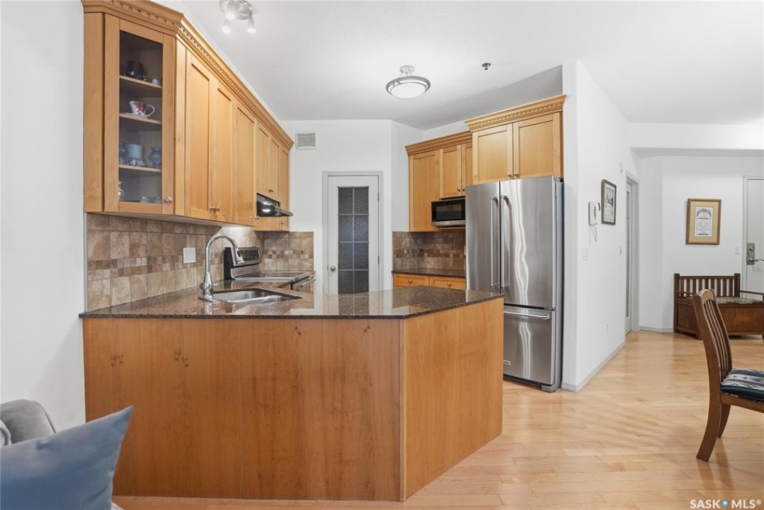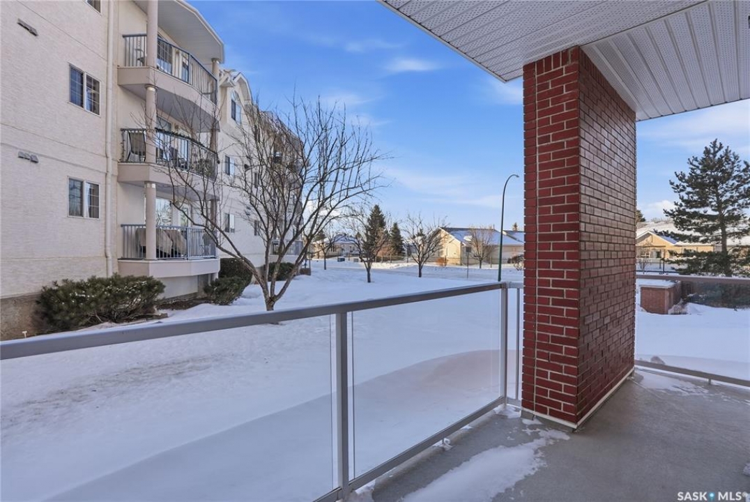 Welcome to Unit #112 at 928 Heritage View, ideally situated in the highly sought-after Wildwood neighborhood. This prime location offers easy access to scenic walking paths, nearby parks, and convenient routes to 8th Street and Circle Drive. This former show home is a main-floor unit that showcases quality finishes throughout, including beautiful newer maple hardwood flooring, 9-foot ceilings, and a bright open-concept layout. Upon entry, you're greeted by a front closet and a dedicated laundry room complete with an LG washer and dryer. The versatile office/den is perfect for additional guests or a work-from-home setup. The kitchen is thoughtfully designed with ample maple cabinetry accented by crown molding, stainless steel KitchenAid appliances, a pantry, tile backsplash, and a peninsula island offering additional seating. The kitchen flows seamlessly into the living room, which provides direct access to a southwest-facing wraparound Duradek balcony featuring two storage rooms—ideal for enjoying outdoor space and extra storage. The spacious primary bedroom offers abundant natural light and a walk-through double closet leading to a private 3-piece ensuite. The ensuite has been tastefully updated with a glass shower, luxury vinyl flooring, newer quartz countertop, newer toilet, and linen closet. An additional generously sized bedroom, a 4-piece bathroom with newer quartz vanity, newer luxury vinyl flooring, and tub/shower complete the interior. This unit includes one surface parking stall and one underground stall with additional caged storage. Residents enjoy access to an amenities room, exercise room, lounge, and ample visitor parking. Meticulously maintained by the original owner, this beautiful home is truly move-in ready and a must-see.