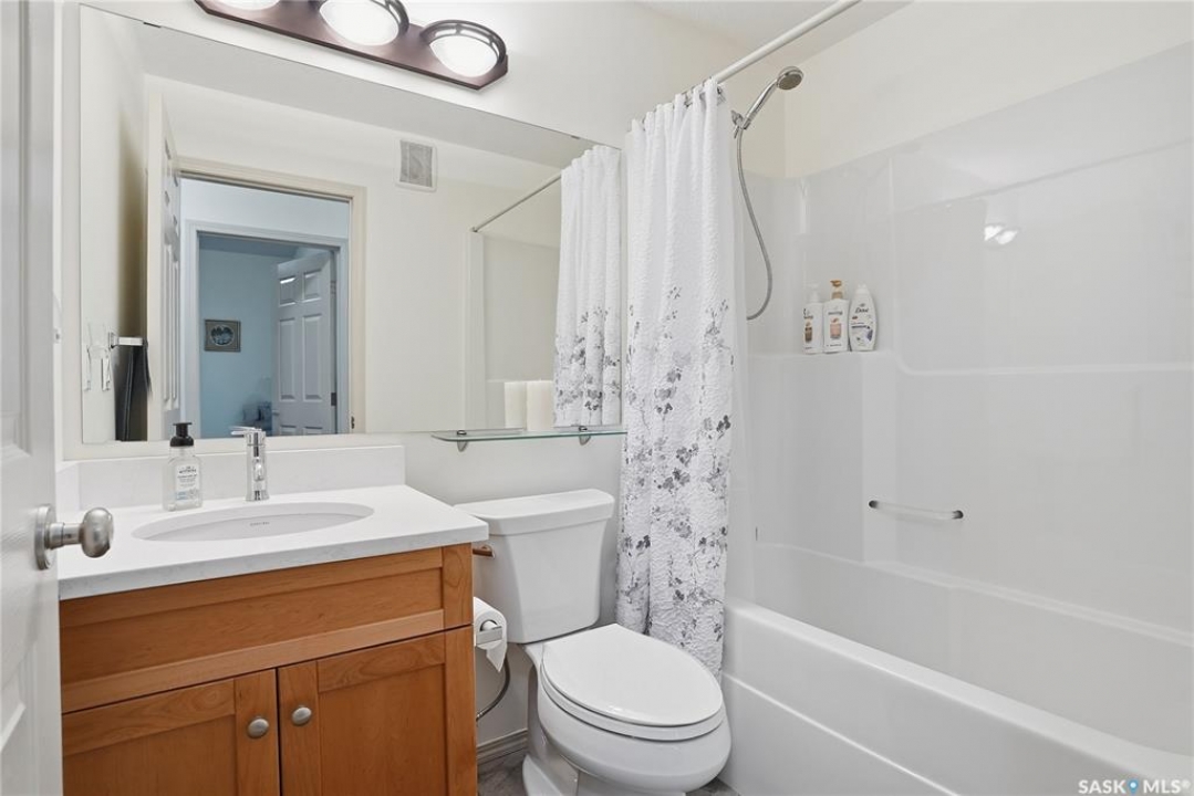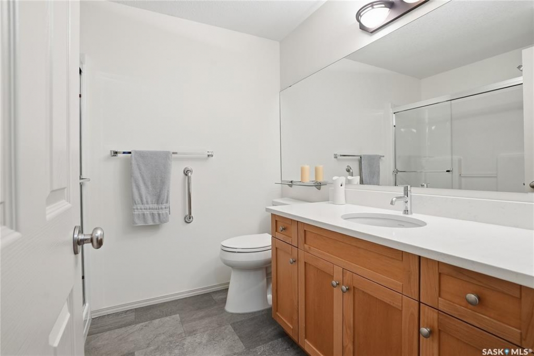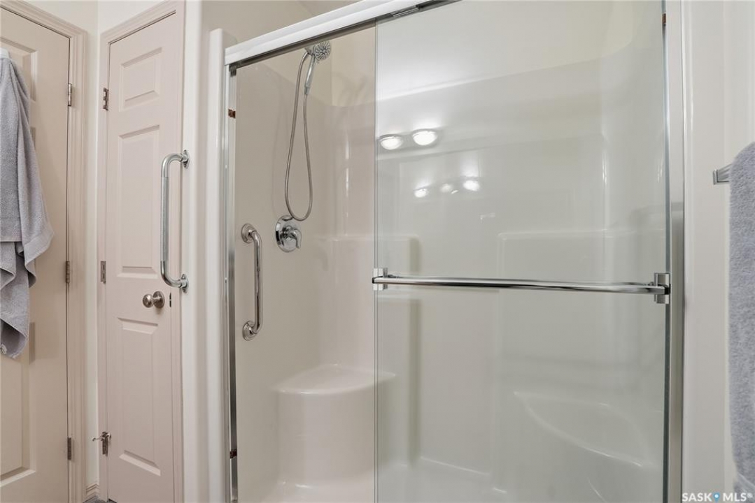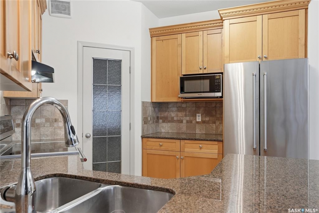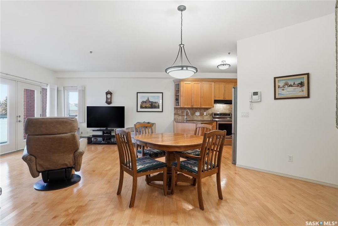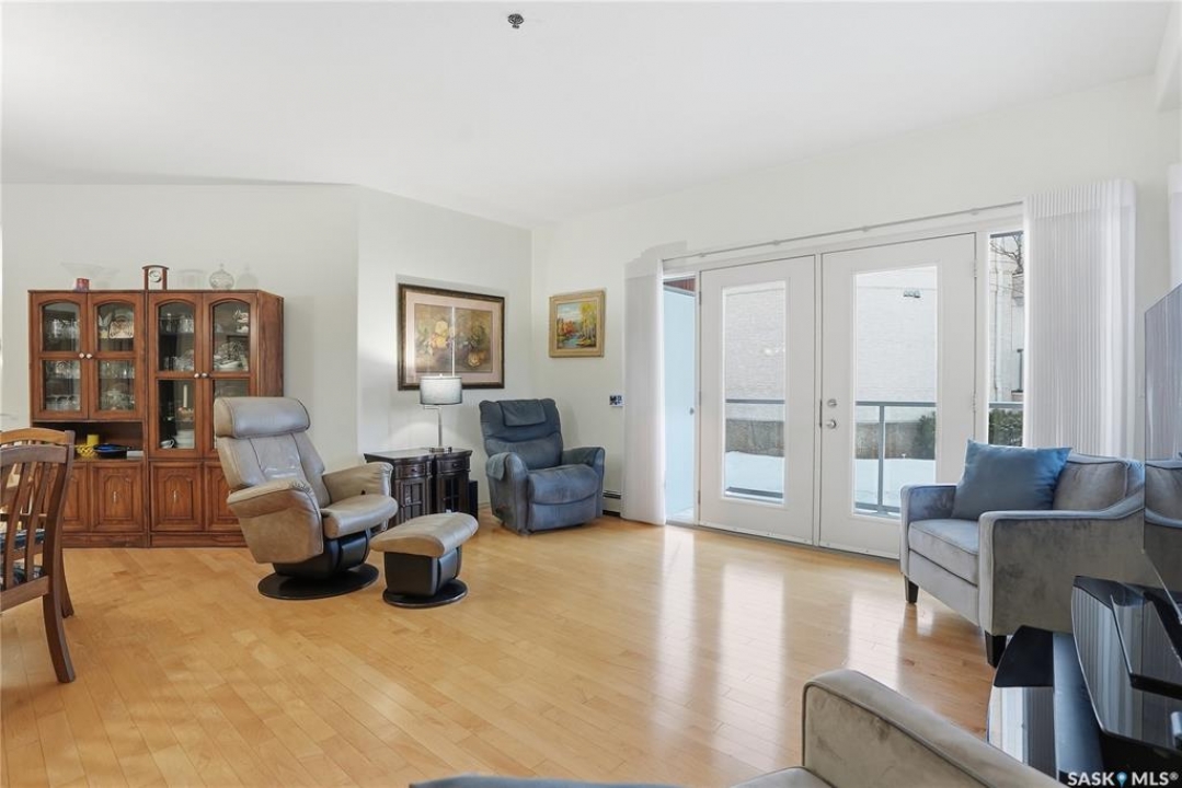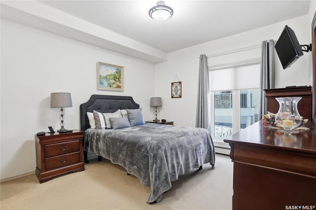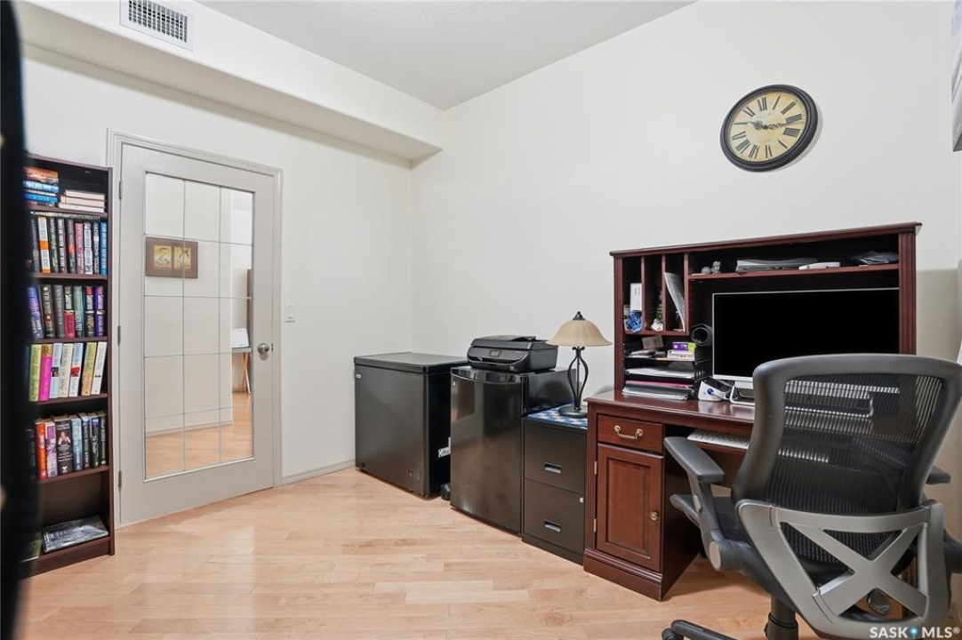 Welcome to Unit #112 at 928 Heritage View, ideally situated in the highly sought-after Wildwood neighborhood. This prime location offers easy access to scenic walking paths, nearby parks, and convenient routes to 8th Street and Circle Drive. This former show home is a main-floor unit that showcases quality finishes throughout, including beautiful newer maple hardwood flooring, 9-foot ceilings, and a bright open-concept layout. Upon entry, you're greeted by a front closet and a dedicated laundry room complete with an LG washer and dryer. The versatile office/den is perfect for additional guests or a work-from-home setup. The kitchen is thoughtfully designed with ample maple cabinetry accented by crown molding, stainless steel KitchenAid appliances, a pantry, tile backsplash, and a peninsula island offering additional seating. The kitchen flows seamlessly into the living room, which provides direct access to a southwest-facing wraparound Duradek balcony featuring two storage rooms—ideal for enjoying outdoor space and extra storage. The spacious primary bedroom offers abundant natural light and a walk-through double closet leading to a private 3-piece ensuite. The ensuite has been tastefully updated with a glass shower, luxury vinyl flooring, newer quartz countertop, newer toilet, and linen closet. An additional generously sized bedroom, a 4-piece bathroom with newer quartz vanity, newer luxury vinyl flooring, and tub/shower complete the interior. This unit includes one surface parking stall and one underground stall with additional caged storage. Residents enjoy access to an amenities room, exercise room, lounge, and ample visitor parking. Meticulously maintained by the original owner, this beautiful home is truly move-in ready and a must-see.