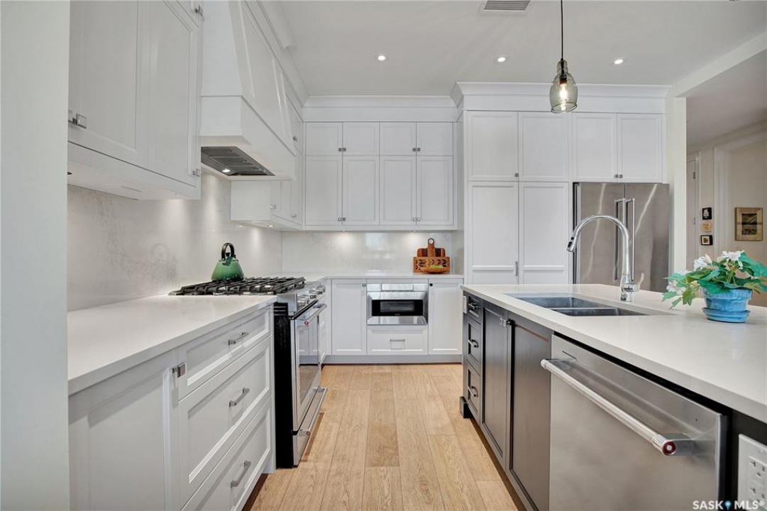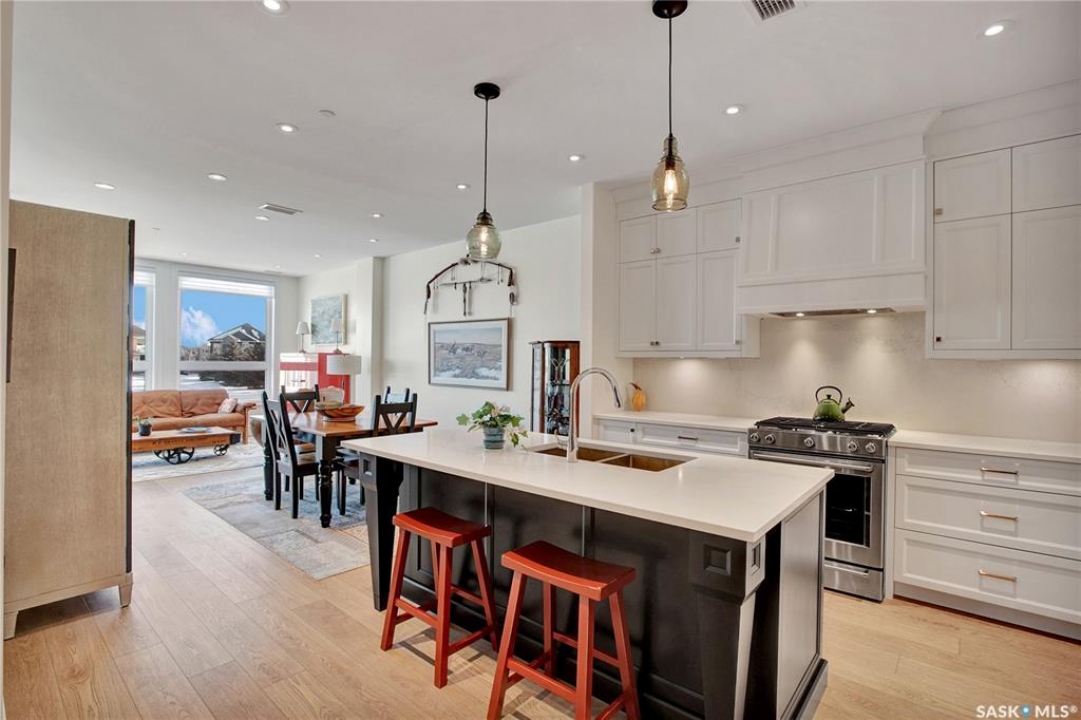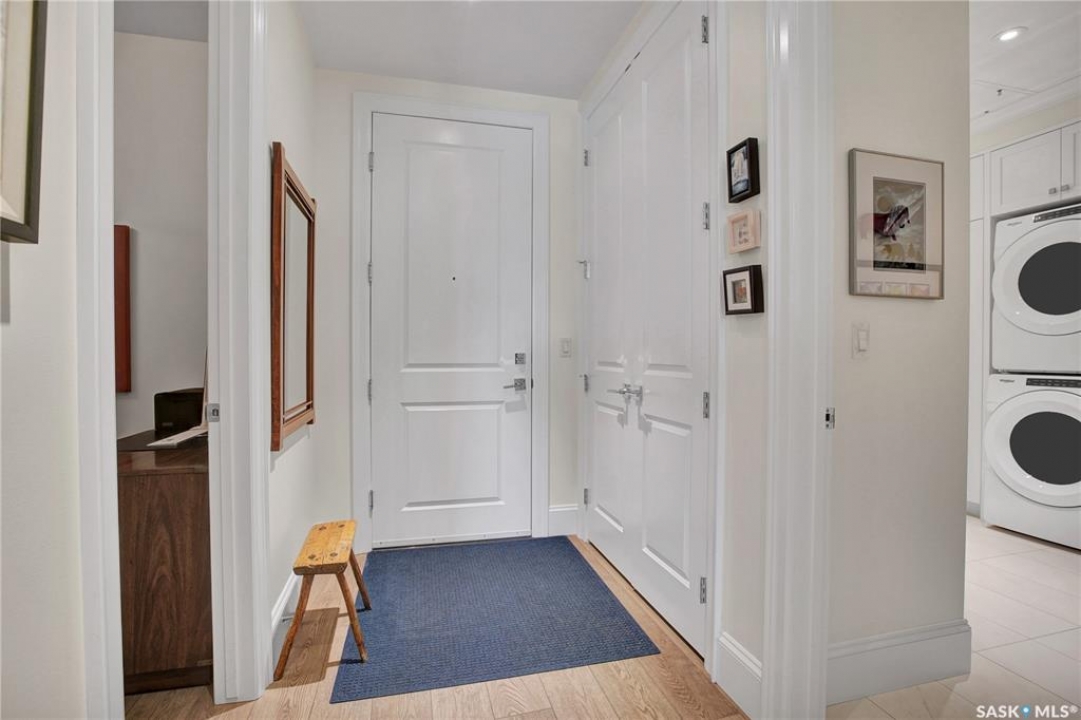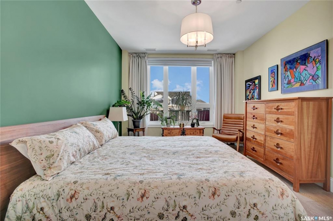Welcome to The 408 Private Residence Building in The Willows, where luxury meets lifestyle. This immaculate, east-facing suite offers a private balcony with greenspace views, perfect for enjoying peaceful morning sunrise coffee. Designed for both comfort and sophistication, this residence features 2 spacious bedrooms plus a den, ideal for a home office or quiet retreat. The open-concept living space is complemented by designer decor, custom cabinetry, stone countertops, and high-end appliances, creating an elegant yet welcoming atmosphere for everyday living and entertaining. The primary suite is a true retreat, complete with a walk-in closet and a beautifully finished ensuite. Additional highlights include a large laundry room, concrete construction for exceptional privacy, underground storage, and two parking stalls—one underground and one surface. Located in the heart of The Willows, this condo offers a coveted lifestyle with easy access to golf, walking paths, and amenities—perfect for those seeking quiet elegance, convenience, and an elevated standard of living.