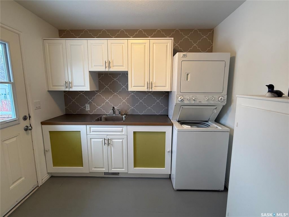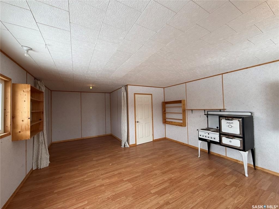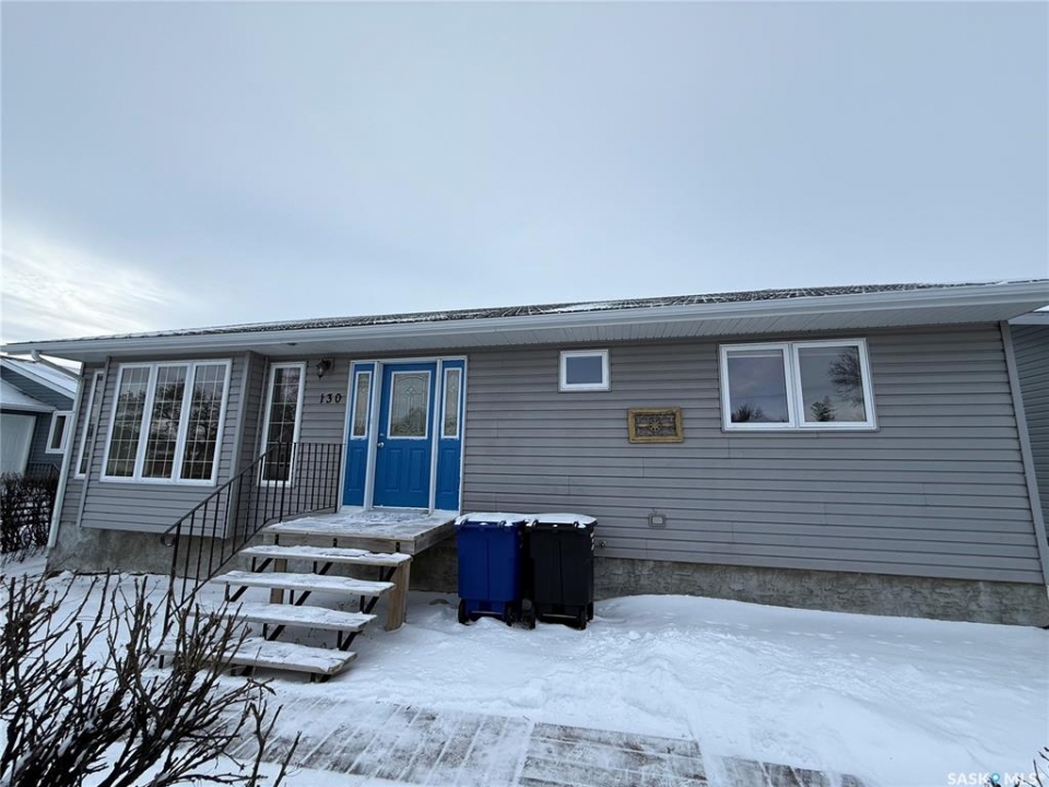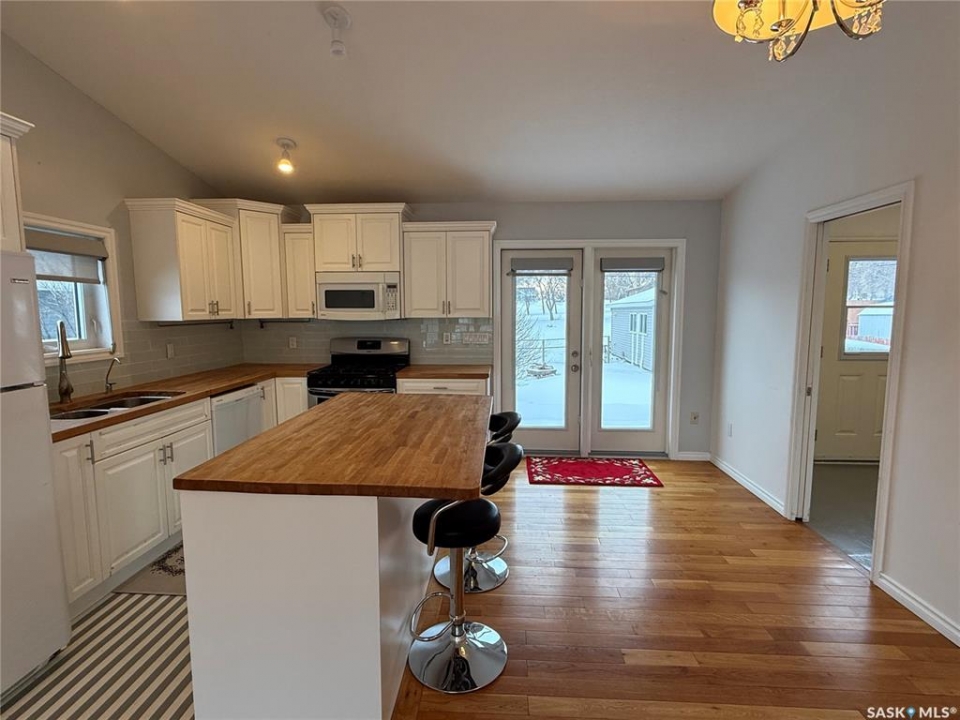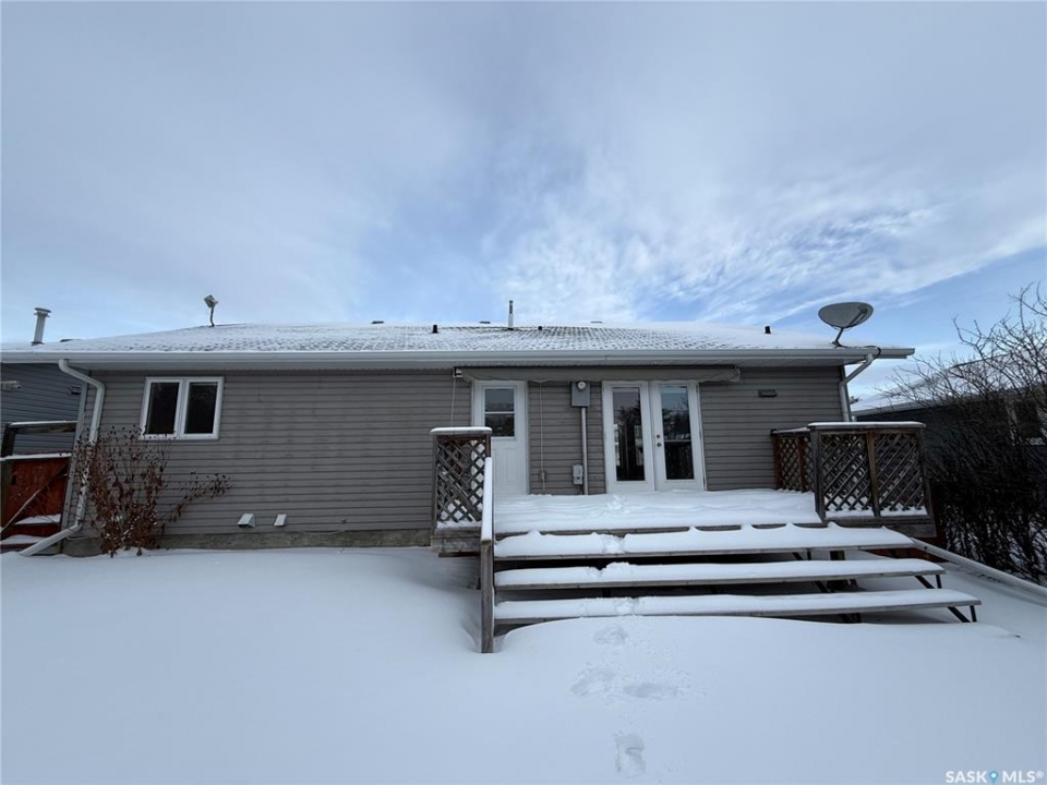 130 2nd Ave SE, Eston. Welcome to this well-maintained 2008 bungalow offering 1,208 sq. ft. on the main level. Step onto the inviting front porch and into a spacious living room with vaulted ceilings, creating an open and airy feel. The open-concept layout flows seamlessly into the kitchen and dining area, perfect for everyday living and entertaining. The kitchen features white cabinetry, butcher block countertops, a pantry, and a large island with drawers and seating. Hardwood floors run throughout the main living spaces, and the dining area includes patio doors leading to a generous 20' x 15' back deck. The fully fenced yard provides great outdoor space for kids, pets, or relaxing. At the back of the home, you'll find a functional porch area with laundry and utilities, complete with a sink and built-in cupboards. Down the hall is a versatile office or den, a storage room with access to the crawl space, and two bedrooms. The primary bedroom is a comfortable space with a large closet and a 4-piece ensuite featuring a white tile shower and tile flooring. A 3-piece main bathroom and second bedroom complete the layout. Additional features include in-floor heating, a large 24' x 16' shed, and a thoughtfully designed floor plan that maximizes space and functionality. Call today for more information and to schedule your tour of this property!