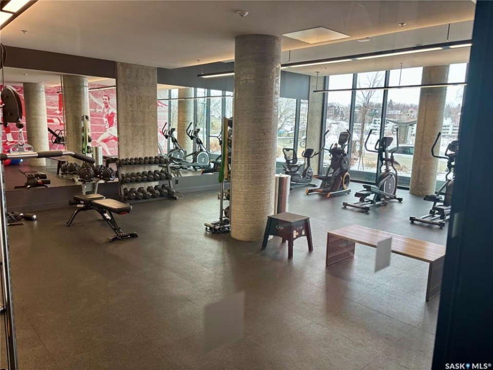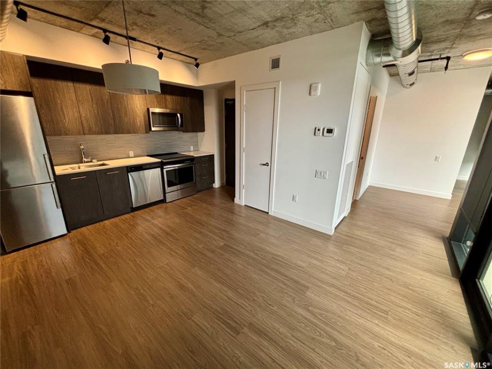 Welcome to Unit 804 at 490 2nd Ave S. This bright 1-bedroom, 1-bathroom condo sits on the 8th floor of a sought-after riverfront building, offering beautiful views and abundant natural light. The suite features quartz countertops, in-suite laundry, and one underground heated parking stall. Residents enjoy access to a fitness centre overlooking the river, a spacious amenities room, and elevator access. A perfect blend of comfort, convenience, and location. The nook refers to space in hall which will fit a small desk and office set up!