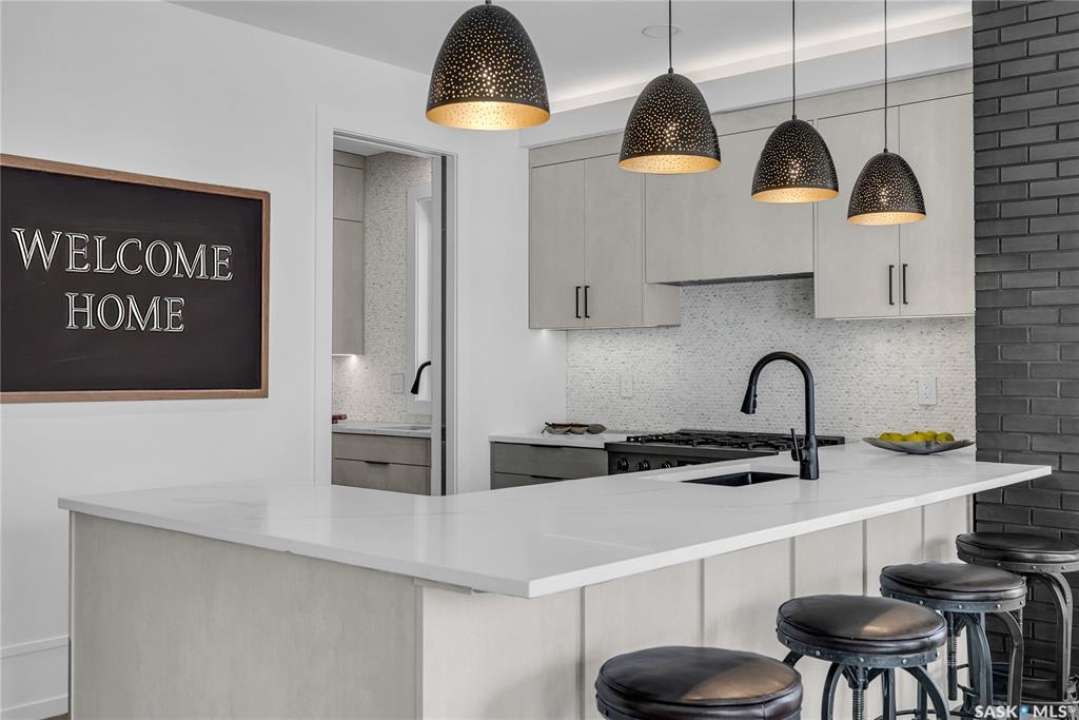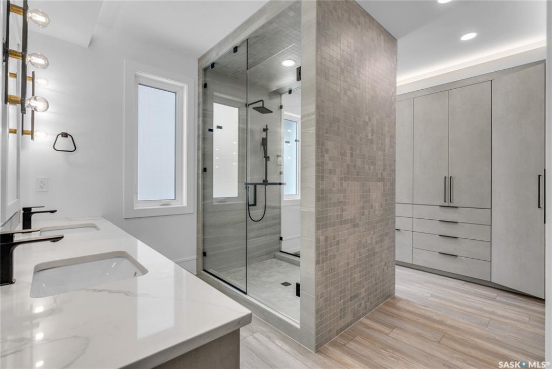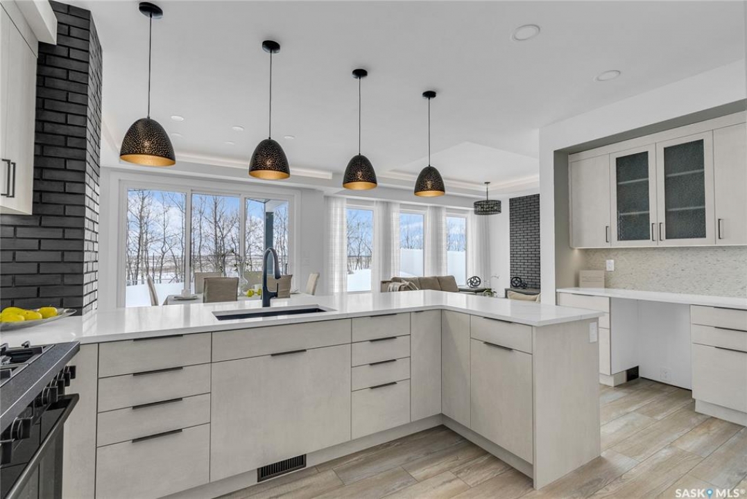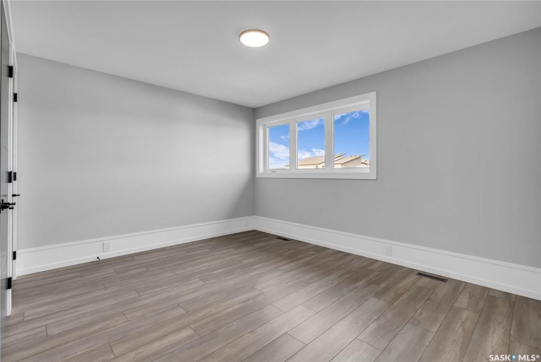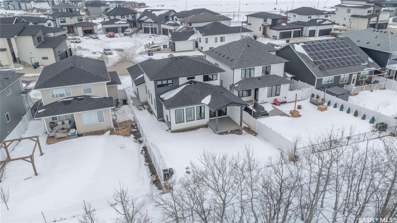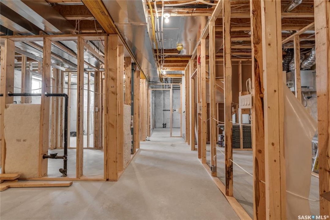 Homes by Norwood located at 428 Woolf Bend in Saskatoon's Aspen Ridge, featuring luxury finishes and expert craftsmanship. The spacious foyer welcomes you, stained wood railings and glass staircase inserts lead to 2nd floor. Engineered Vinyl Plank flooring throughout home. The main floor boasts 8' interior doors, 9' ceilings with LED-lit tray designs, a great room with a brick feature wall, large south-facing windows, and a dining area with sliding doors to a 12'x12' covered deck. The gourmet kitchen includes modern cabinetry, a 6-burner gas convection range, warming tray, range hood, LED strip lighting, tile backsplash, quartz countertops, and a peninsula bar, with an adjoining butler's pantry offering a fridge/freezer, dishwasher, microwave, prep sink, spice rack, and ample storage. The primary bedroom features a custom feature wall and insulated walls for sound comfort, while the ensuite offers dual vanities, a custom walk-in shower, abundant storage, a stacking washer/dryer, and a private commode. Additional main-floor spaces include a 2-piece powder room and mudroom with extensive storage. The second floor has three large bedrooms with interior insulated walls, a second laundry room with a sink, and a split main bathroom with dual vanities, a soaker tub/shower with tile, and separate lavatory. The basement's exterior walls are framed, insulated, and wired, with interior walls framed and wired as well. Mechanical features include a high-efficiency furnace with zoned heating and thermostats on each floor, a power vent hot water heater with a circulating pump, an HRV system, central air, and 200-amp electrical service. The 27'W x 26'D double attached garage is insulated, wired, drywalled, has LED lighting, and is nearly 14' high for future car lifts. The exterior features Hardie board siding, composite finishes, and a maintenance-free covered deck with a privacy wall and natural gas outlet. Enjoy breathtaking south views of Kernen Prairie—schedule a viewing today