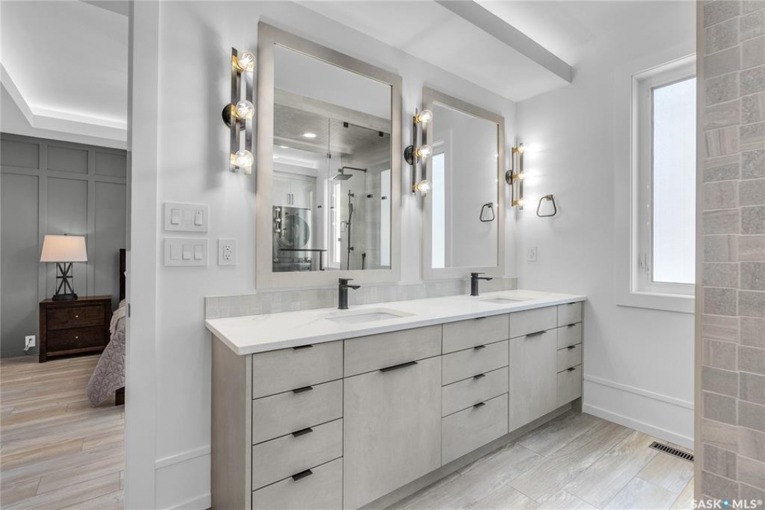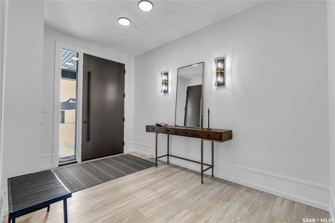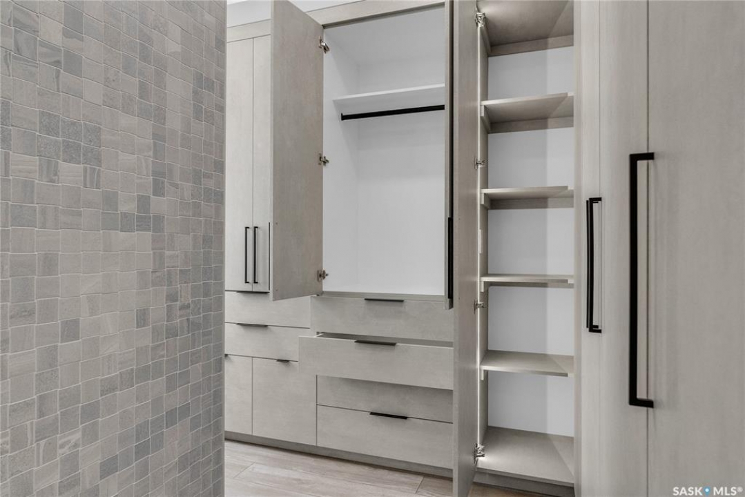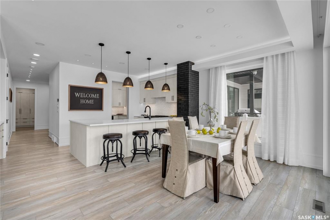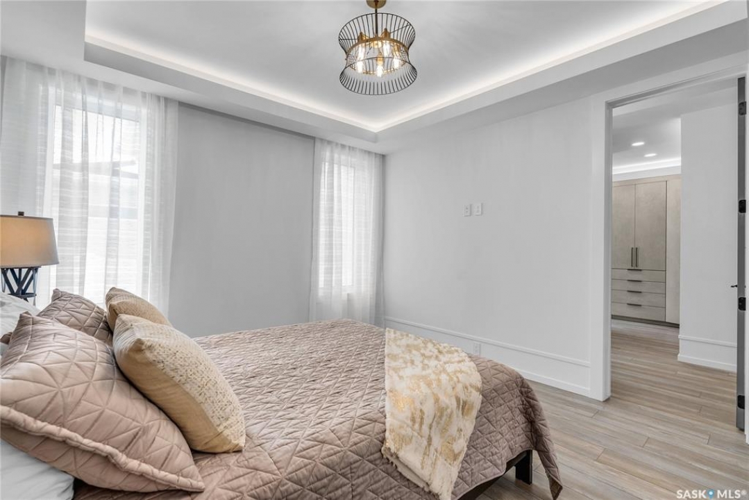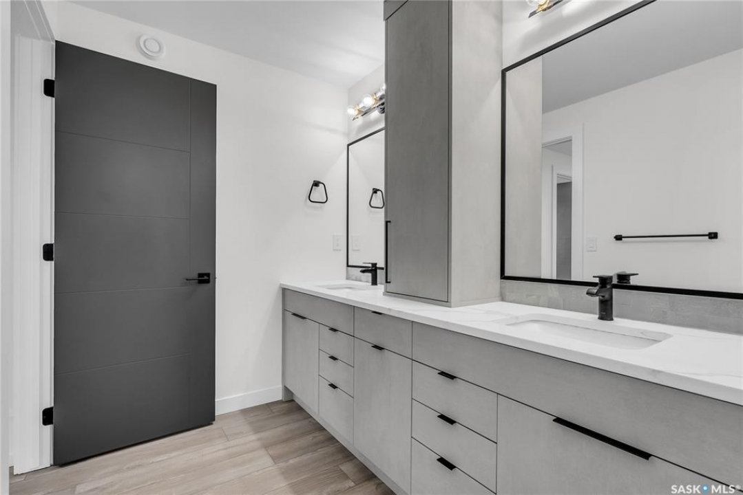 Homes by Norwood located at 428 Woolf Bend in Saskatoon's Aspen Ridge, featuring luxury finishes and expert craftsmanship. The spacious foyer welcomes you, stained wood railings and glass staircase inserts lead to 2nd floor. Engineered Vinyl Plank flooring throughout home. The main floor boasts 8' interior doors, 9' ceilings with LED-lit tray designs, a great room with a brick feature wall, large south-facing windows, and a dining area with sliding doors to a 12'x12' covered deck. The gourmet kitchen includes modern cabinetry, a 6-burner gas convection range, warming tray, range hood, LED strip lighting, tile backsplash, quartz countertops, and a peninsula bar, with an adjoining butler's pantry offering a fridge/freezer, dishwasher, microwave, prep sink, spice rack, and ample storage. The primary bedroom features a custom feature wall and insulated walls for sound comfort, while the ensuite offers dual vanities, a custom walk-in shower, abundant storage, a stacking washer/dryer, and a private commode. Additional main-floor spaces include a 2-piece powder room and mudroom with extensive storage. The second floor has three large bedrooms with interior insulated walls, a second laundry room with a sink, and a split main bathroom with dual vanities, a soaker tub/shower with tile, and separate lavatory. The basement's exterior walls are framed, insulated, and wired, with interior walls framed and wired as well. Mechanical features include a high-efficiency furnace with zoned heating and thermostats on each floor, a power vent hot water heater with a circulating pump, an HRV system, central air, and 200-amp electrical service. The 27'W x 26'D double attached garage is insulated, wired, drywalled, has LED lighting, and is nearly 14' high for future car lifts. The exterior features Hardie board siding, composite finishes, and a maintenance-free covered deck with a privacy wall and natural gas outlet. Enjoy breathtaking south views of Kernen Prairie—schedule a viewing today