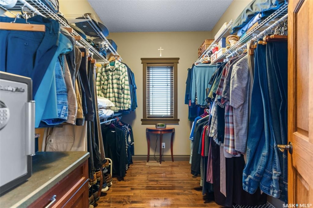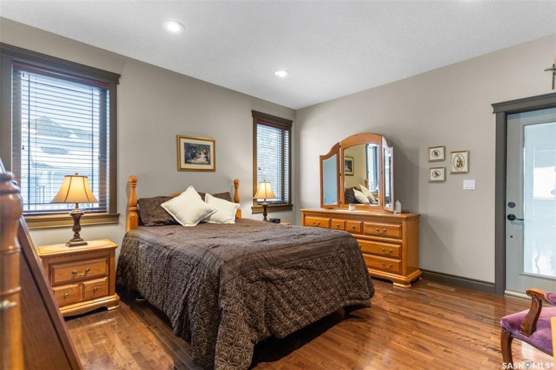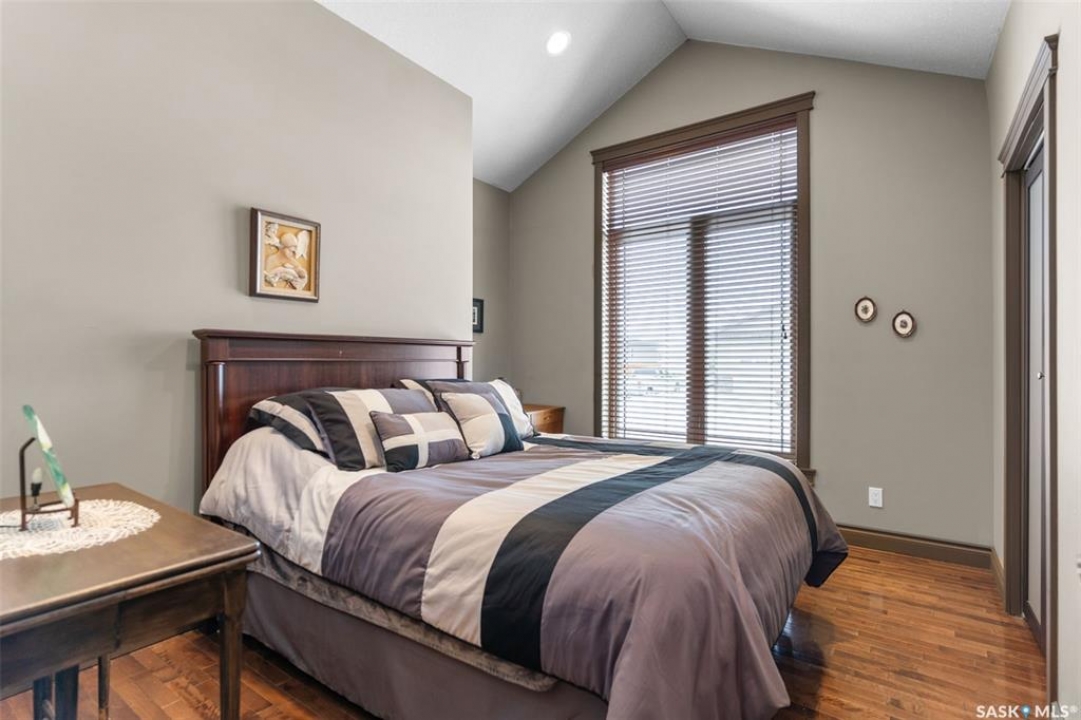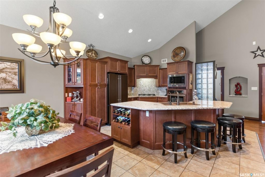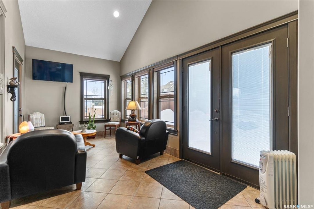 Step into this sophisticated luxury home where exceptional craftsmanship and high-end finishes create an atmosphere of refined elegance. This impressive 4-bedroom, 4-bathroom residence welcomes you with a grand foyer and stylish French doors that open into the main living area. At the heart of the home is a stunning living space featuring soaring vaulted ceilings and a striking double-sided fireplace, offering both warmth and architectural impact. The open-concept design flows seamlessly into a chef-inspired kitchen outfitted with top-of-the-line Jenn-Air appliances, rich maple cabinetry, a large central island, and luxurious granite countertops with a matching granite sink. The bright and inviting dining area easily accommodates a full-sized table and is enhanced by thoughtfully placed skylights that flood the home with natural light. A gorgeous sunroom, complete with its own fireplace and direct access to the backyard, provides a cozy year-round retreat. The main floor hosts three generously sized bedrooms, including a luxurious primary suite featuring a spacious walk-in closet and a spa-like 5-piece ensuite with a jetted tub, separate shower, and elegant vanity. A second 3-piece bathroom offers added convenience, along with a well-appointed laundry room that includes a 2-piece bath and tiled flooring. Upstairs, a versatile bonus room with hardwood floors and an electric fireplace offers endless possibilities—ideal for a relaxing lounge, home office, or games room with picturesque views. The partially finished basement includes a fourth bedroom, a 3-piece bathroom, a utility room, and a large heated crawl space with concrete flooring, providing excellent storage options. Outside, enjoy the beautifully landscaped yard featuring a garden shed, fenced areas for added privacy, and a spacious deck with pergola. Additional highlights include a heated double attached garage with direct entry, ample parking, and only 20 mins. from BHP Mine and 30 mins. to Humboldt.