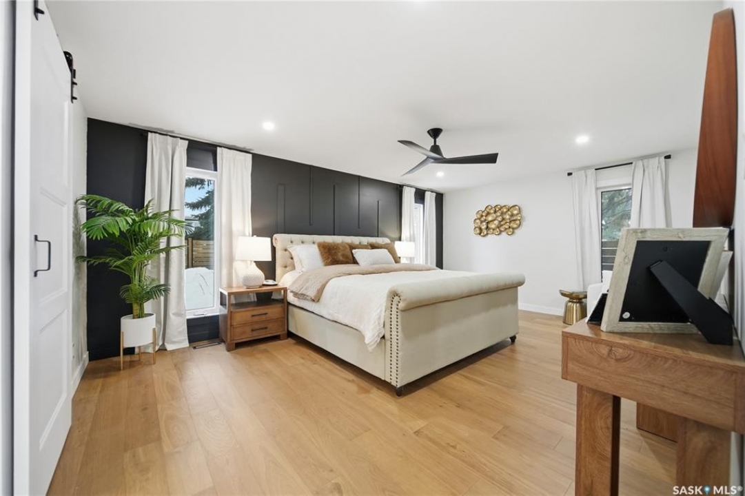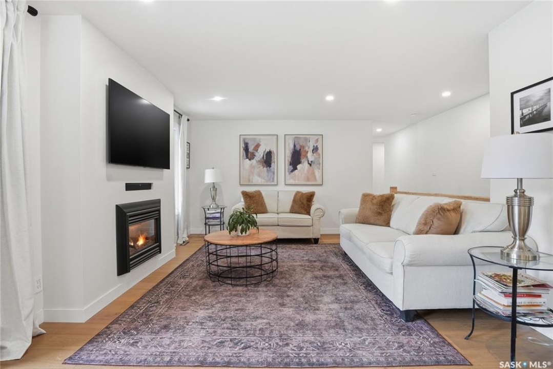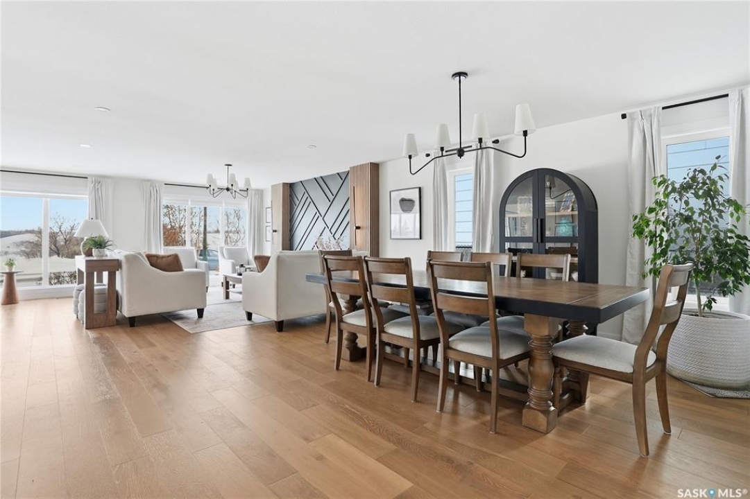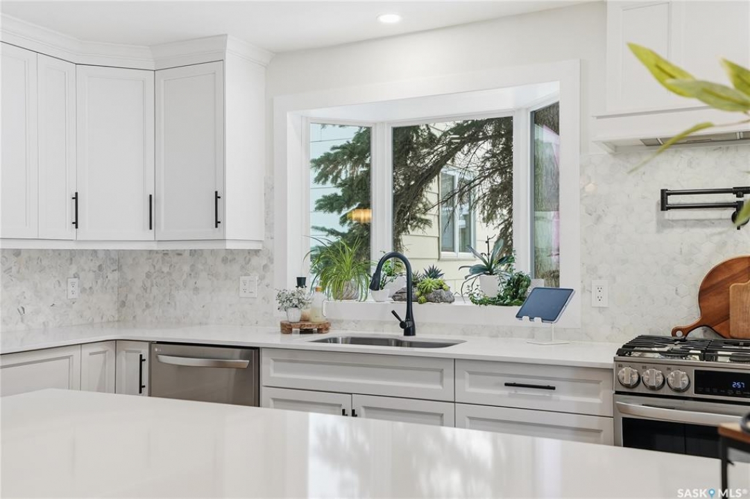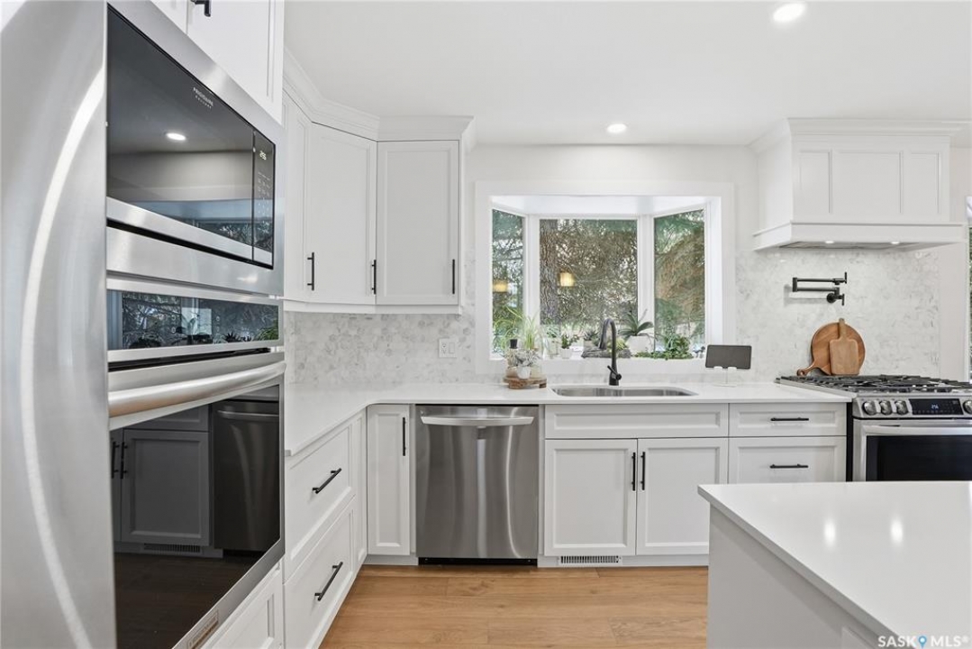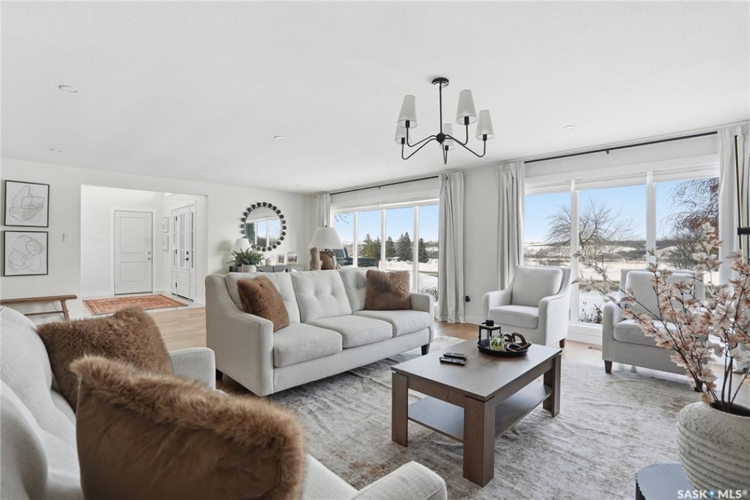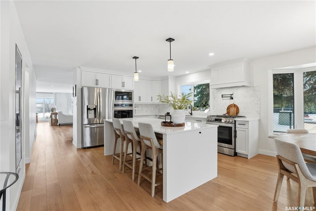 CHECK ON THE VIDEO ABOVE! Timeless style and exceptional craftsmanship define this stunning 2,691 sq. ft. bungalow in prestigious Lawson Heights, offering river views and overlooking Meewasin Trail. Welcome to 115 Whiteswan Drive, where a grand foyer with soaring ceilings creates an inviting first impression. Sun-filled living and dining areas showcase breathtaking views and feature a striking custom warm-toned wood feature wall with a sleek linear gas fireplace, ideal for both everyday living and entertaining. Beautiful new warm-coloured hardwood flooring flows throughout the main floor, enhancing the home's elegant, cohesive design. A private main-floor office with glass doors is perfect for working from home. The executive kitchen impresses with white cabinetry, an expansive island, quartz countertops, and a fully equipped butler's pantry with all new stainless steel appliances, including double refrigerators, double ovens, gas stove, beverage fridges, tall wine cooler, and warming oven—designed for hosting and convenience. The breakfast nook features a south-facing window seat, while the adjoining family room opens to outdoor living. The spacious primary bedroom (19' x 13') offers a large walk-in closet and a spa-like 5-piece ensuite. Two additional well-proportioned bedrooms share a 5-piece bath, along with rare main-floor storage and extra cabinetry. The newly fully developed lower level provides a wet bar, extra bedroom, bright 3-piece bathroom, gym/exercise space, and generous storage. Mechanical upgrades include a high-efficiency furnace and on-demand water heater. Enjoy breathtaking sunrise views from the front of the home, then unwind in a sun-filled, private backyard retreat featuring a privacy wall, stamped concrete patio, stunning brick fireplace, tranquil water fountain, lush landscaping, brand new fencing, and a shed—a truly secluded oasis.