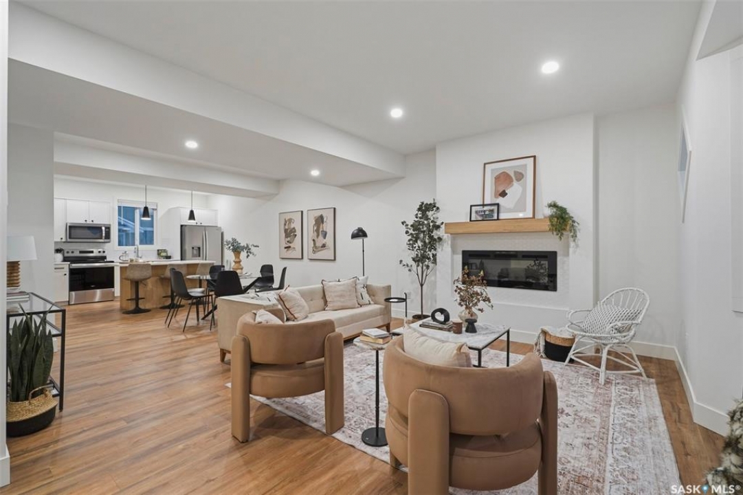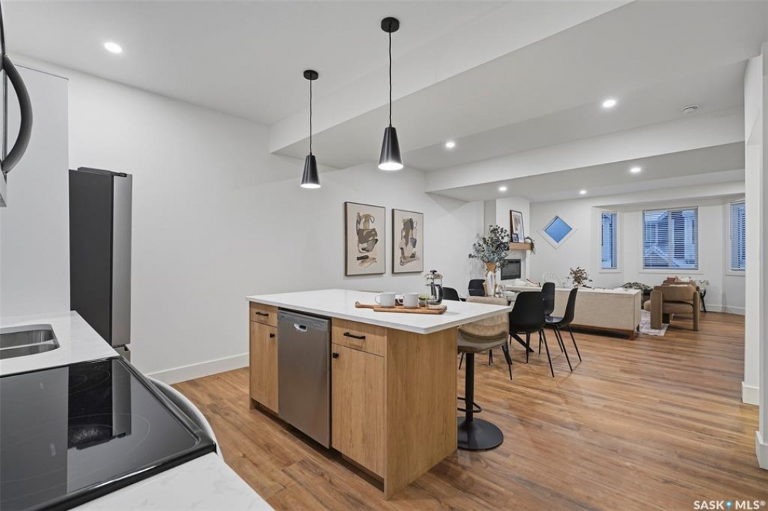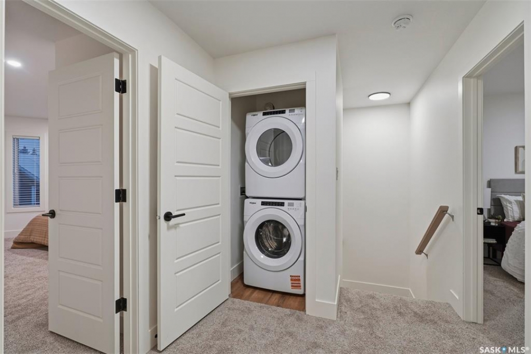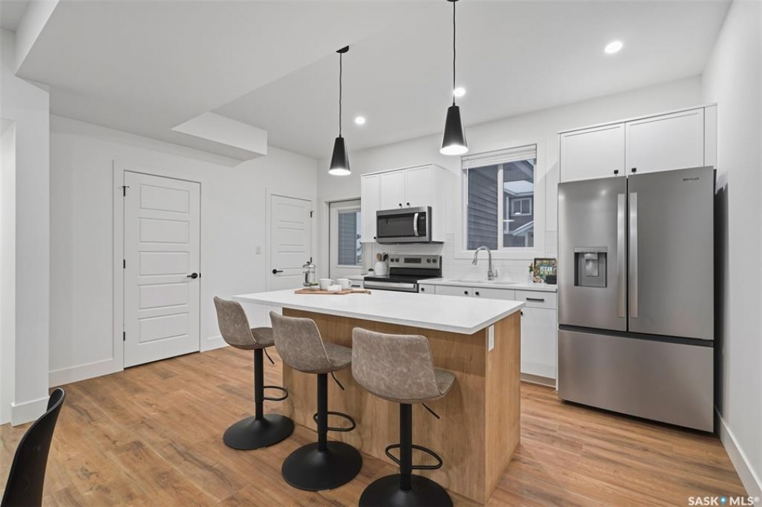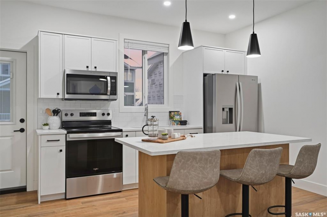 Welcome to 135–3220 11th Street West. A brand new, end unit, contemporary 3-storey townhouse offering the perfect blend of style, comfort, and functionality. Designed with modern living in mind, this home features an attached 2-car tandem style garage with a single drive and over 1,400 sq. ft. of thoughtfully designed space. Step inside to a bright and open second floor featuring 9 ft. ceilings, a spacious living and dining area, and a beautifully finished kitchen with quartz countertops, soft-close cabinetry, tiled backsplash, and a patio door to your balcony. A convenient 2-piece bath completes this level. Upstairs, the third floor offers a well-planned layout with 3 bedrooms and 2 full bathrooms, including a primary suite with a walk-in closet and beautiful ensuite. The additional 4-piece bath and laundry area are ideally located on the same floor for everyday convenience. Enjoy the practicality of a slab foundation providing durability and low maintenance, along with the peace of mind that comes with new construction. Located in the desirable Montgomery Place area, this development offers quiet residential living with quick access to Circle Drive, shopping, and amenities. Whether you're a first-time buyer, young professional, or investor, this home checks all the boxes for modern, low-maintenance living. Please note: photos are of a similar unit and the interior photos are virtually staged. This home will be move in ready mid to end of March 2026.