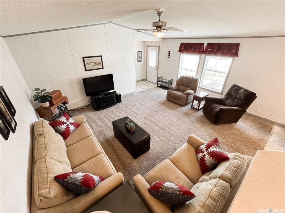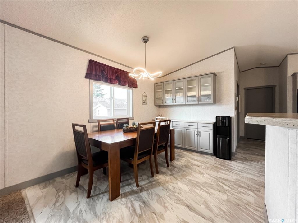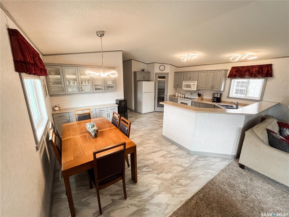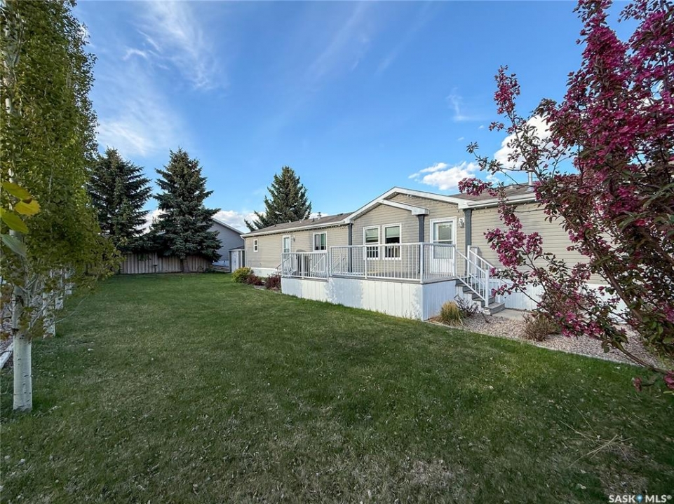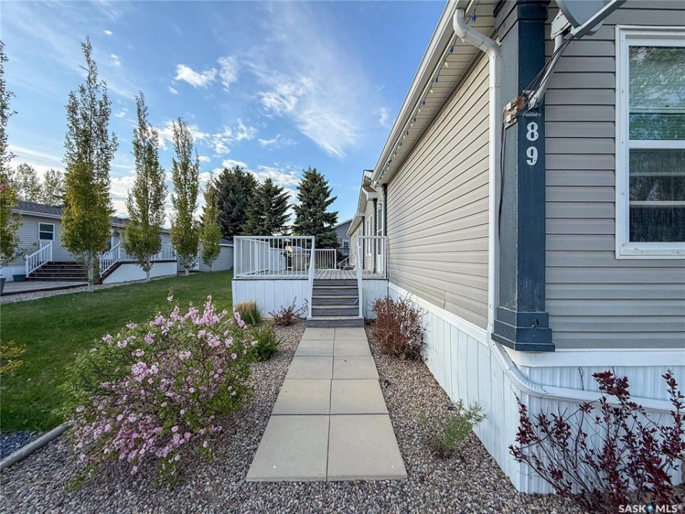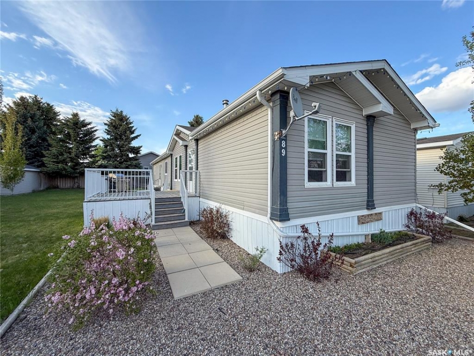 Welcome to 89 Prairie Sun Court! This fabulous 1,520 sqft modular home offers a bright, open-concept layout with a vaulted ceiling, that's perfect for families or anyone craving spacious, single-level living. Step inside, you're greeted by the open concept living room, dining area & kitchen offering updated carpet & vinyl plank(2018) throughout. Flooded w/ natural light & enhanced by newer, modern light fixtures, this space feels as bright & inviting as it is functional. You'll be amazed at the large pantry & incredible amount of cupboard space (full wall in dining area), especially for a modular home. Whether it's everyday meals or hosting friends & family, this kitchen is designed to impress! Now, let's talk about the primary bedroom! It's tucked away on the north side for extra privacy & features a generously sized closet & an amazing 5-piece ensuite w/ his-and-hers sinks, a jacuzzi tub/shower combo & linen closet. The other 2 bedrooms are spacious - both offering ample closet space. This home is packed w/ practical perks too: energy-efficient double-pane PVC windows, central air conditioning, a new water heater(2025) & a water softener. Next, the laundry room—complete w/ a storage closet & features a handy secondary entrance leading straight to the backyard. The two-tier deck is made for BBQs, or simply unwinding while taking in a stunning sunset. There's even a storage shed included in the sale to keep all your tools & toys organized. Worth noting - the skirting has been spray foam insulated in the past 3 years, so floors inside stay extra warm. Additionally, the park fees include water, and the property taxes are incredibly affordable at just $35 per month. Don't miss out on this incredible opportunity to own an affordable home in a wonderful neighbourhood on the outskirts of Swift Current.