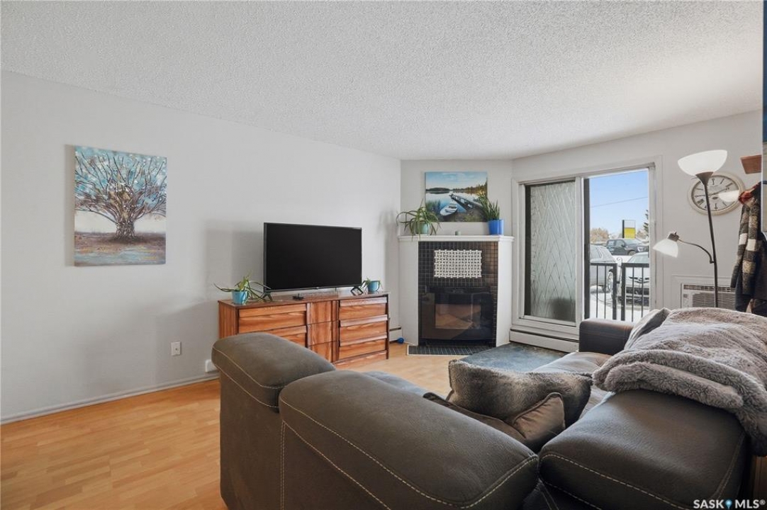Welcome home to this sunny, ground-floor end unit condo offering 3 bedrooms and 1 bath, designed for easy, comfortable living. Natural light fills the space, highlighting a renovated kitchen with updated tile flooring and backsplash, and a renovated bathroom with modern tile, a contemporary vanity, and a tiled tub surround. The cozy electric fireplace creates a welcoming atmosphere—perfect for relaxing at the end of the day. In-unit laundry adds everyday convenience. Step outside to your own private balcony, an ideal spot for morning coffee or fresh air. You'll also appreciate the attached storage shed, providing extra space for bikes, seasonal items, and outdoor gear. Enjoy the simplicity of ground-level living with no stairs and easy access for groceries and daily errands. Located in the Dundonald neighbourhood and situated on a bus route, this well-managed complex offers peace of mind with a strong reserve fund, while heat and water are included in the condo fees for predictable monthly costs. Close to shopping, schools, and everyday amenities, this home also includes an electrified parking stall. Bright, move-in ready, and easy to love—this is a place that truly feels like home.
