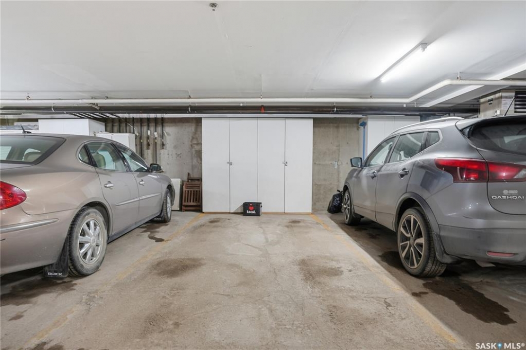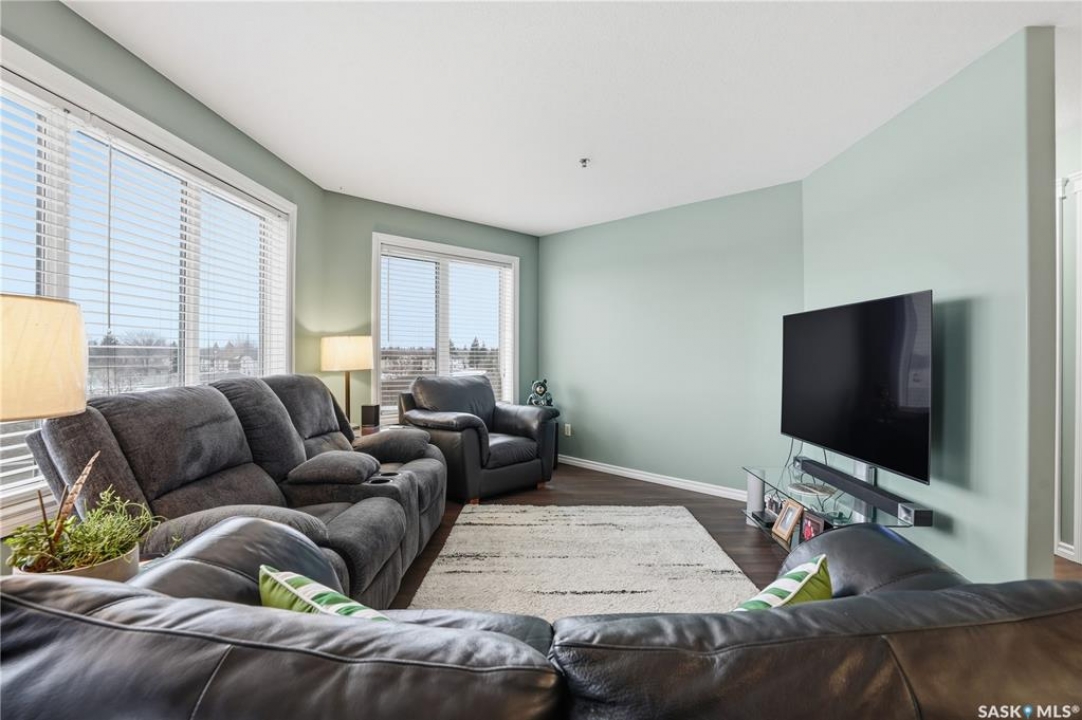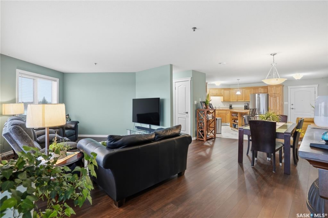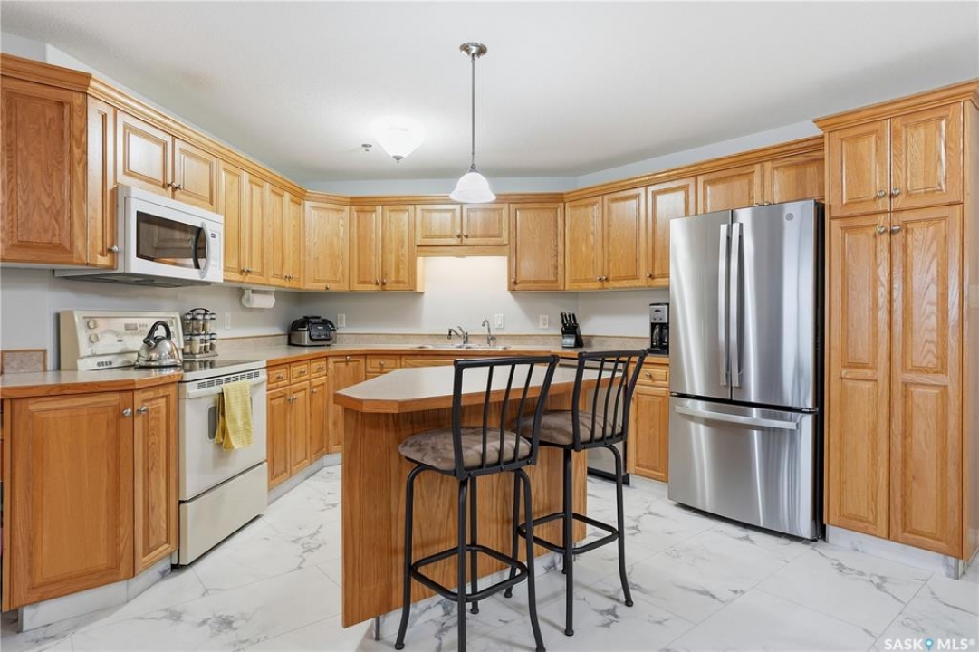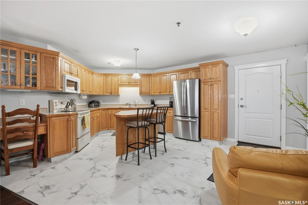 Schools, recreation, leisure and services surround Meadow Park Place in Regina's east end. If you're looking for a secure, well-cared-for home that offers a lifestyle of ease, this 3rd-floor condo is a must-see. It's open-concept, move-in ready, and designed for comfortable living. The modern kitchen is a standout, featuring plenty of counter and cupboard space, updated appliances, a built-in pantry, and a large sit-up island. The living and dining areas flow seamlessly with modern flooring, leading out to a covered, southeast facing balcony through a garden door. In the primary bedroom, you'll find a convenient walk-through closet leading to a 3-piece ensuite with a sit-down shower. The unit also includes a second good-sized bedroom, a 4-piece main bathroom, and a laundry/storage room. You'll love the convenience of your own parking stall in the underground parking garage. The building offers a common room with a kitchen, pool table, and shuffleboard that is rentable for gatherings. Condo Fees include common area insurance, maintenance, garbage, lawn care, snow removal, water, sewer, and reserve fund. This might be the right home for you, call your agent today to view.