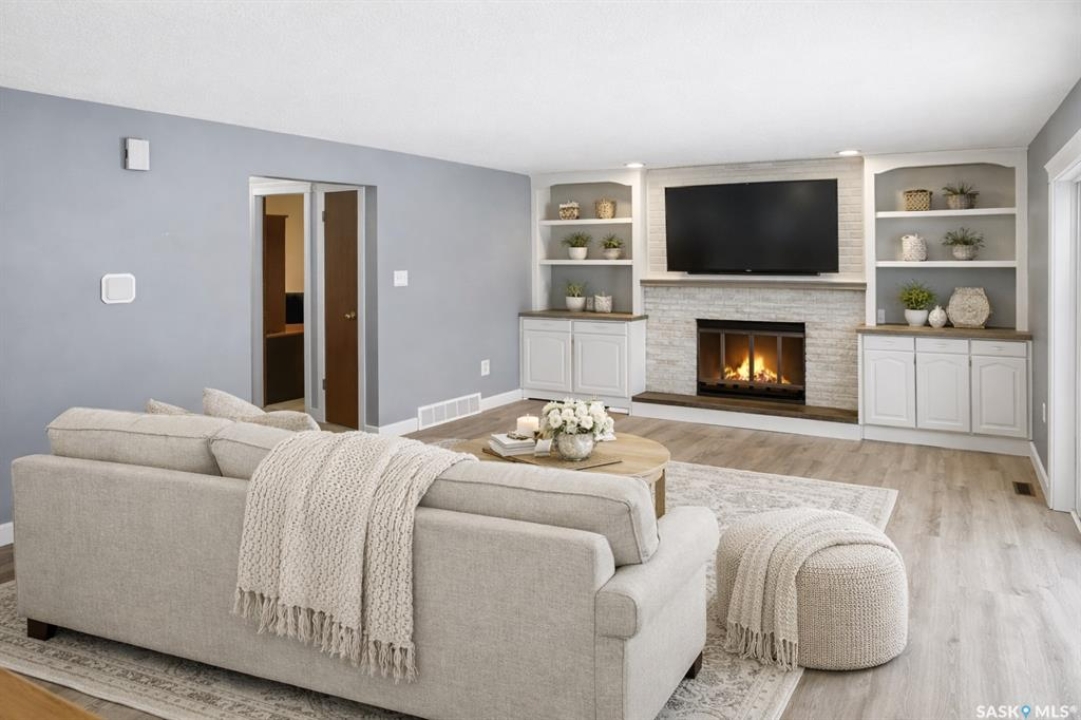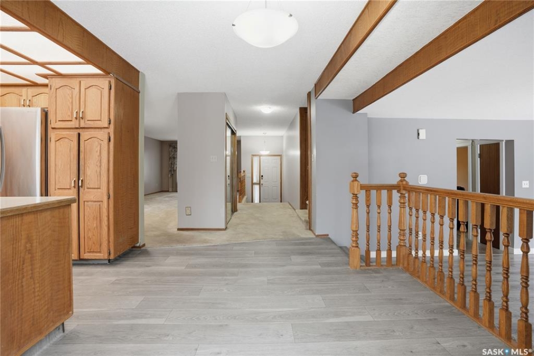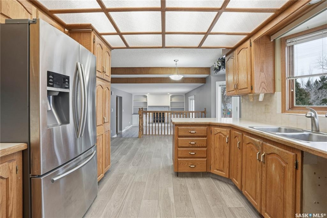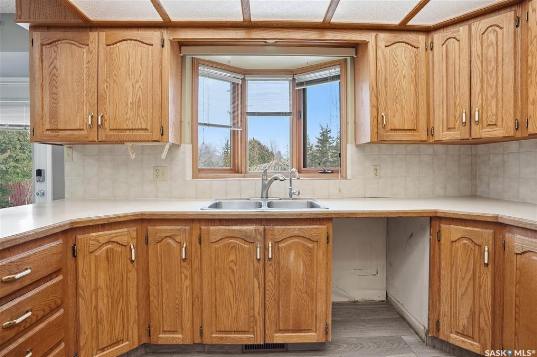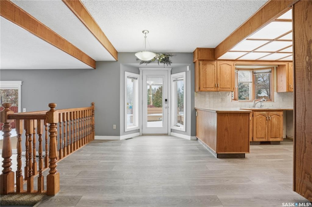 Have you been searching for a park-backing home in the desirable Varsity Park neighbourhood, just steps from Hawrylak Elementary School and scenic walking paths? Offering 2,260 sq. ft. of living space, this two-storey split features an incredible layout and the opportunity to transform it into the home of your dreams. The home welcomes you with excellent curb appeal and a spacious front entrance that opens to a bright formal living room and adjoining formal dining area. The U-shaped oak kitchen offers a pantry and a window overlooking the backyard, plus a second dining space with patio doors leading to the fully fenced yard backing the park. A few steps down, the cozy family room is anchored by a charming wood-burning fireplace—perfect for relaxing evenings and an additional set of patio doors to the backyard. The main floor also includes a versatile bedroom or office, a 2-piece bathroom with laundry, and direct access to the double attached garage. Upstairs you'll find four generously sized bedrooms and a full bathroom. The primary suite overlooks the backyard and features a 3-piece ensuite and a 6' x 6'9" walk-in closet. The fully developed basement provides even more space with a large rec room, a sixth bedroom (window does not meet egress), a 3-piece bathroom, cold storage, and an outstanding amount of additional storage in the utility room. A rare opportunity in a sought-after family neighbourhood—close to schools, parks, and amenities—this home is ready for its next chapter.
