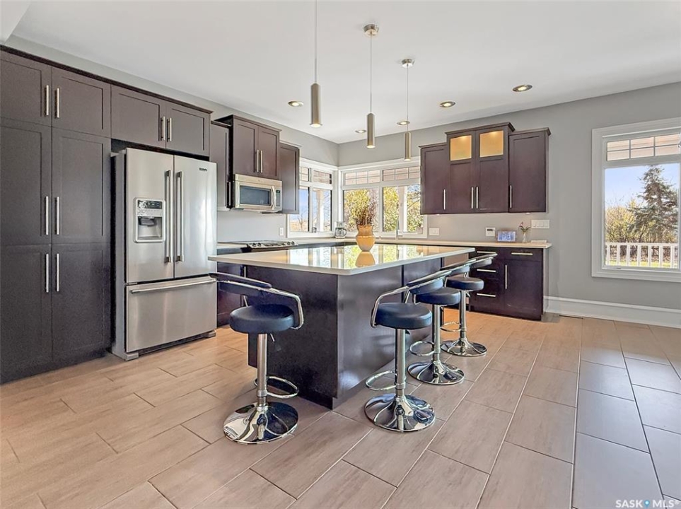Discover an exquisite blend of privacy and convenience with this luxurious "in city" acreage. Nestled on the eastern edge of the city, this picturesque 1.5-acre property is enveloped by a lush shelter belt and bordered by a serene creek, offering stunning views. The craftsman-style home exudes charm with its elegant wraparound veranda, second-story dormers, and expansive windows that flood the interior with natural light.Upon entering, you'll be greeted by a graceful staircase leading to the second floor. To one side is a sitting room, the other side hosts a fully renovated eat-in kitchen and dining area. The kitchen features rich cabinetry, Stone countertops, a large island with seating, and SS appliances, all overlooking the beautiful yard. The main floor also includes a bedroom/office, a newly renovated bathroom, and a large laundry room that connects to the breezeway and a heated double car garage.The second floor boasts a charming bonus room with open-beam construction and a balcony overlooking the yard. Two additional bedrooms and a guest bath are located in the opposite wing. The master suite is a true highlight, featuring window seats, a closet spanning the entire wall, a private balcony, and a newly renovated five-piece en suite with a standalone tub and walk-in shower.The lower level offers a large family room, a fifth bedroom, a renovated three-piece bathroom, and an oversized utility/storage room. The home equipped with a zoned furnace(2024), two water heaters (one dedicated to floor heating in the garage and kitchen), central air and shingles installed(8 years ago). Additional updates include vinyl siding, triple-pane PVC windows, fresh paint throughout, and updated trim. The property is connected to city power and water, with a newly replaced septic tank and pump.Outside, the veranda leads to a fully enclosed hot tub room with panoramic windows. The property also includes an additional shop, a cozy fire pit area, and an additional back deck.