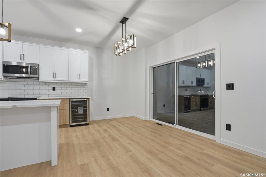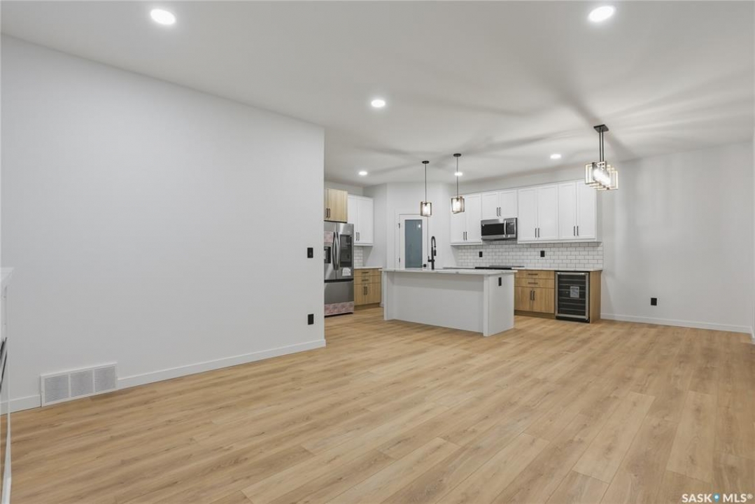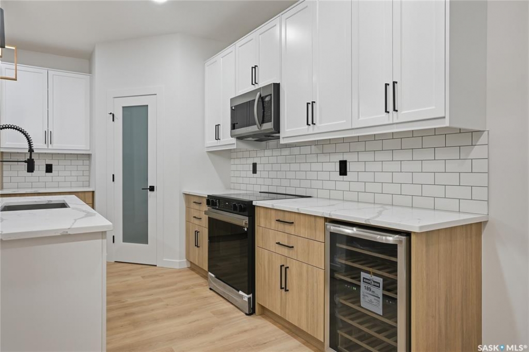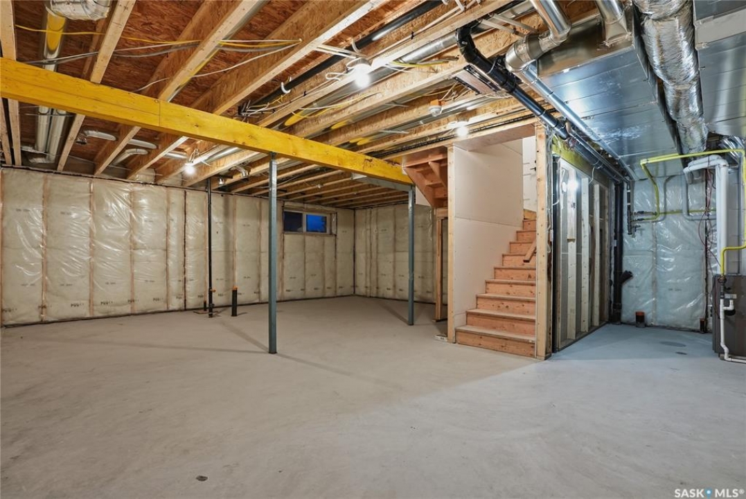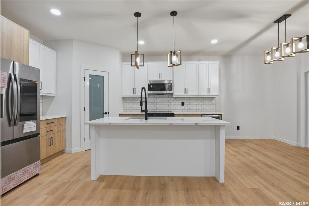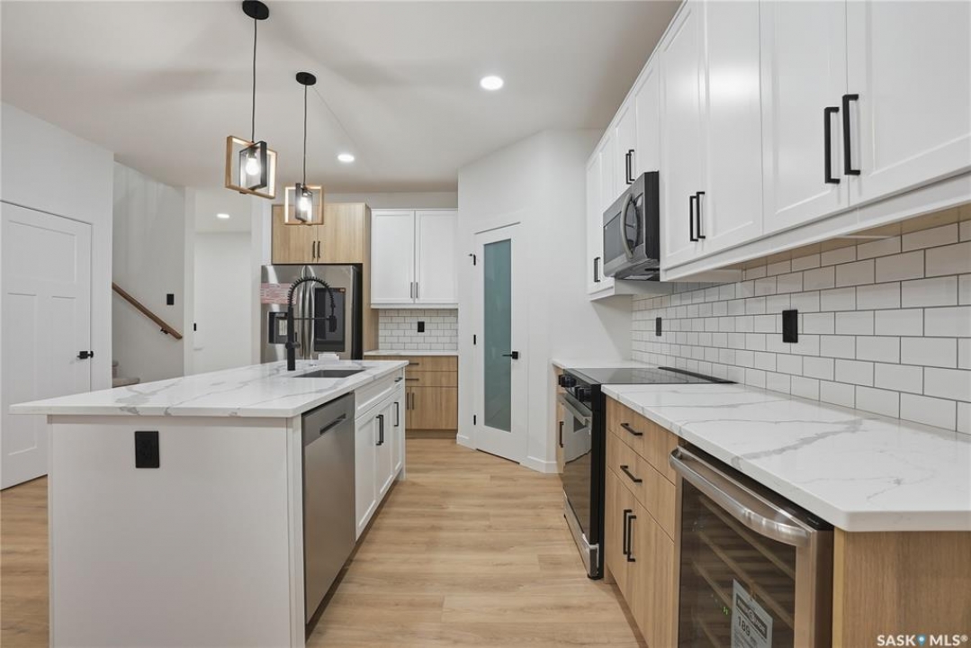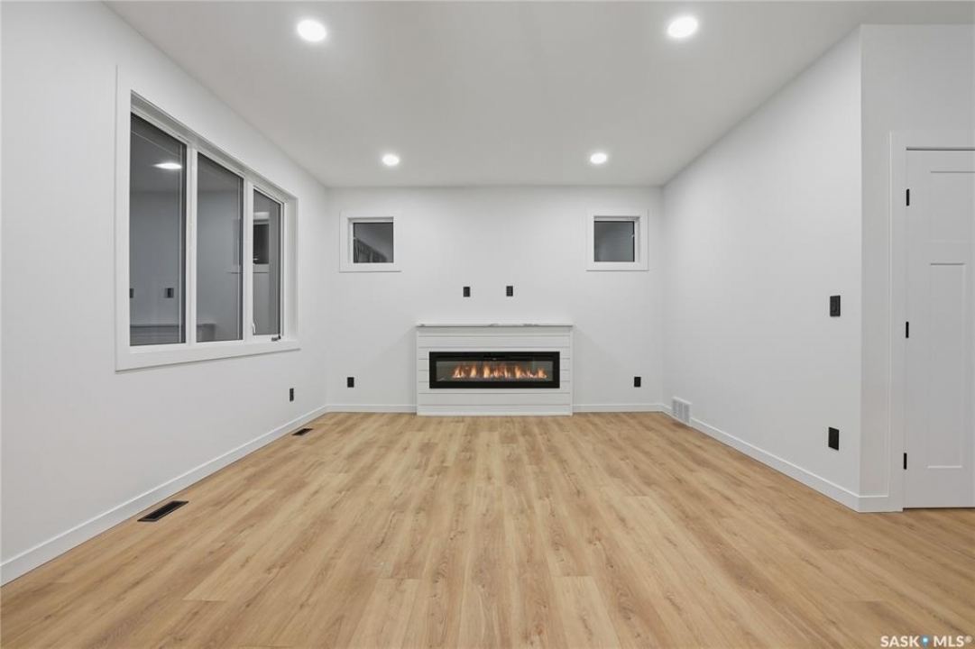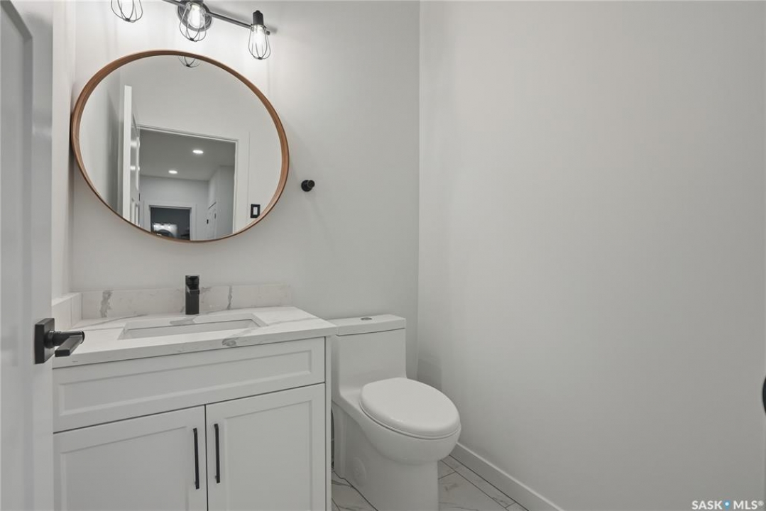 Welcome to refined living in the prestigious community of Brighton, one of Saskatoon's most desirable and architecturally stunning neighbourhoods. This impeccably crafted 1,875 square foot executive two-storey home offers sophisticated design, premium finishes, and exceptional investment potential. The main level features an elegant open-concept layout anchored by a striking contemporary fireplace and a designer-inspired chef's kitchen, complete with quartz countertops, upgraded stainless steel appliances, and a built-in beverage fridge — perfect for entertaining. Upstairs, you'll find a spacious bonus room, three beautifully appointed bedrooms, and a spa-inspired primary retreat featuring a luxurious five-piece ensuite with dual vanities, a walk-in glass shower, and a deep soaker tub. The double attached garage, concrete driveway, finished front landscaping, and private side entrance to the lower level elevate both convenience and long-term value. With the potential for a legal two-bedroom suite and eligibility for the Saskatchewan Secondary Suite Incentive, this home offers incredible income opportunity. Luxury. Functionality. Investment potential. This is elevated living in Brighton. Book your private tour today. GST/PST included in the purchase price with the rebate to builder. Saskatchewan New Home Warranty.